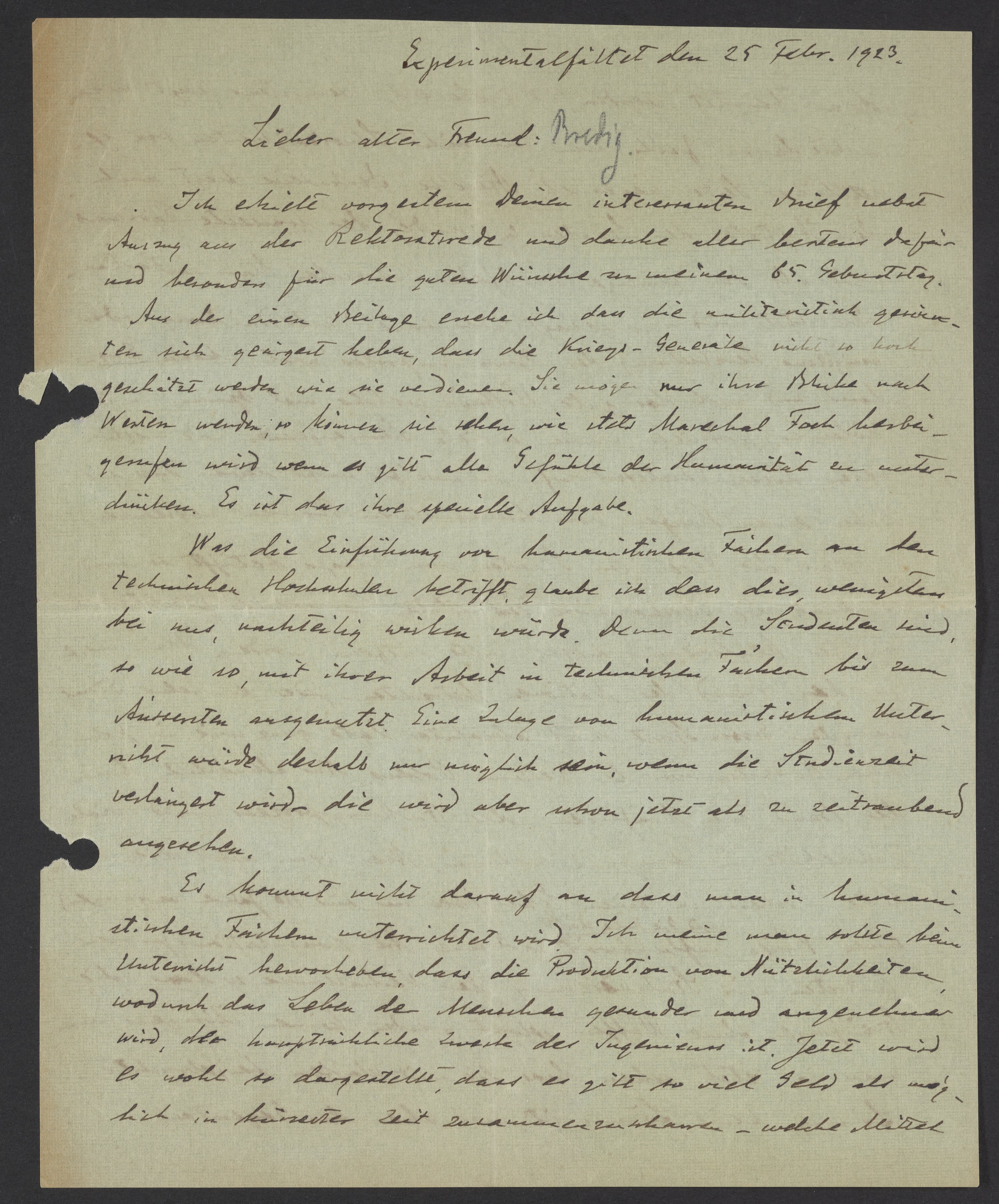 The day before yesterday, I received your interesting letter along with an excerpt from the Rector's speech. Thank you very much for these, especially for the good wishes on the occasion of my 65th birthday. From the one enclosure, I can see how individuals who support the military are annoyed that the war generals are not as highly regarded as they deserve. They only have to turn their gaze westward to see how Marshal (Ferdinand) Fock is called in to suppress all notions of humanity. That is their express purpose.