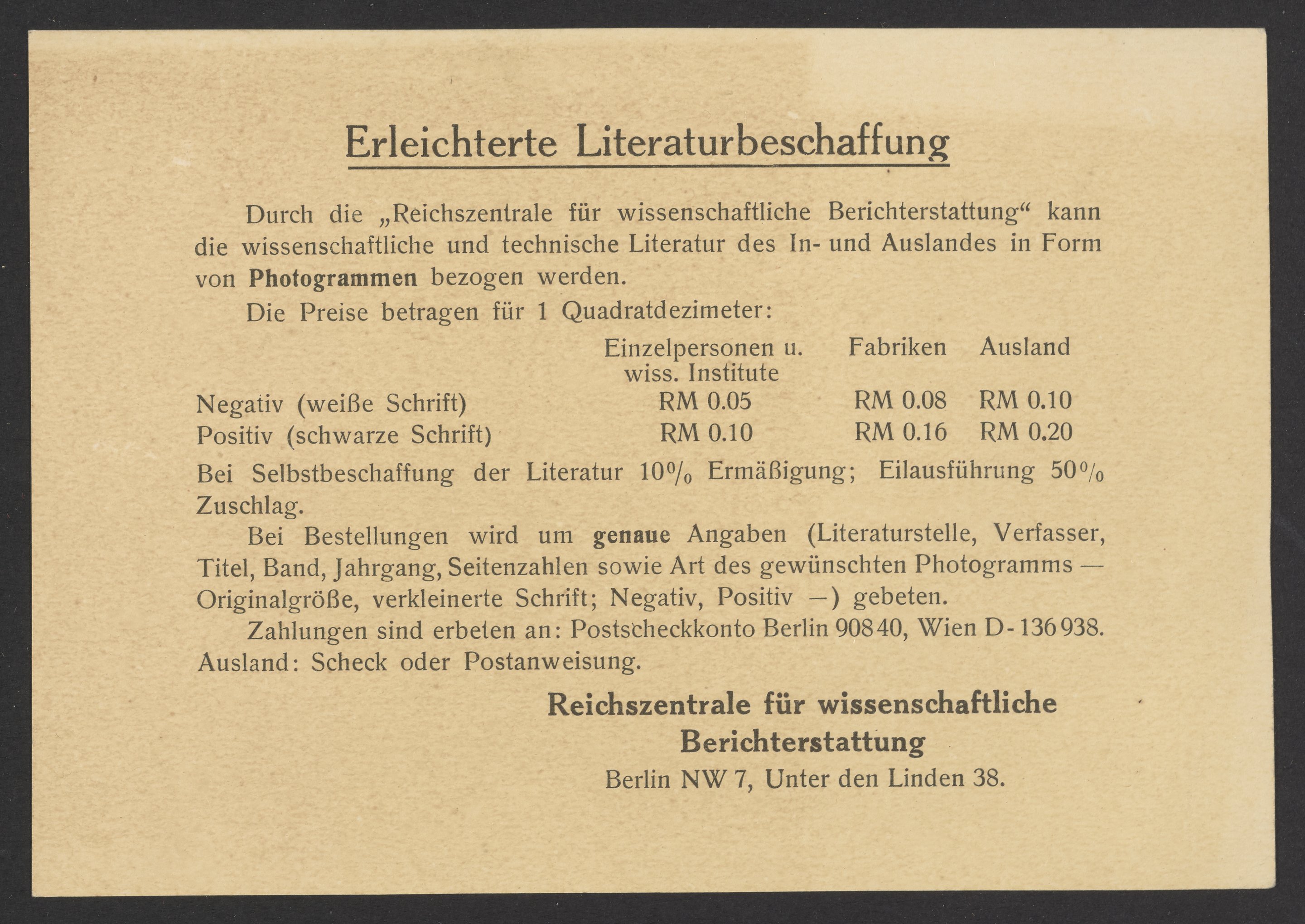 Reichszentrale für wissenschaftliche Berichterstattung. “Erleichterte Literaturbeschaffung.” Berlin, Germany, circa 1920. Papers of Georg and Max Bredig, Box 3, Folder 5. Science History Institute. Philadelphia. https://digital.sciencehistory.org/works/p6at84f.
