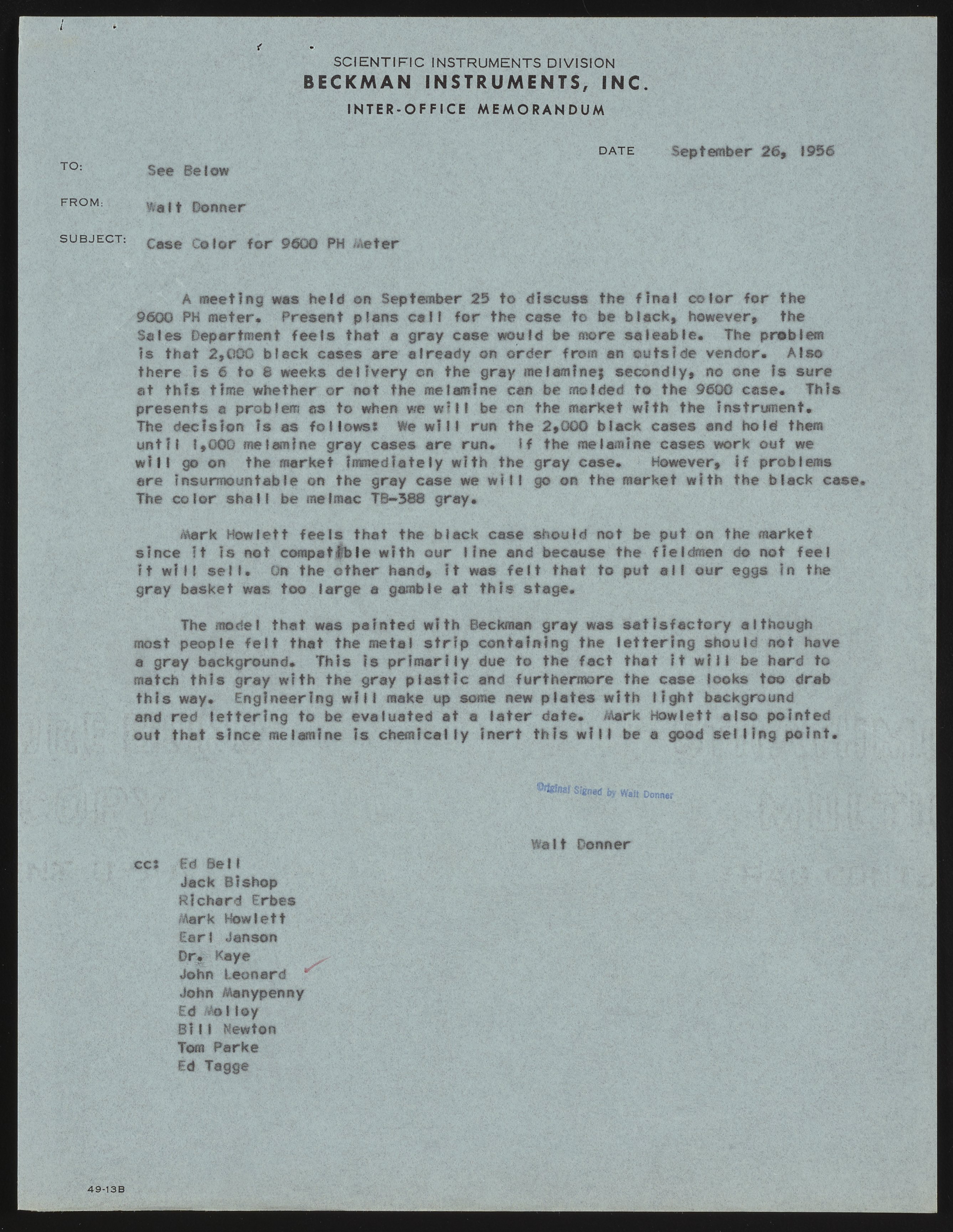 In this memo, Walter Donner discussed the color and material to be used for the Zeromatic's case.