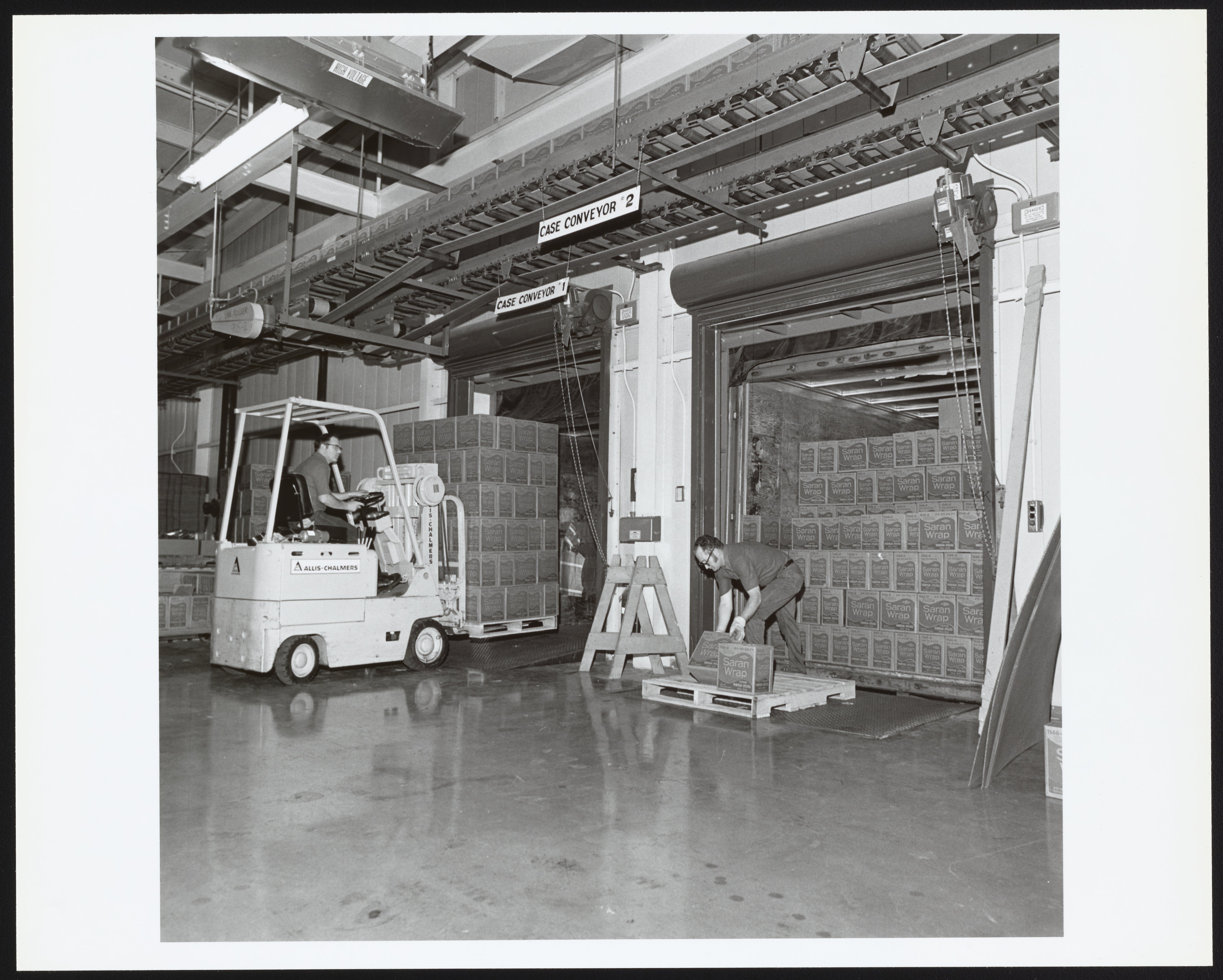 General view of two unidentified employees prepping cases of Saran Wrap for transport at a Dow Chemical Company manufacturing facility in Midland, Michigan. Initially developed for the U.S. Army to wrap arms and equipment for transport during World War II, saran plastic was subsequently developed and marketed as Saran Wrap for household use.