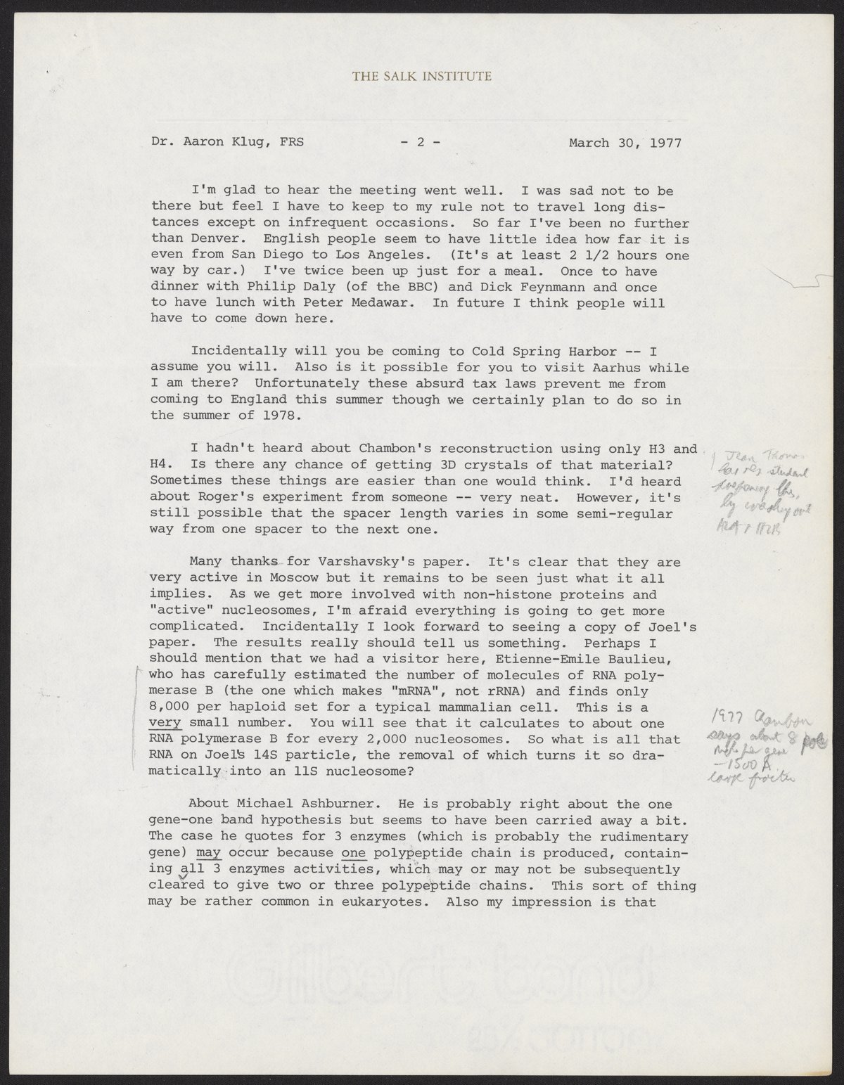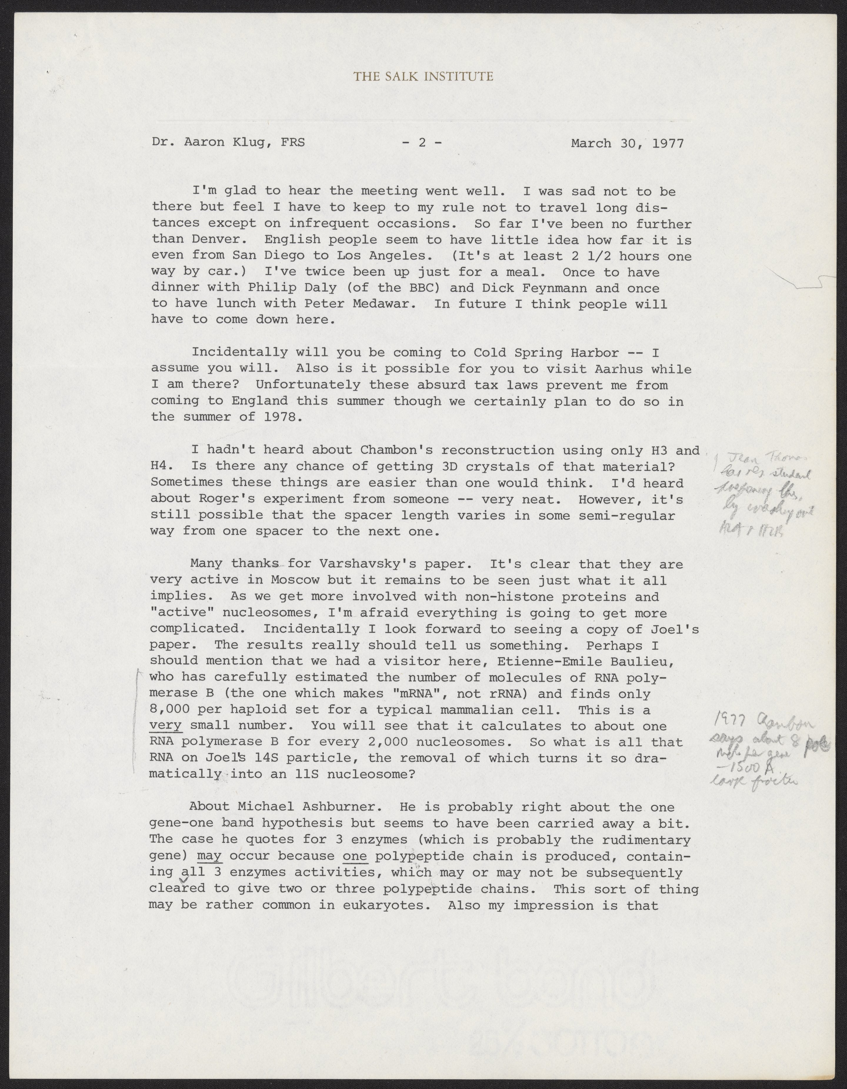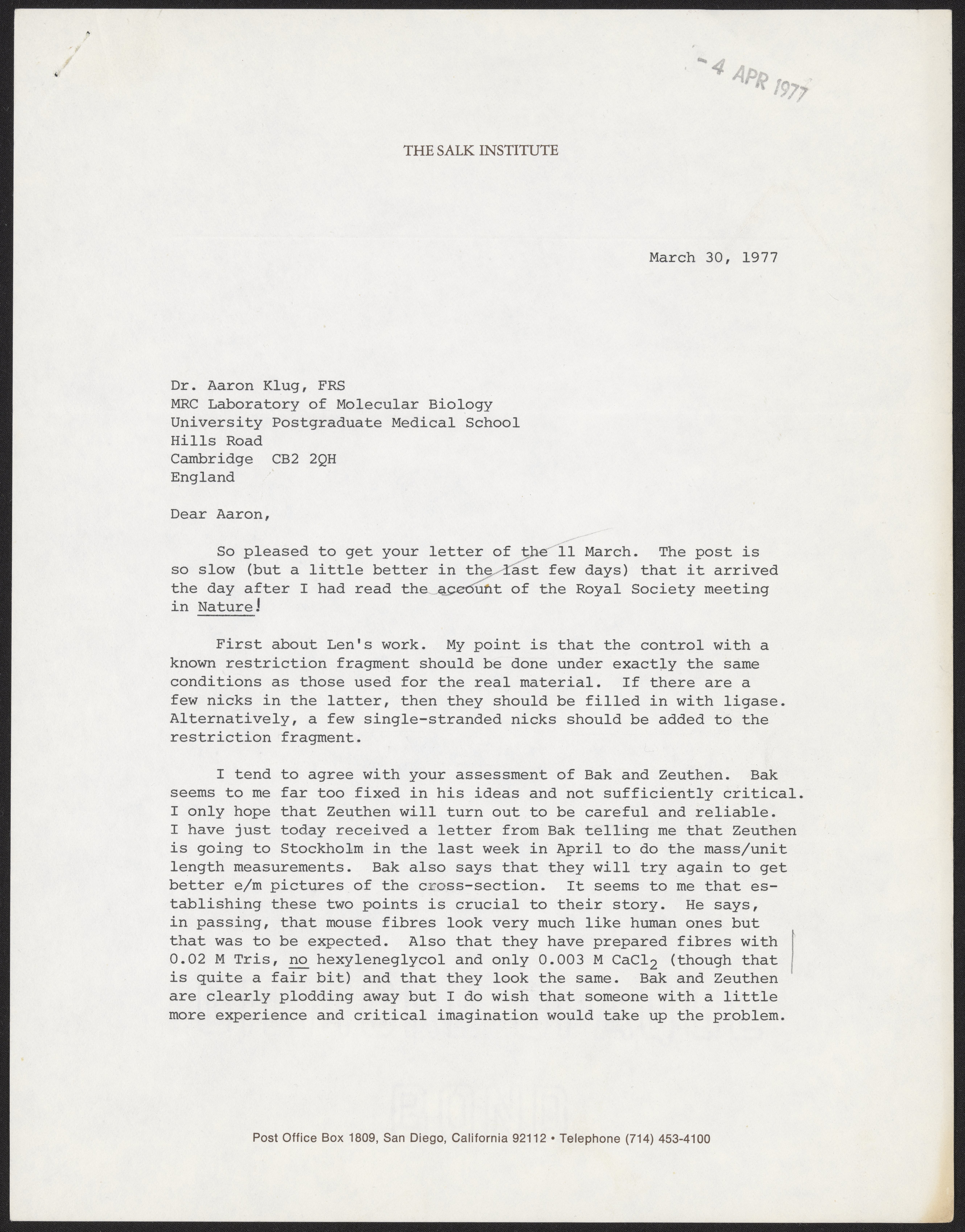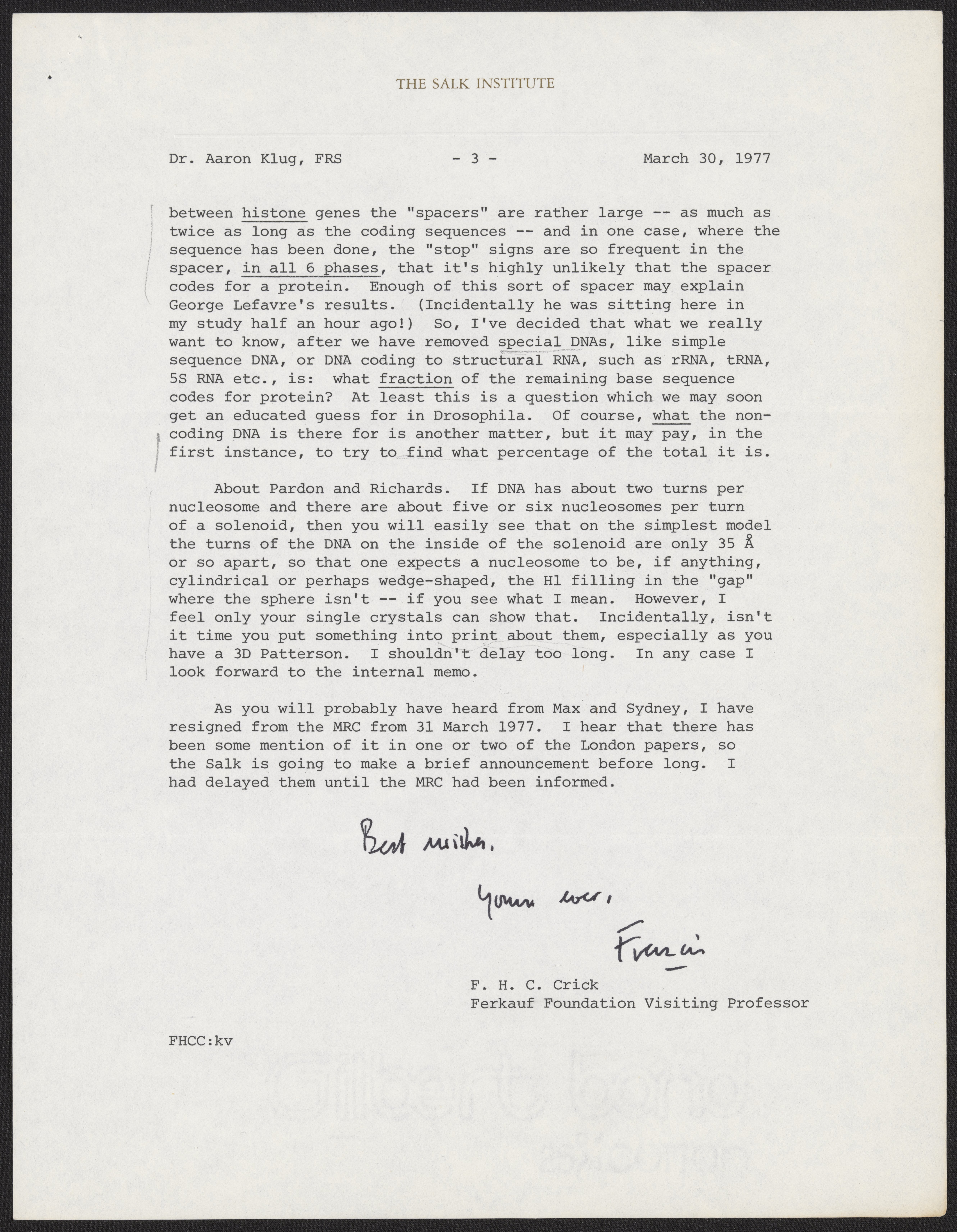Crick, Francis. “Letter from Francis Crick to Aaron Klug, March 30, 1977,” March 30, 1977. History of Molecular Biology Collection, Box 19, Folder 26. Science History Institute. Philadelphia. https://digital.sciencehistory.org/works/p8imcll.