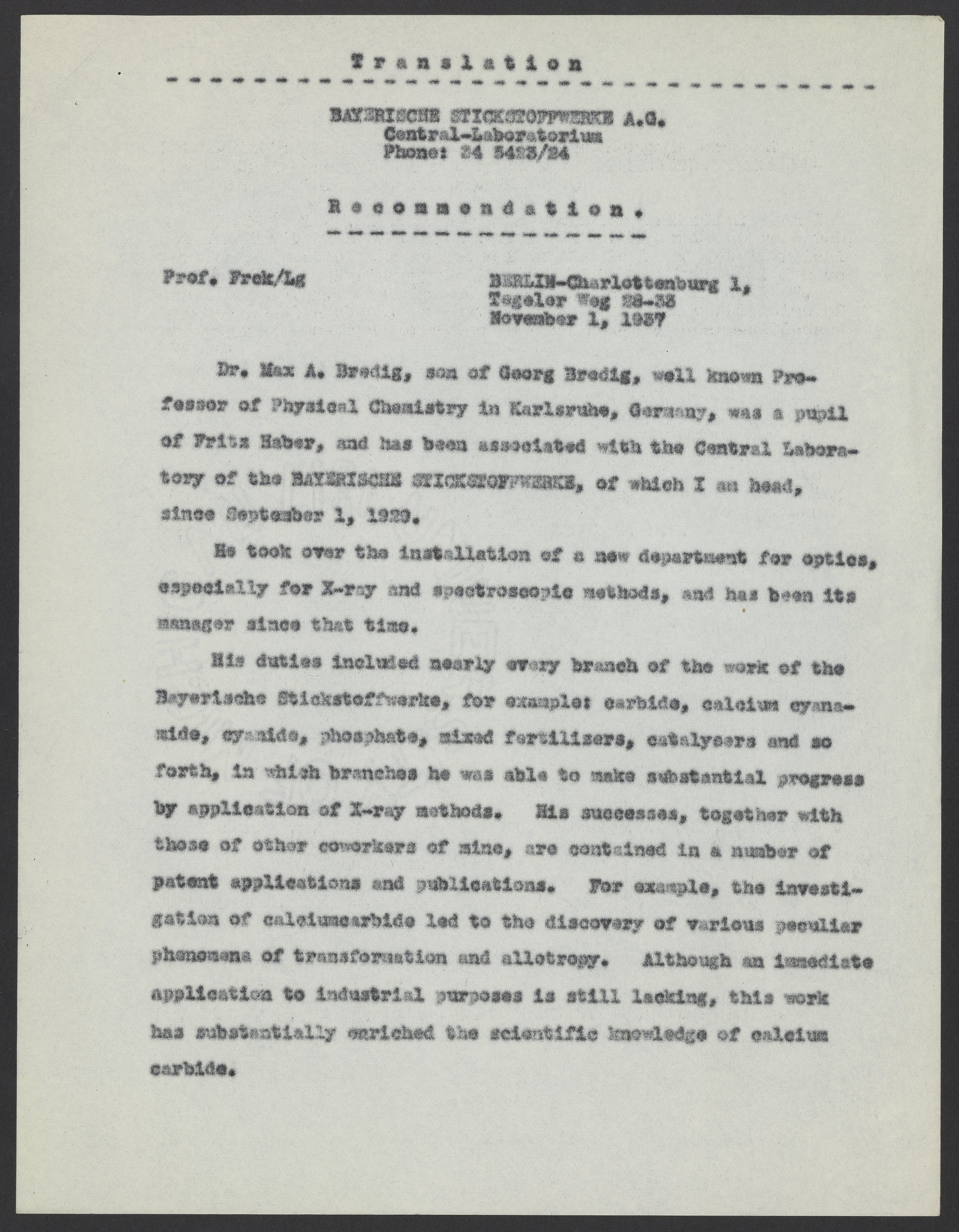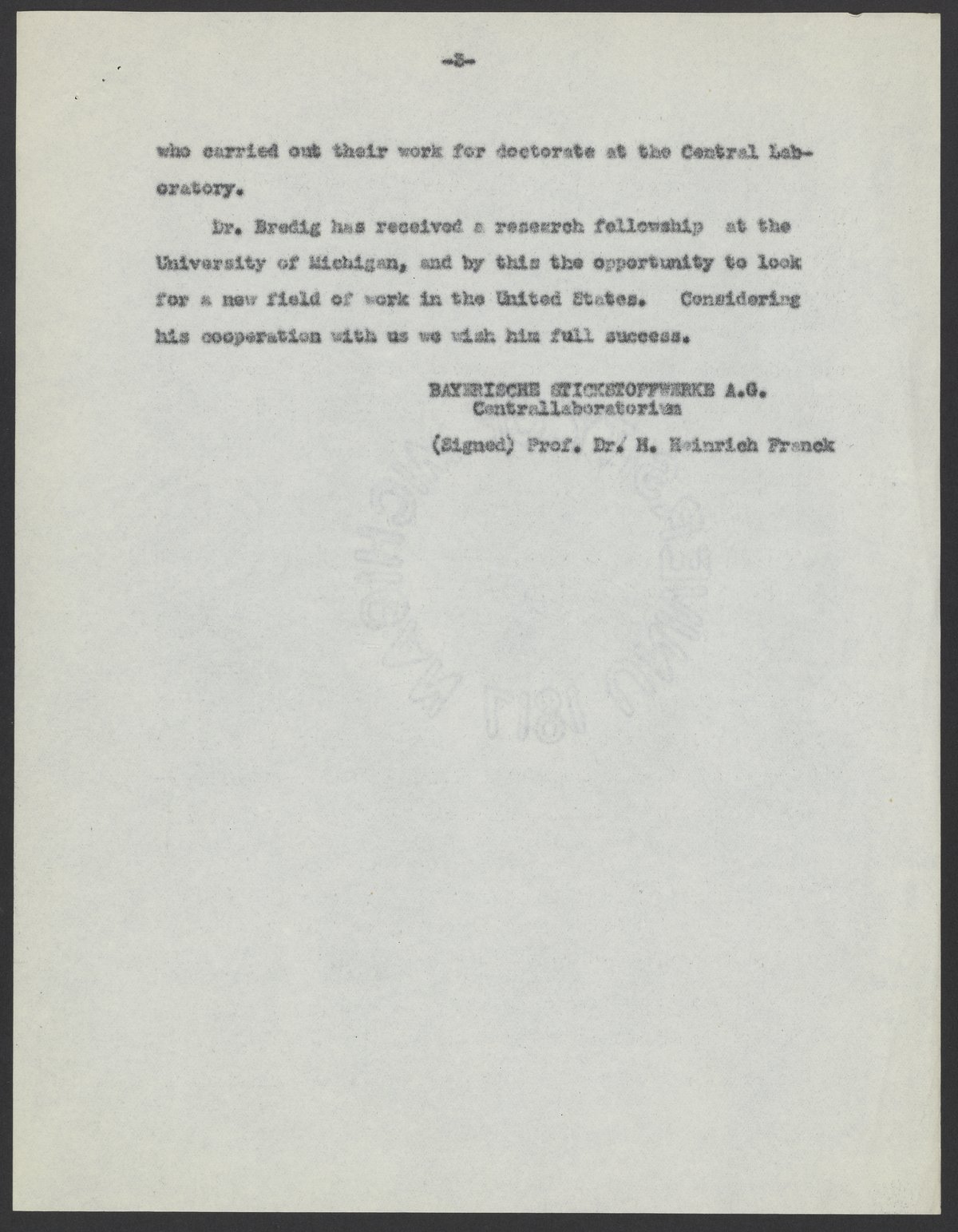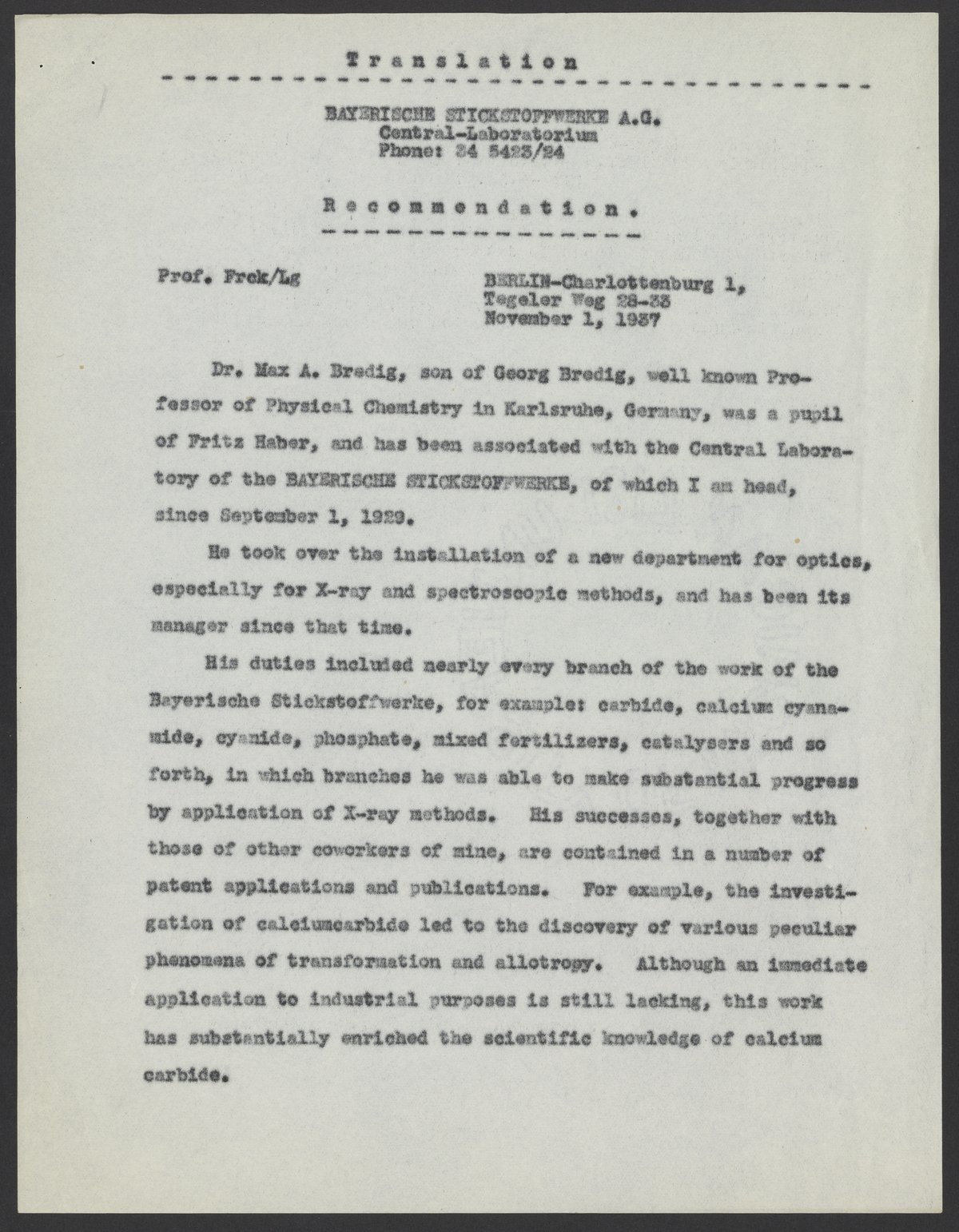 Small JPG1200 x 1541px — 276 KBLarge JPG2880 x 3698px — 1.8 MBFull-sized JPG5386 x 6916px — 6.3 MBOriginal fileTIFF — 5386 x 6916px — 107 MBLetter of recommendation for Max Albert Bredig (1902-1977) written by Hans Heinrich Franck (1888-1961). Franck was Bredig's supervisor at the Bavarian Nitrogen Works. The letter has been translated from German to English.