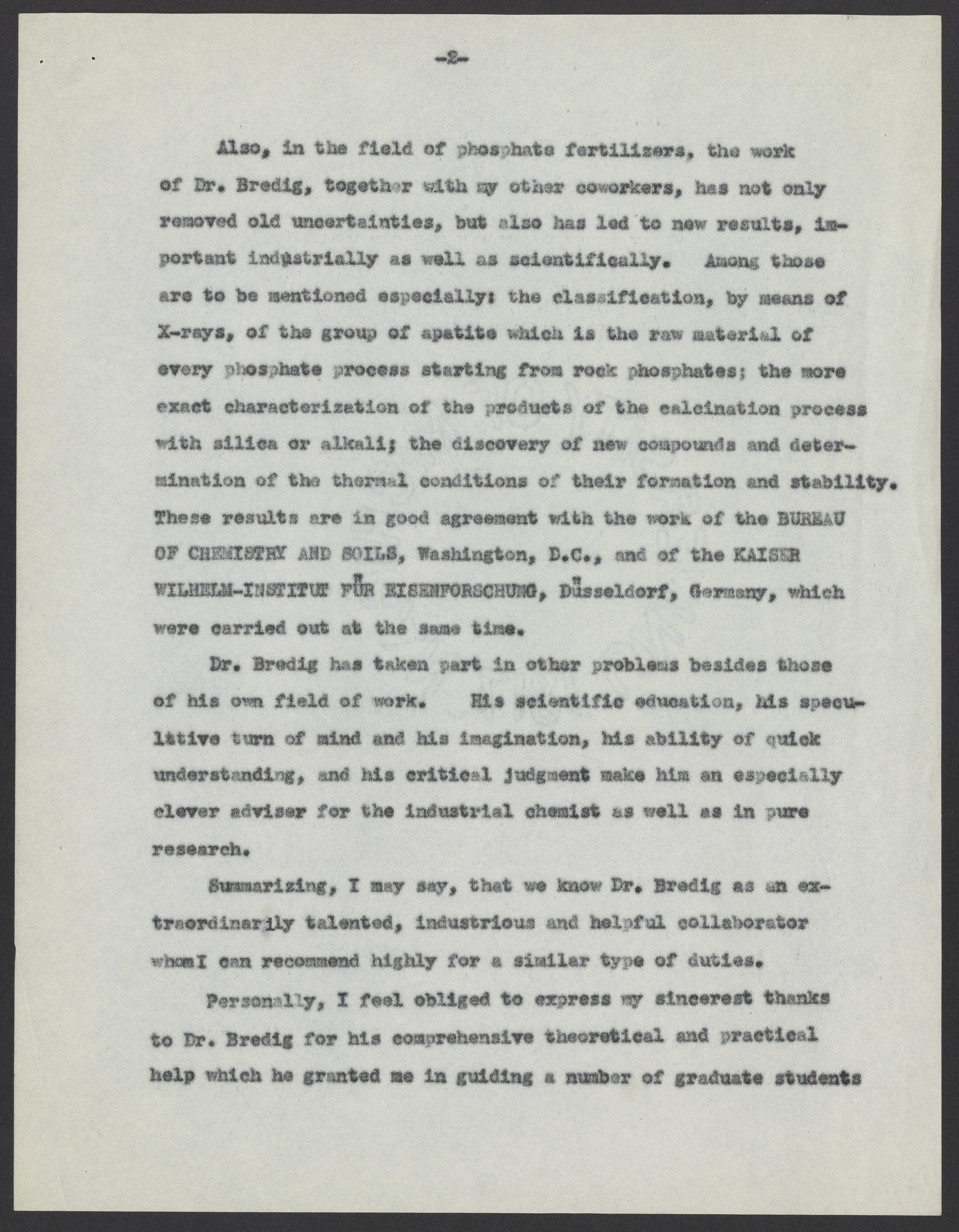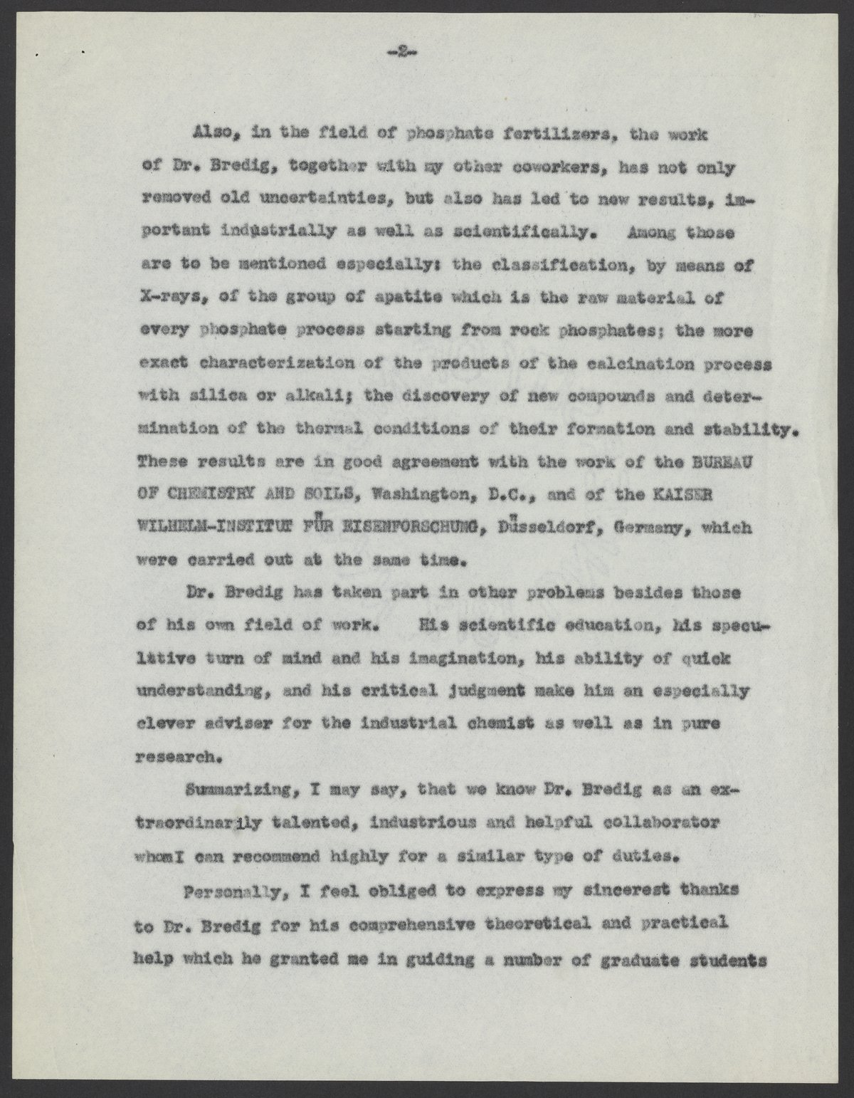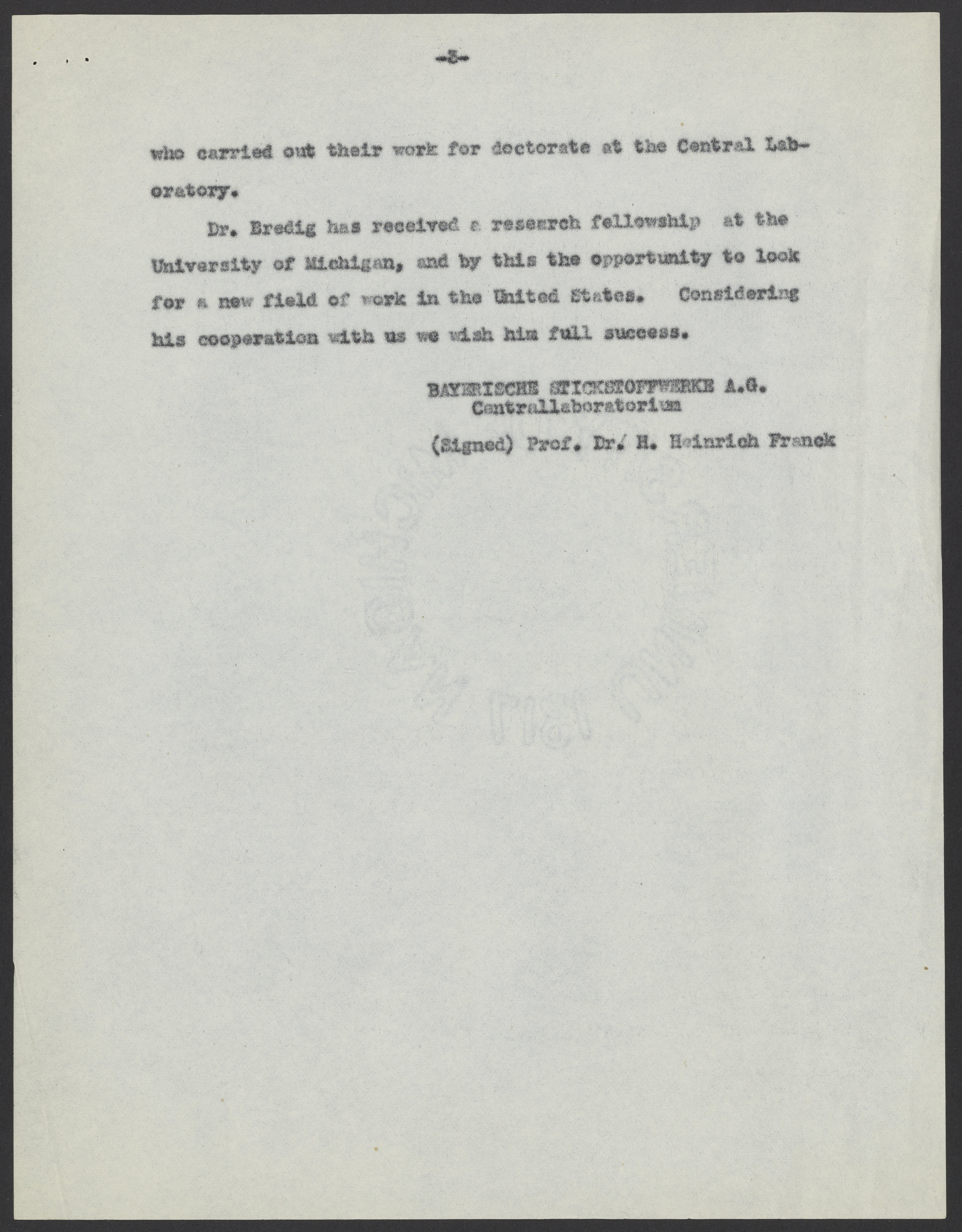 Small JPG1200 x 1541px — 276 KBLarge JPG2880 x 3698px — 1.8 MBFull-sized JPG5386 x 6916px — 6.3 MBOriginal fileTIFF — 5386 x 6916px — 107 MBLetter of recommendation for Max Albert Bredig (1902-1977) written by Hans Heinrich Franck (1888-1961). Franck was Bredig's supervisor at the Bavarian Nitrogen Works. The letter has been translated from German to English.