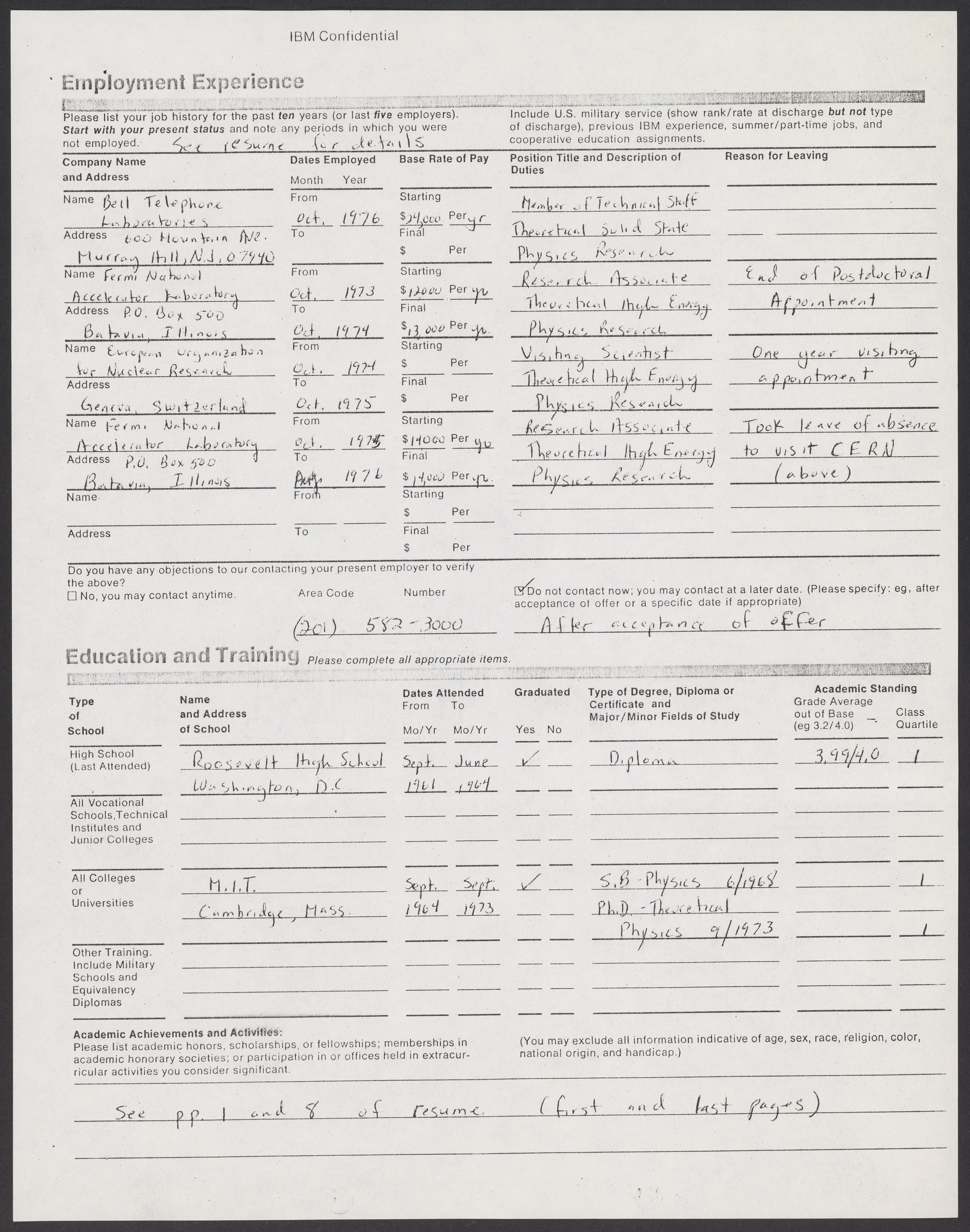 Shirley Ann Jackson's (1946-) application for employment at IBM.