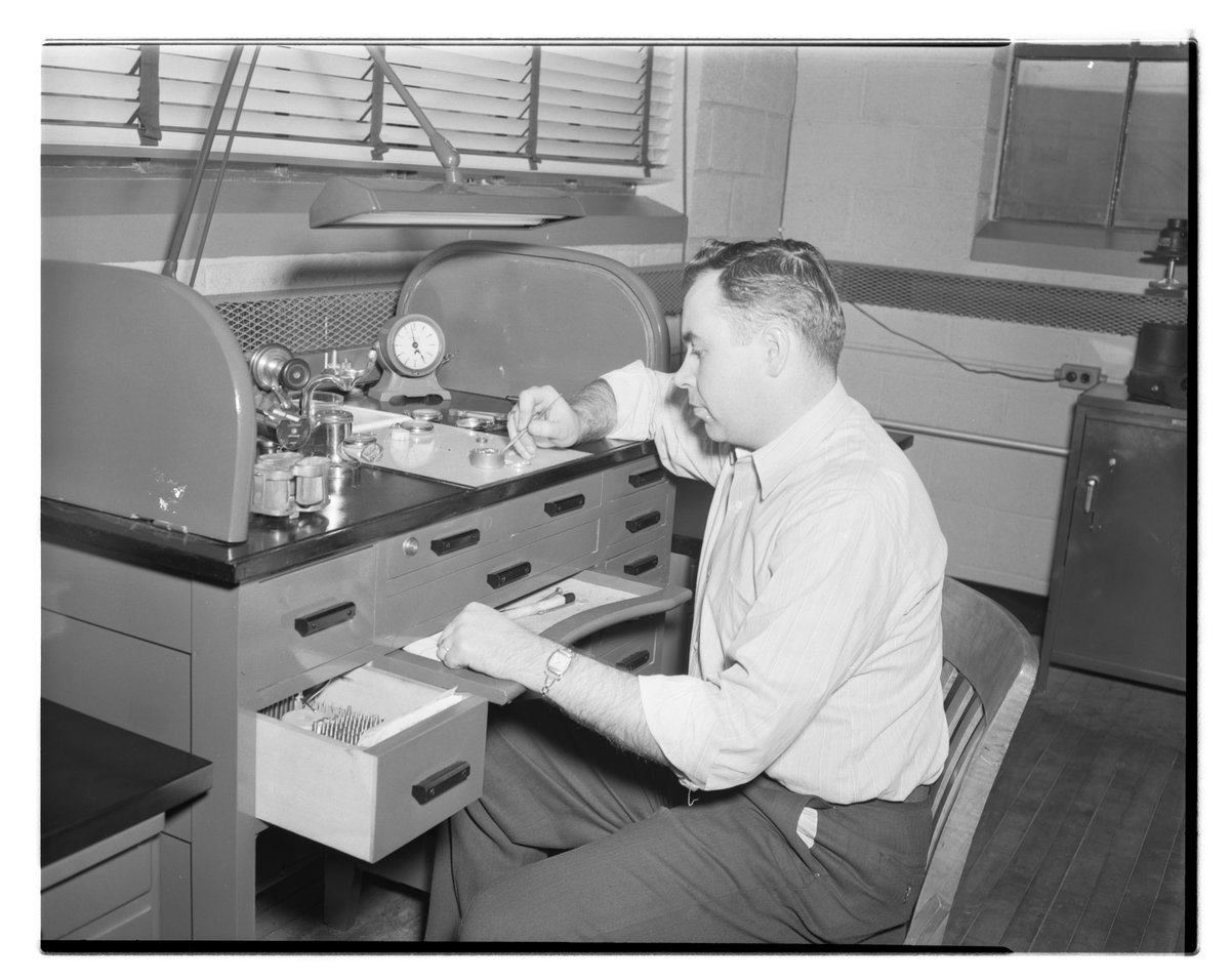 General view of skilled instrument specialist Robert L. Kennedy cleaning and repairing a stop watch in the Dow Chemical Company's Instrument Department. Established in 1926, the Instrument Department was responsible for the installation and maintenance of the assorted apparatus necessary to manage the plant's production facilities and processes. The department notably maintained accurate standards for temperatures, voltage, resistance, flow and pressures against which the plant's instruments were regularly calibrated and checked for accuracy.