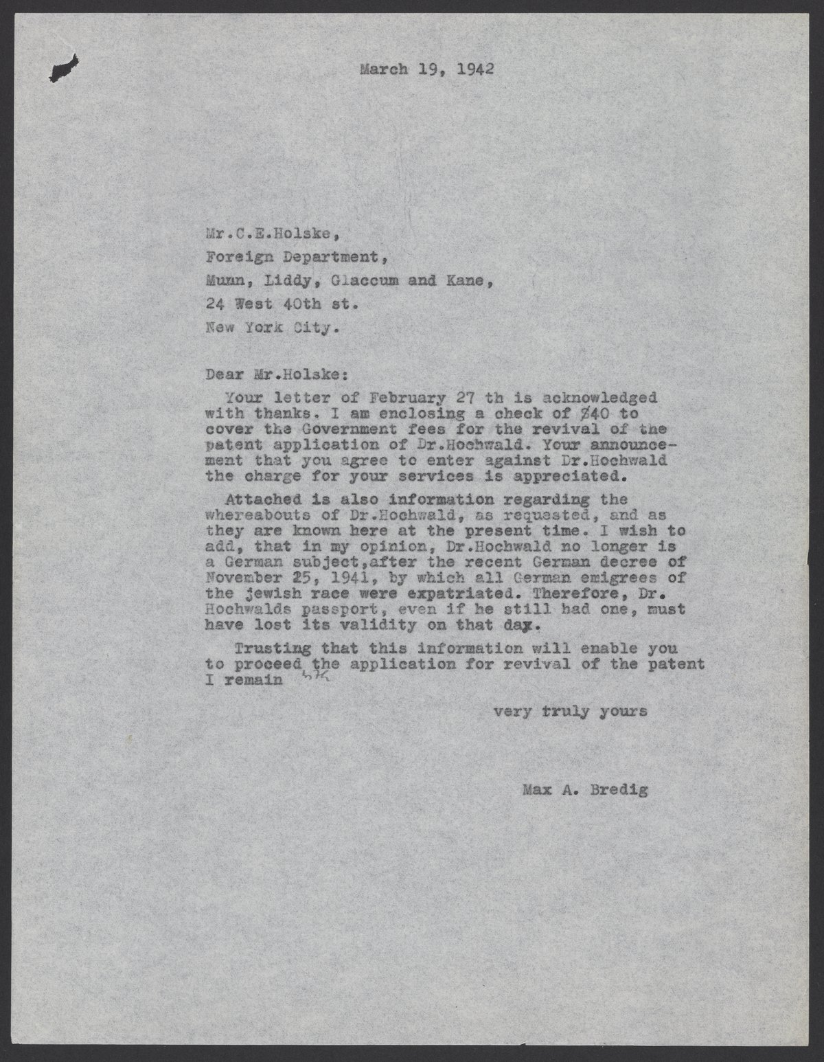 Letter from Max Bredig to Clarence. E. Holske, March 19, 1942