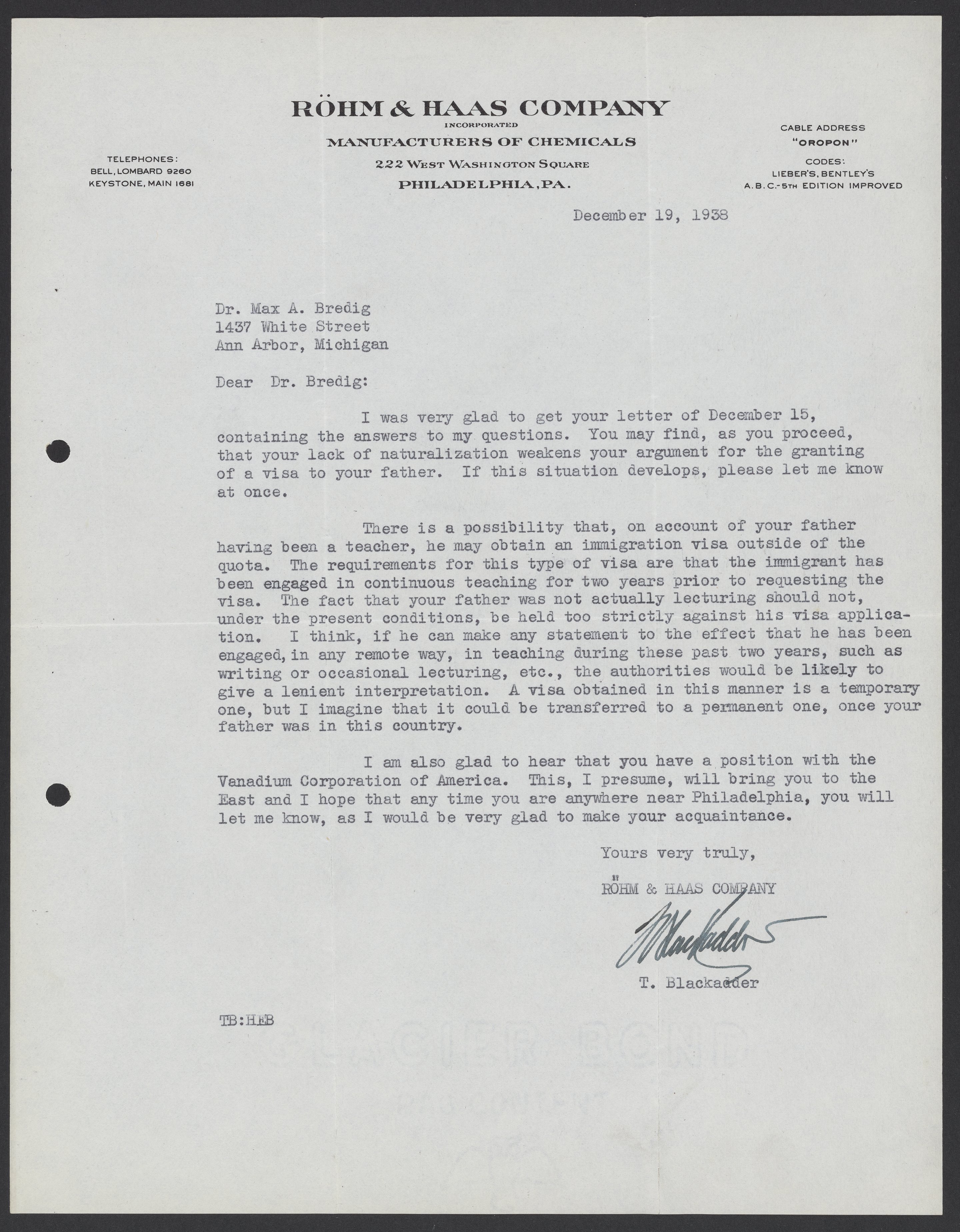 Thomas Blackadder (1887-1953) gives Max Albert Bredig (1902-1977) advice on how to bring his father, Georg Bredig (1868-1944), to the United States. Blackadder suggests Georg could obtain a visa as a teacher.