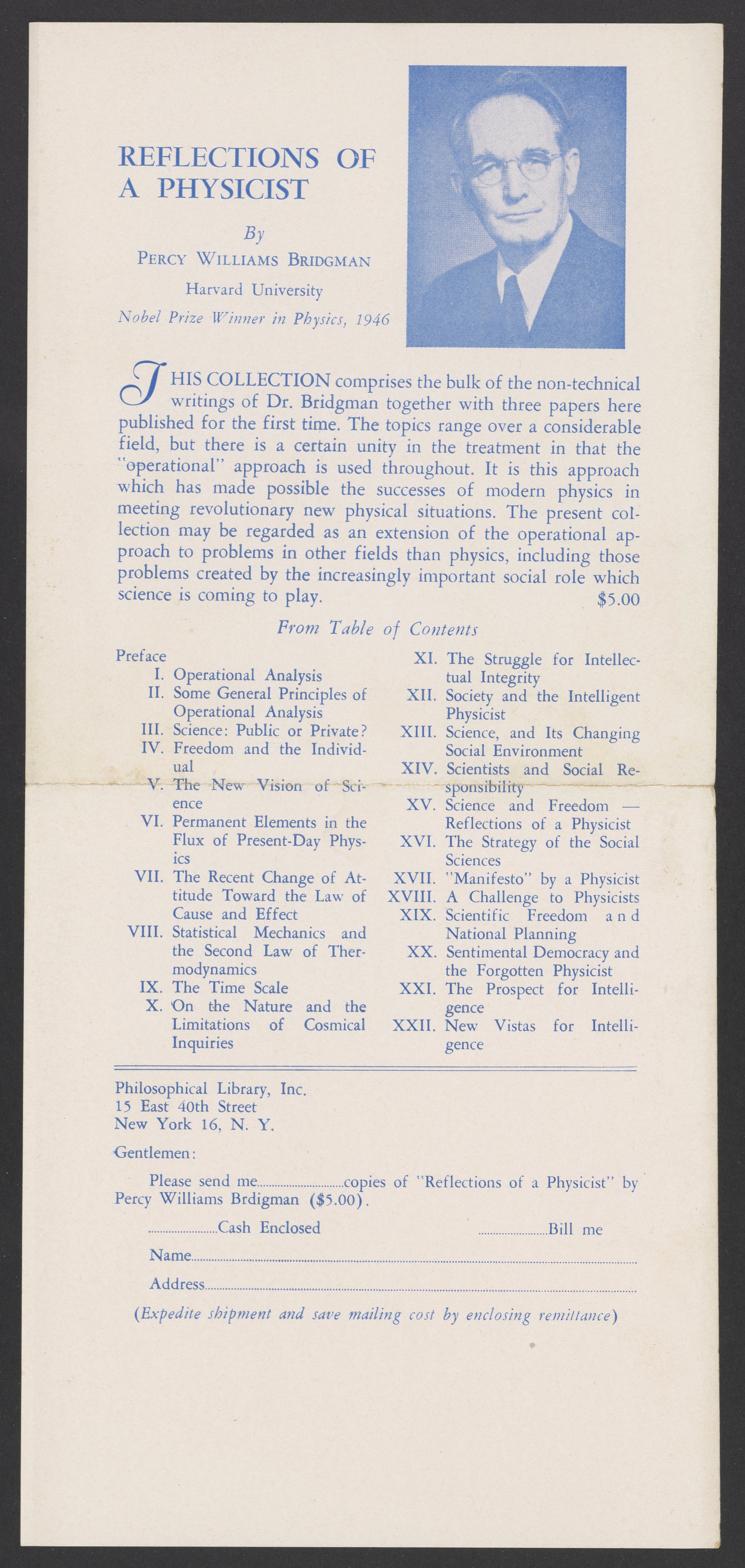 Advertisement and mail-in order form for Reflections of a Physicist by Percy Williams Bridgman (1882-1961).