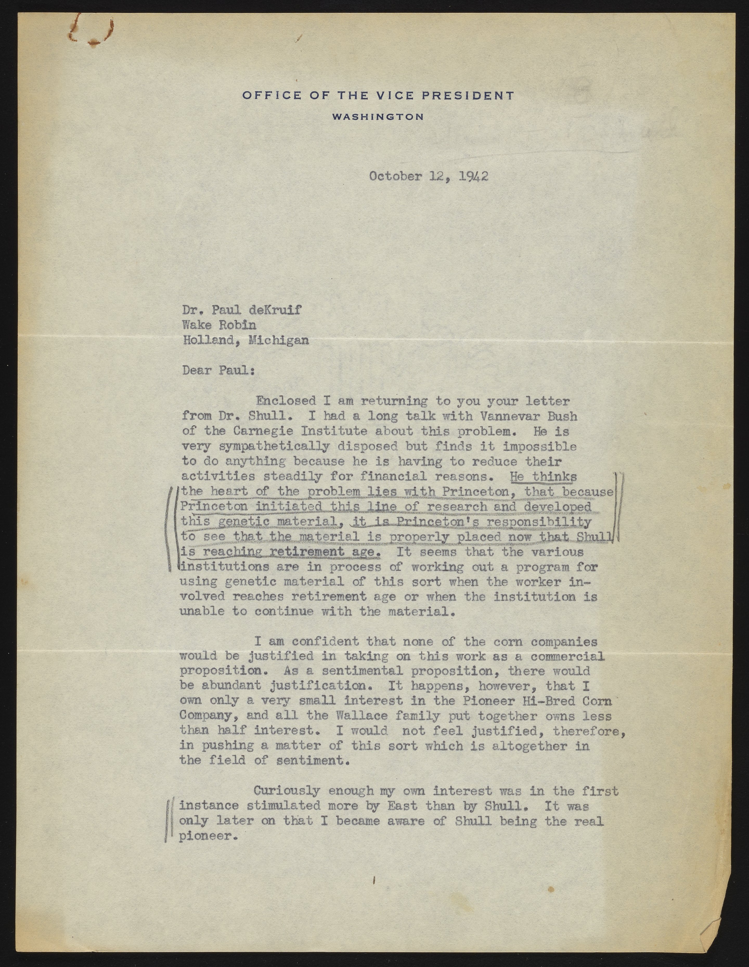 Small JPG1200 x 1550px — 308 KBLarge JPG2880 x 3719px — 1.8 MBFull-sized JPG3460 x 4468px — 2.5 MBOriginal fileTIFF — 3460 x 4468px — 44.3 MBLetter from Henry A. Wallace, Vice President of the United States, to microbiologist and author Paul de Kruif. The letter concerns corn genetics research conducted by plant geneticist, George Harrison Shull, at Princeton University. Shull was a subject in de Kruif's 1928 book, Hunger Fighters, and sent a letter to de Kruif, which was forwarded to Vice President Wallace, concerning the fate of Shull's genetic plant material once he retired.