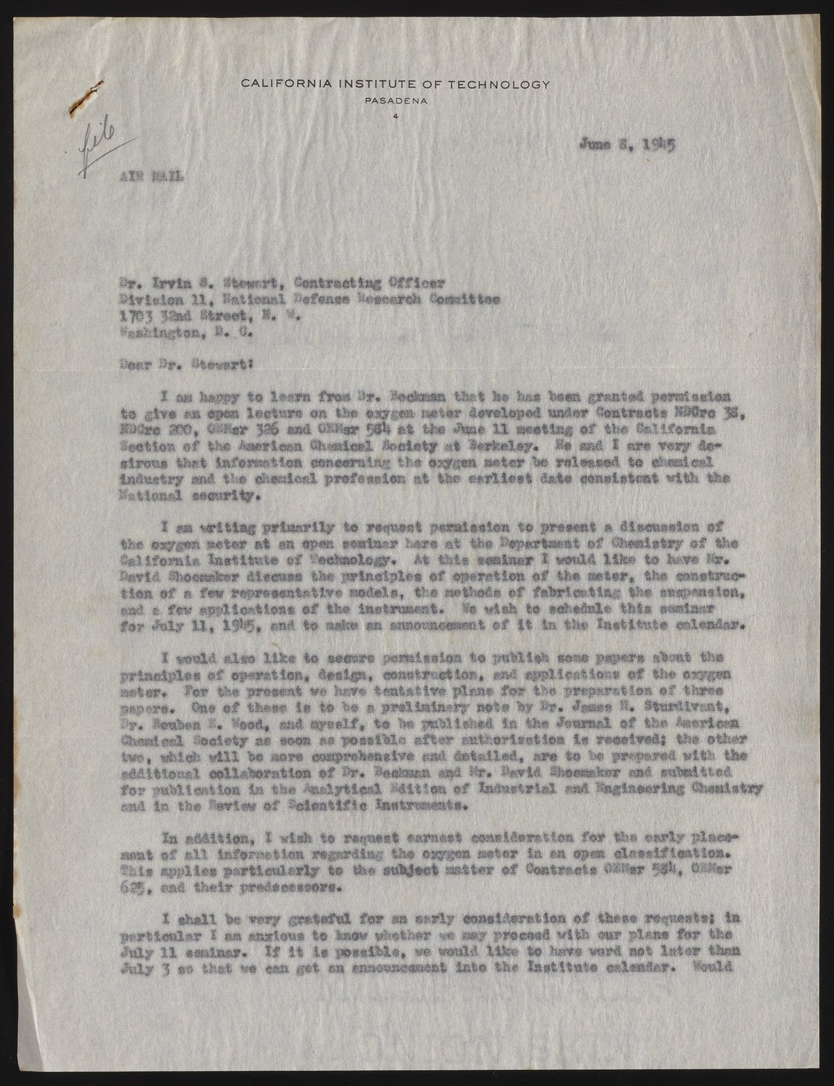 Pauling, Linus. “Letter from Linus Pauling to Irvin S. Stewart,” June 5, 1945. Beckman Historical Collection, Box 19, Folder 9. Science History Institute. Philadelphia. https://digital.sciencehistory.org/works/pg15bd96g.