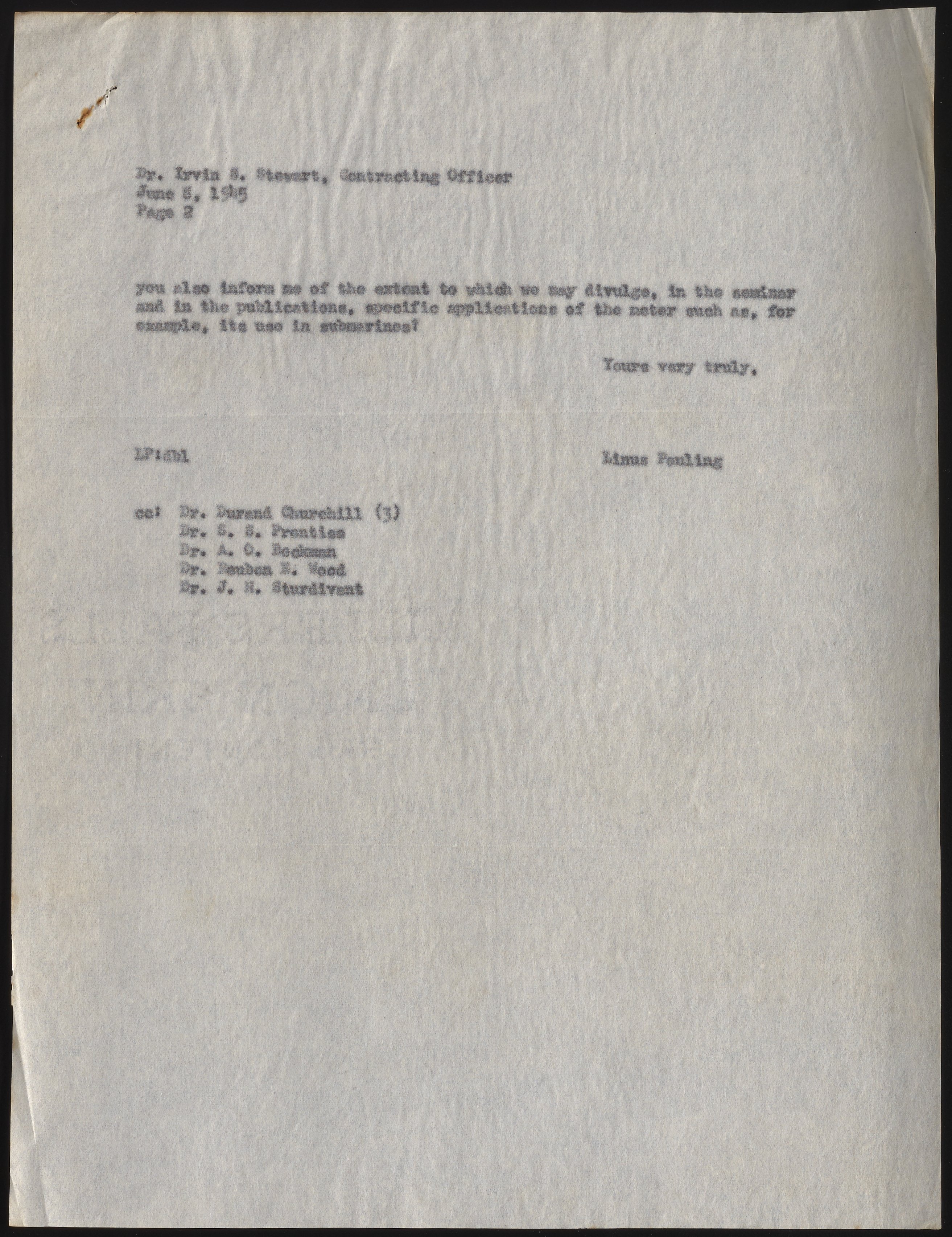 Small JPG1200 x 1562px — 381 KBFull-sized JPG2651 x 3450px — 1.8 MBOriginal fileTIFF — 2651 x 3450px — 26.2 MBLinus Pauling's oxygen meter was developed as a military project and the details were classified. In this letter, Pauling requested permission to discuss the oxygen meter at a Caltech seminar. He also states a desire to co-author publications with James H. Sturdivant, Reuben E. Wood, Arnold O. Beckman and David Shoemaker.