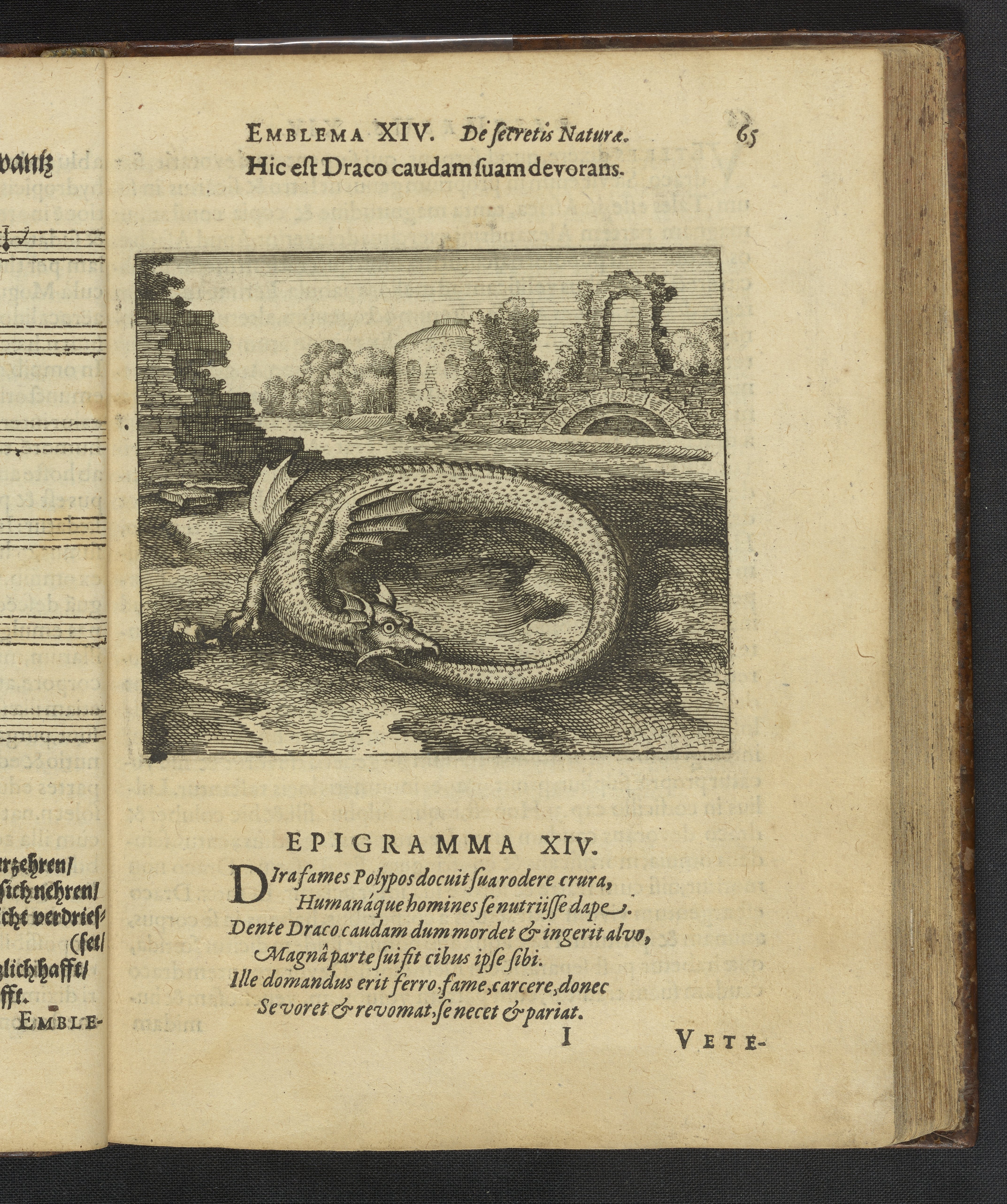 Maier, Michael. “Emblema XIV. Hic Est Draco Caudam Suam Devorans.” In Atalanta Fugiens. Oppenheim, Germany: Johann-Theodor de Bry, 1618. https://digital.sciencehistory.org/works/pg15bf75x.