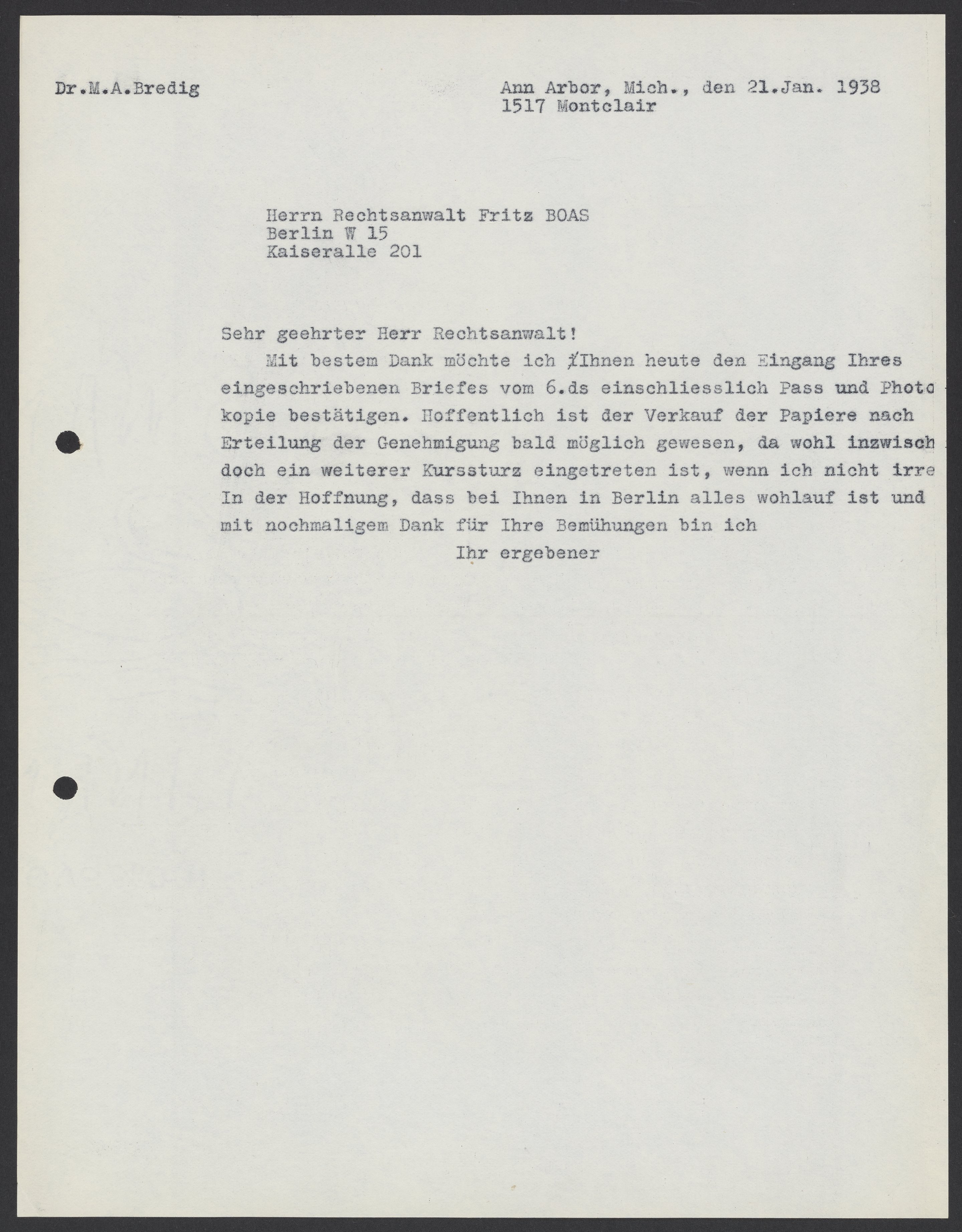 Mit bestem Dank möchte ich Ihnen heute den Eingang Ihres eingeschriebenen Briefes vom 6.ds einschliesslich Pass und Photokopie bestätigen. Hoffentlich ist der Verkauf der Papiere nach Erteilung der Genehmigung bald möglich gewesen, da wohl inzwsichen doch ein weiterer Kurssturz eingetreten ist, wenn ich nicht irre. In der Hoffnung, dass bei Ihnen in Berlin alles wohlfauf ist und mit nochmaligen Dank für Ihre Bemühung bin ich