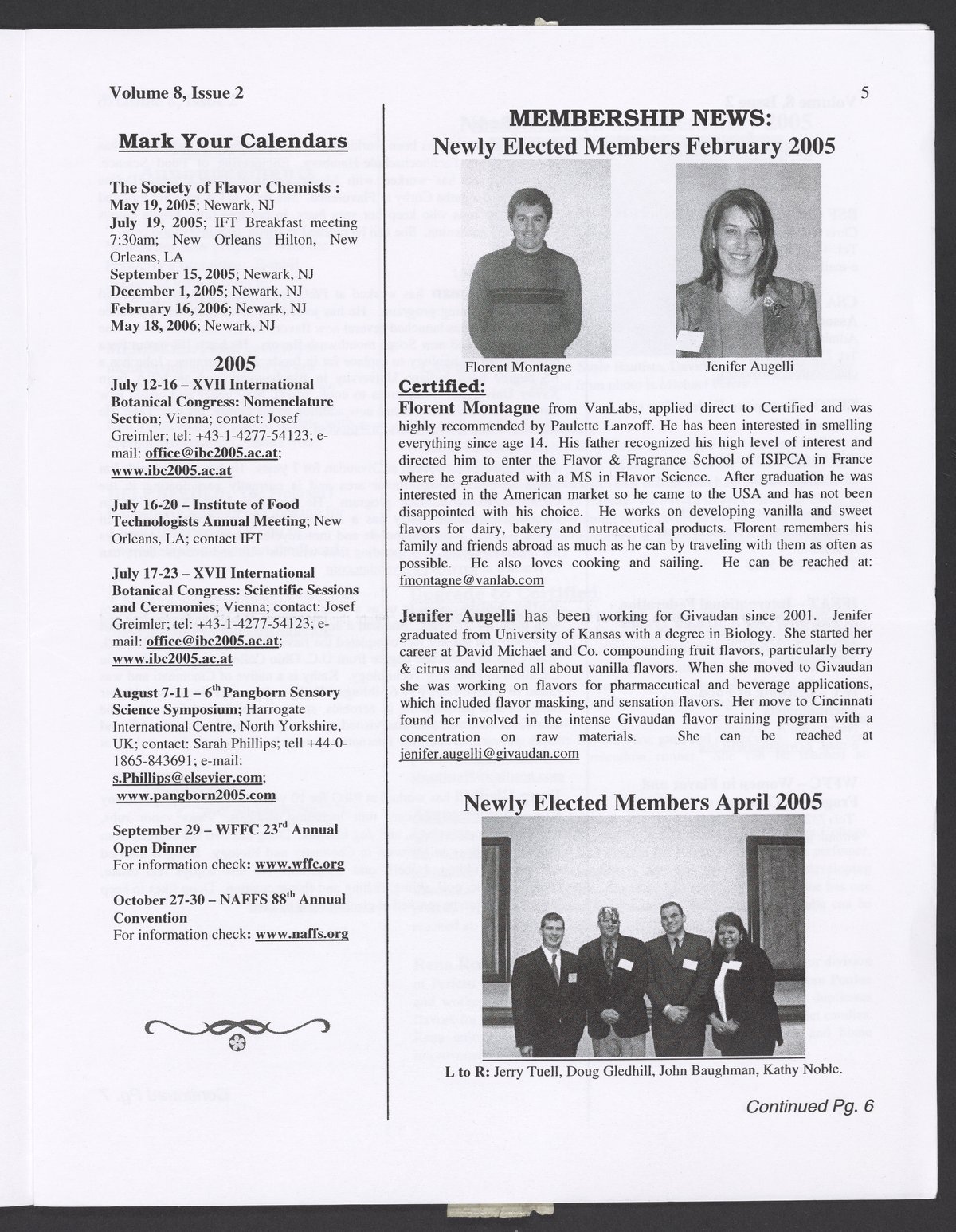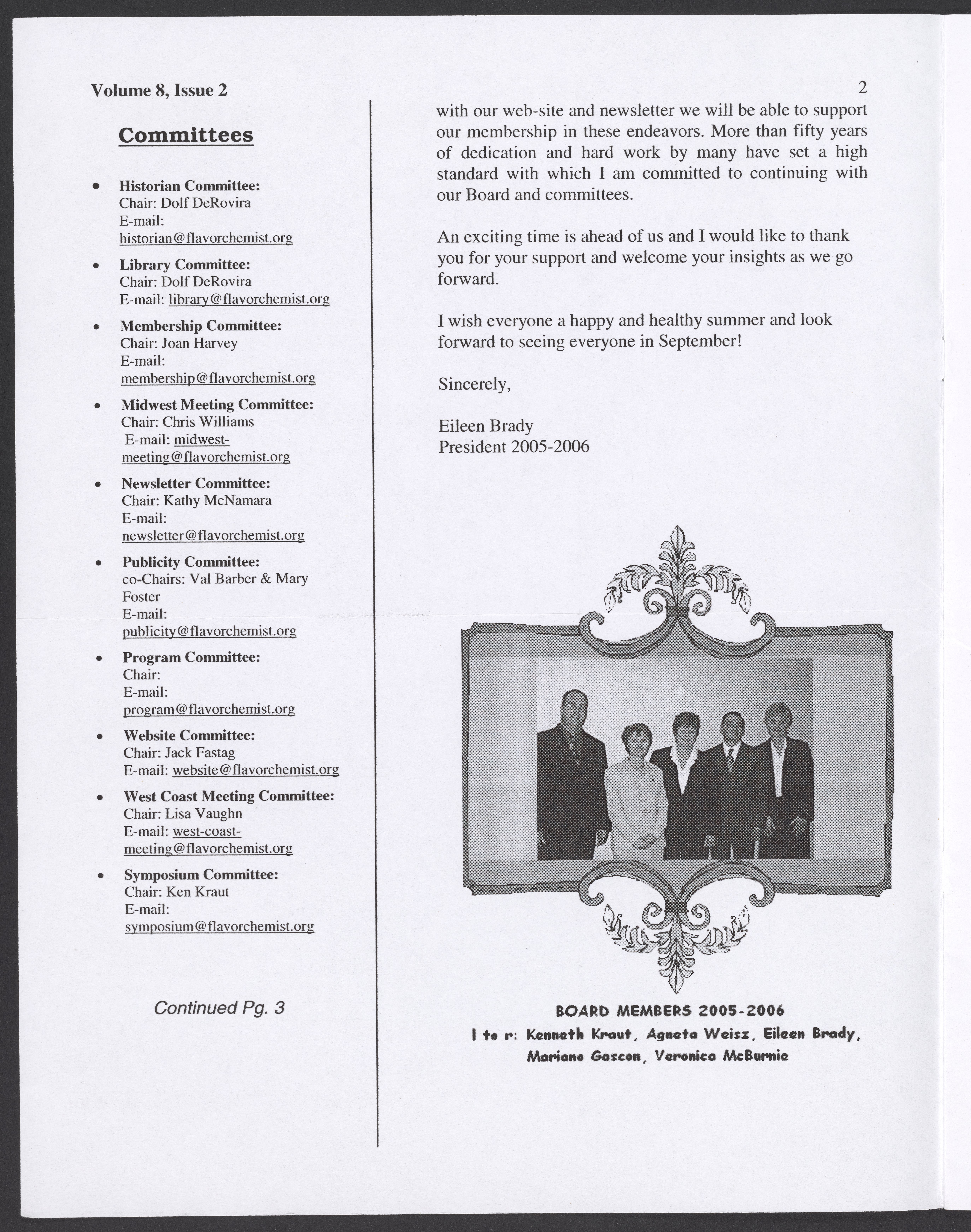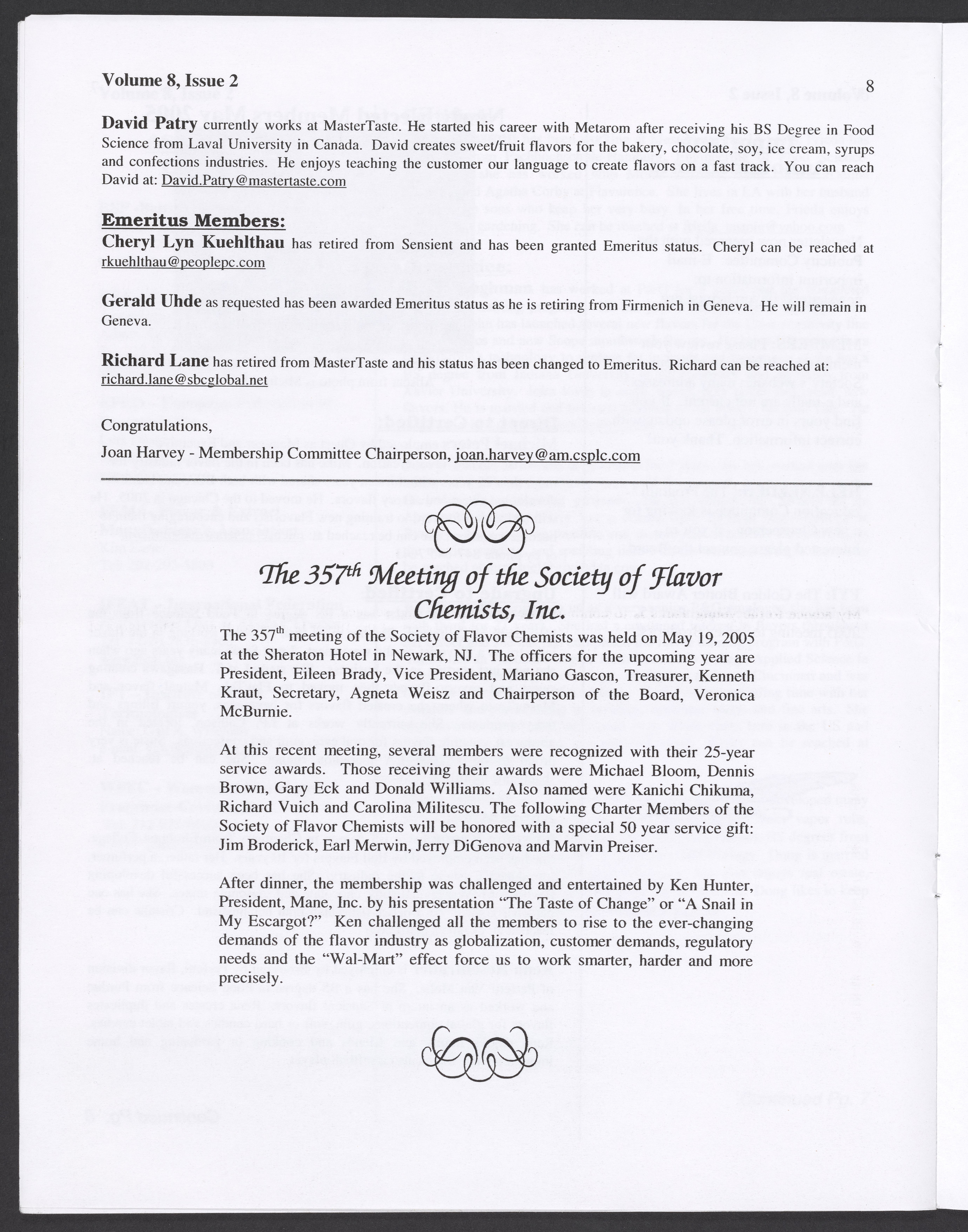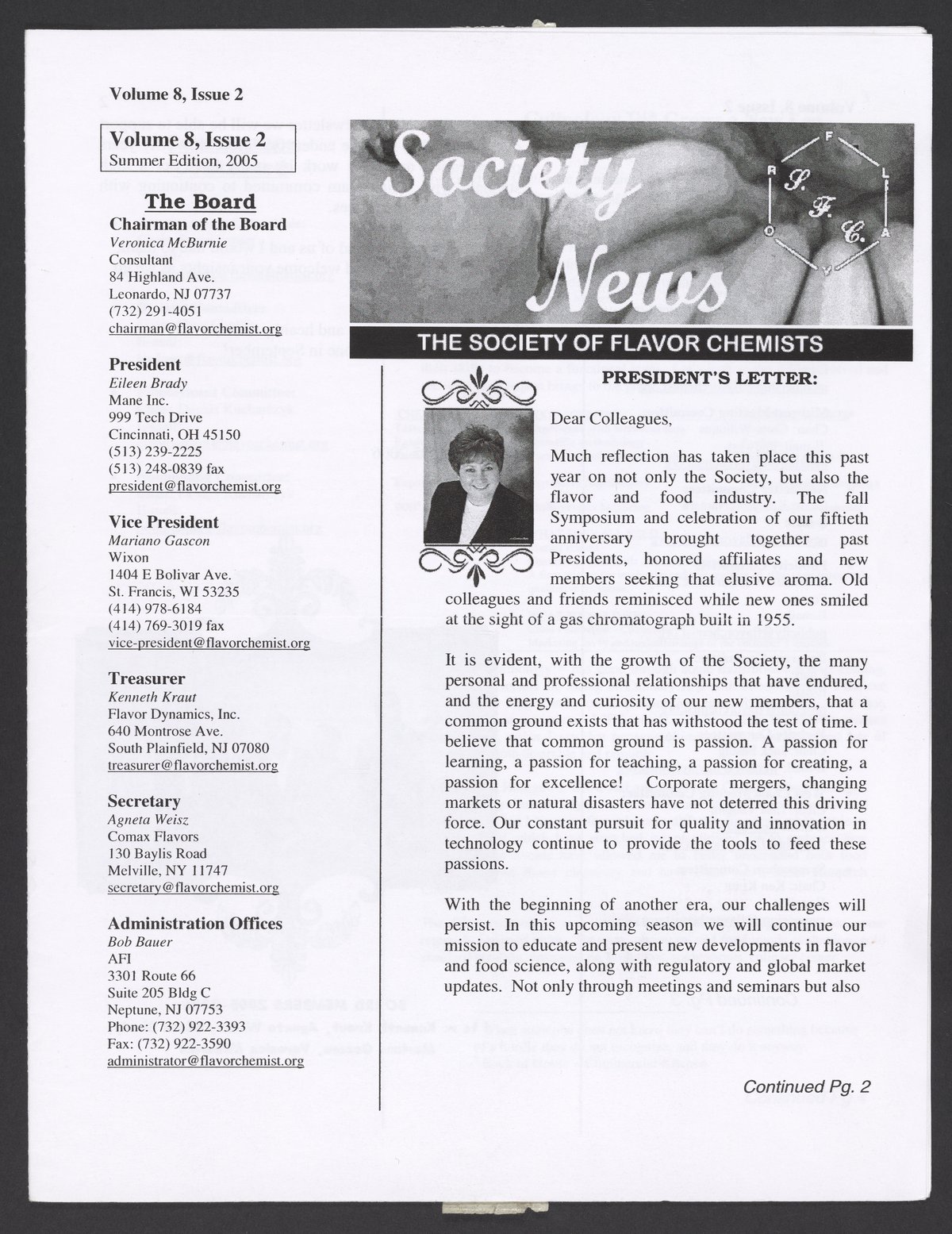 Society of Flavor Chemists. “Society News, Volume 8, Issue 2,” 2005. Society of Flavor Chemists, Society News, Box 1, Folder 2. Science History Institute. Philadelphia. https://digital.sciencehistory.org/works/pis2oen.