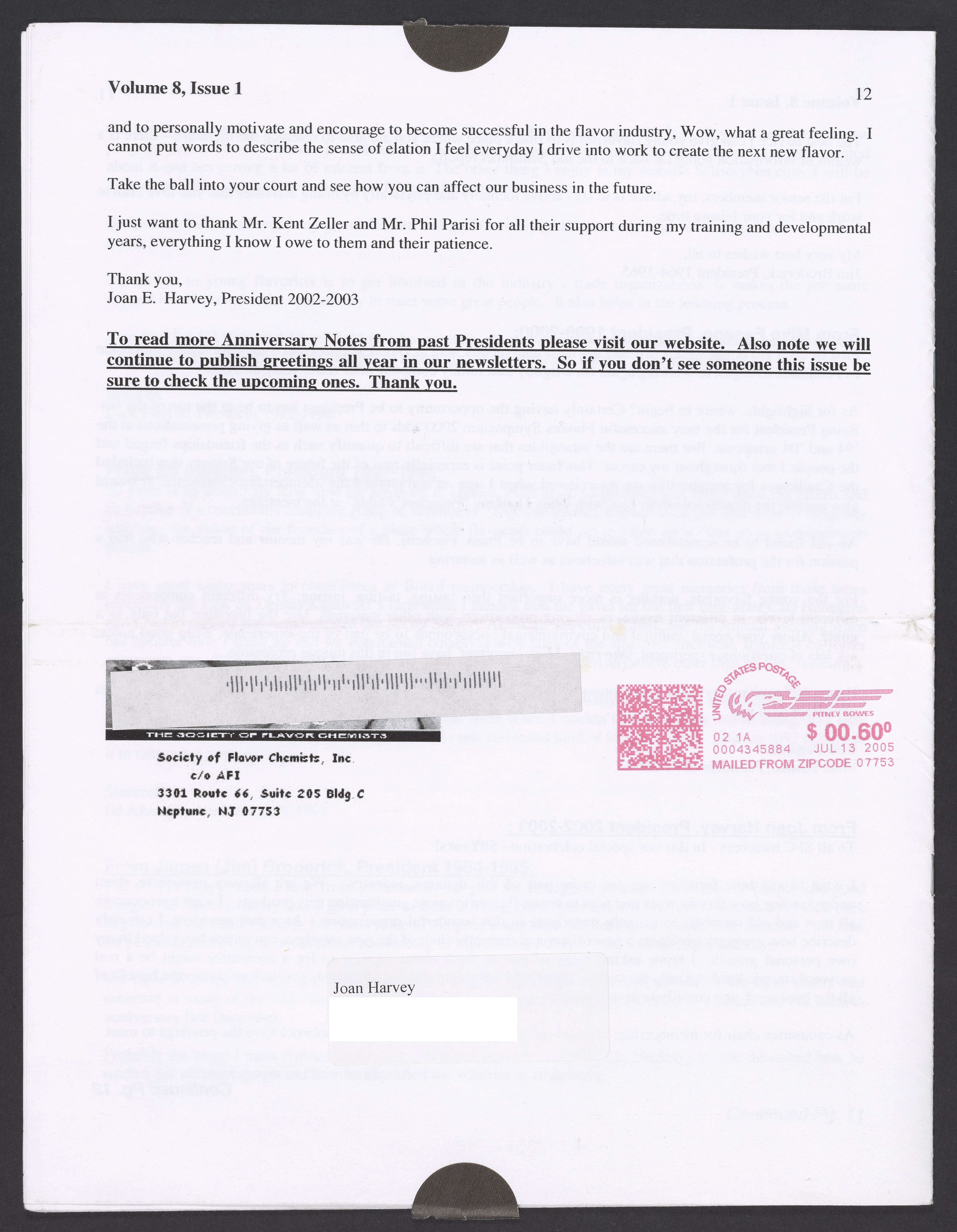 Small JPG1200 x 1555px — 337 KBLarge JPG2880 x 3733px — 1.9 MBFull-sized JPG5528 x 7165px — 6.4 MBOriginal fileTIFF — 5528 x 7165px — 113 MBSummer 2005 issue of the Society News, the Society of Flavor Chemists newsletter. The addressee's mailing address has been redacted for privacy purposes.
