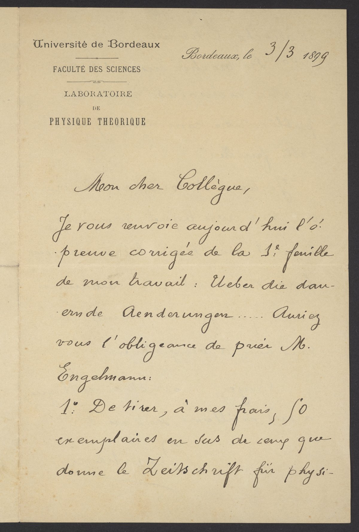 Duhem, Pierre Maurice Marie. “Letter from Pierre Duhem to Georg Bredig, March 1899,” March 3, 1899. Papers of Georg and Max Bredig, Box 1, Folder 33. Science History Institute. Philadelphia. https://digital.sciencehistory.org/works/pivfxgt.