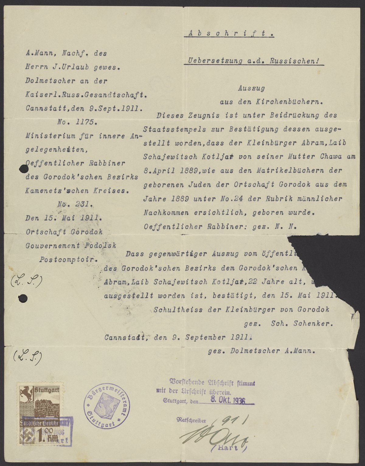 Certificate of birth for Abram Laib Schajewitsch Kotljar