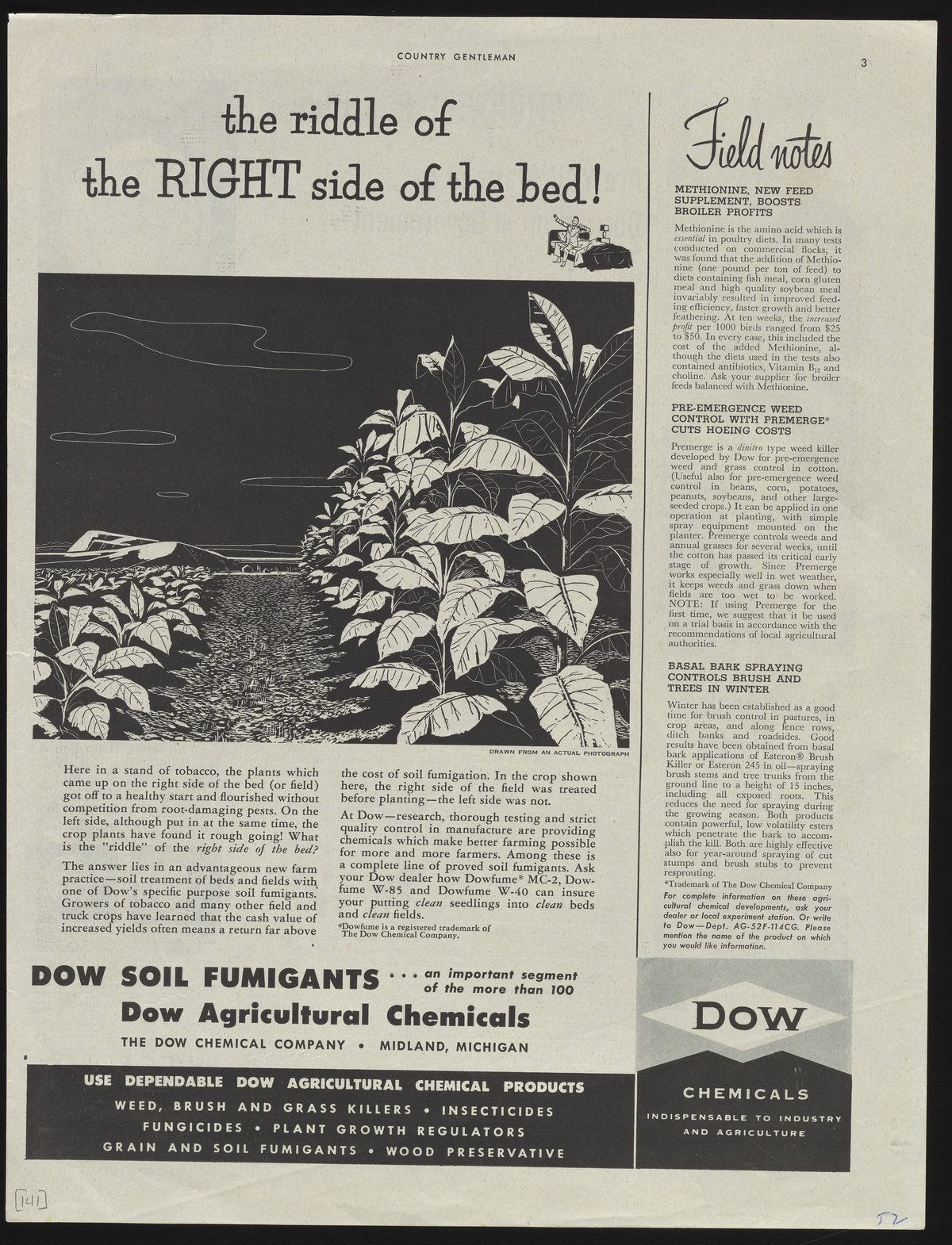 Black and white print advertisement for soil fumigants and other agricultural chemicals manufactured and sold by the Dow Chemical Company. The advertisement features an illustration of two beds of tobacco plants, with accompanying text detailing the use of soil fumigants to eliminate root-damaging pests and produce better crop yields. This advertisement appeared in a 1952 edition of Country Gentleman.