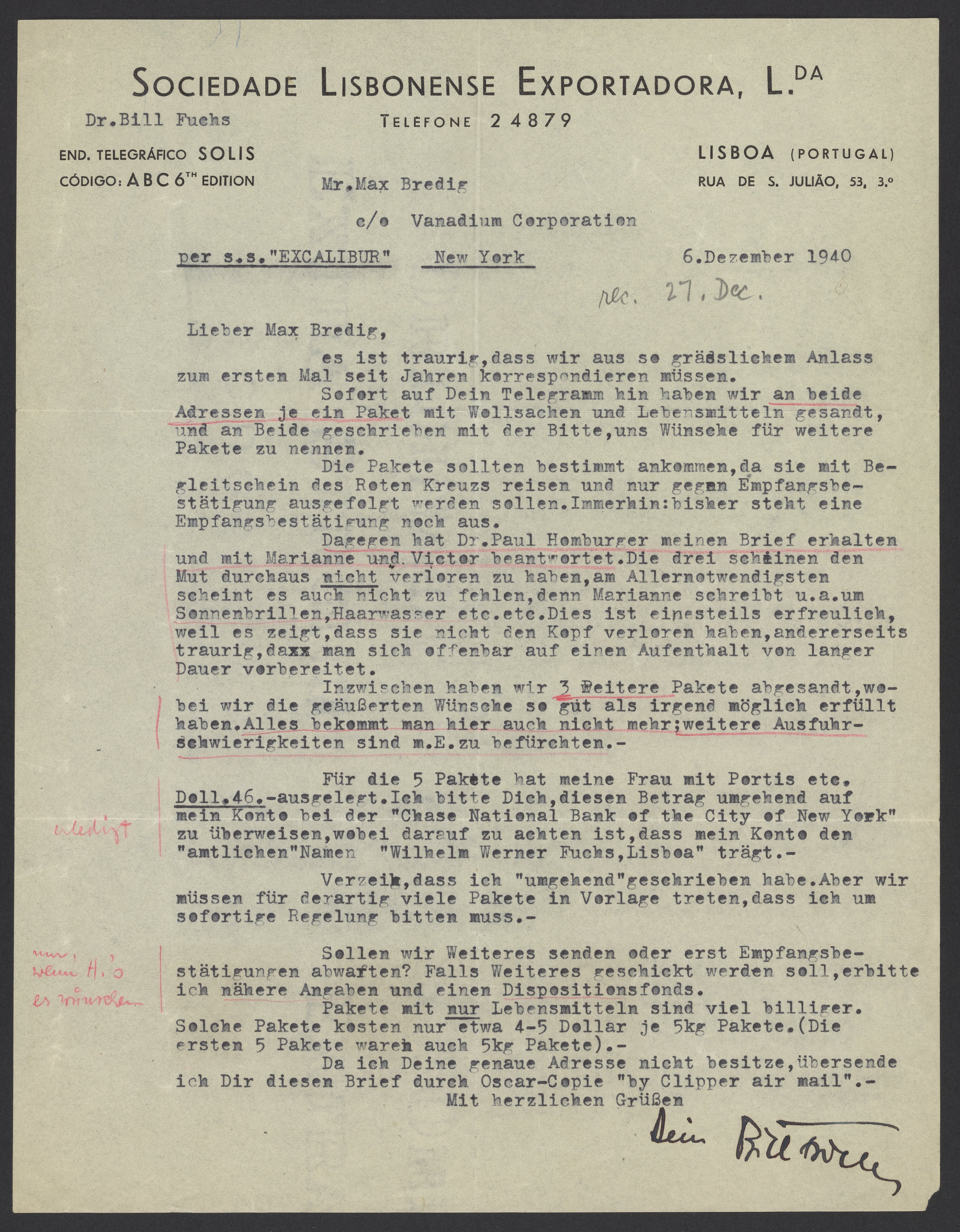 Letter from Bill Fuchs to Max Bredig, December 6, 1940