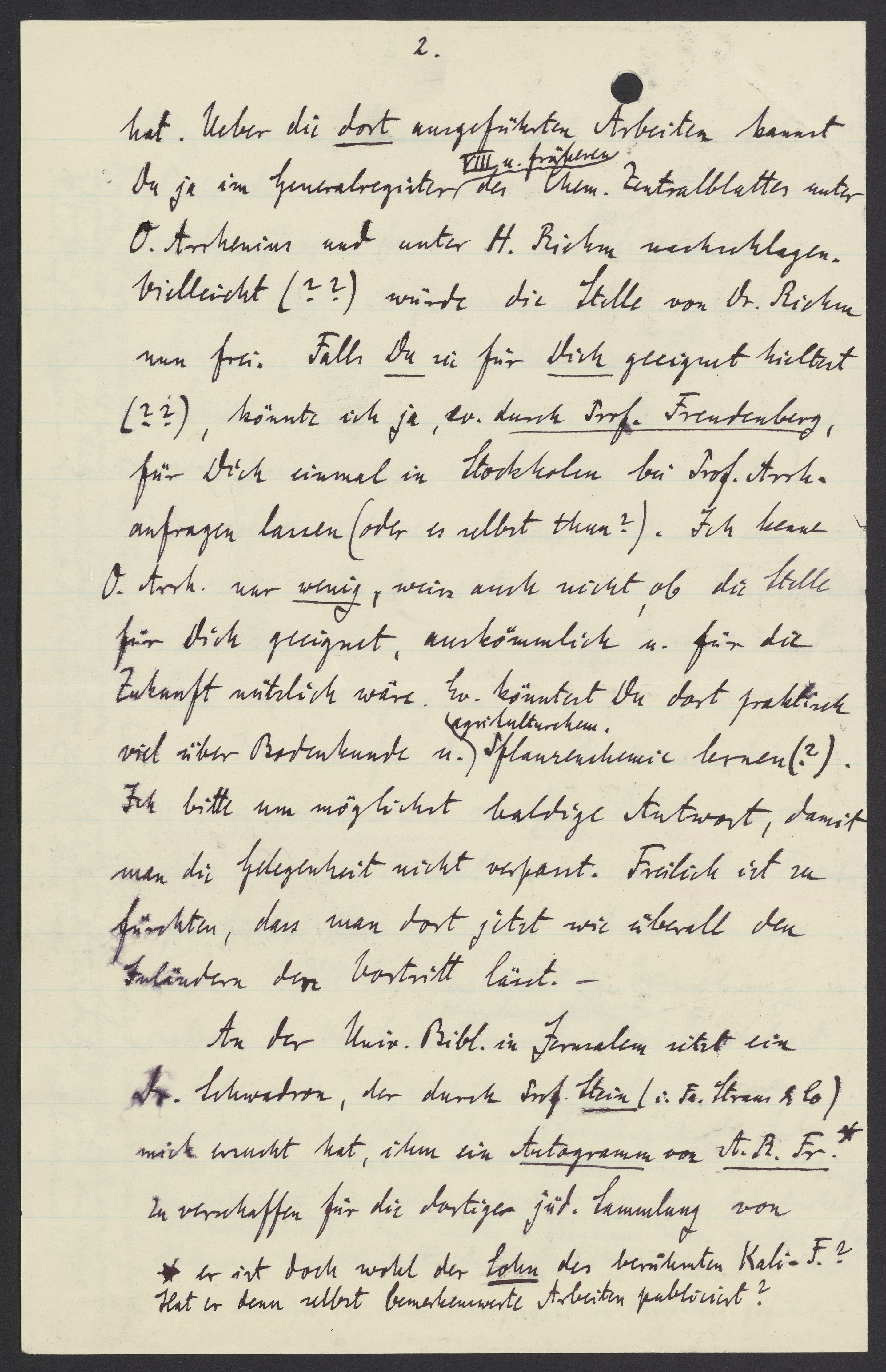 An der Univ. Bibl. in Jerusalem sitzt ein Dr. Schwadron, der durch Prof. Stein (i. Fr. Straus & Co) mich ersucht hat, ihm ein Autogramm von A.R.Fr.* zu verschaffen für die dortige jüd. Sammlung von