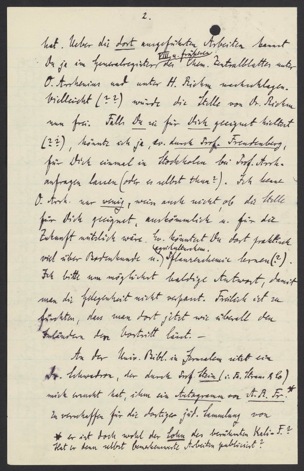 Über die dort ausgeführten Arbeiten kannst Du ja im Generalregister (VIII u. früheren) des Chem. Zentralblattes unter O. Arrhenius und unter H. Riehm nachschlagen. Vielleicht (??) würde die Stelle von Dr. Riehm nun frei. Falls Du sie für Dich geeignet hieltest (??), könnte ich ja, ev. durch Prof. Freundenberg, für Dich einmal in Stockholm bei Prof. Arrh. anfragen lassen (oder es selbst thun?). Ich kenne O. Arrh. nur wenig, weiss auch nicht ob die Stelle für Dich geeignet, auskömmlich u. für die Zukunft nützlich wäre. Ev. könntest Du dort praktisch viel über Bodenkunde u. agrikulturchem. Pflanzchemie lernen (?). Ich bitte um möglichst baldige Antwort, damit man die Gelegenheit nicht verpasst. Freilich ist zu fürchten, dass man dort jetzt wie überall den Inländern den Vortritte lässt.-