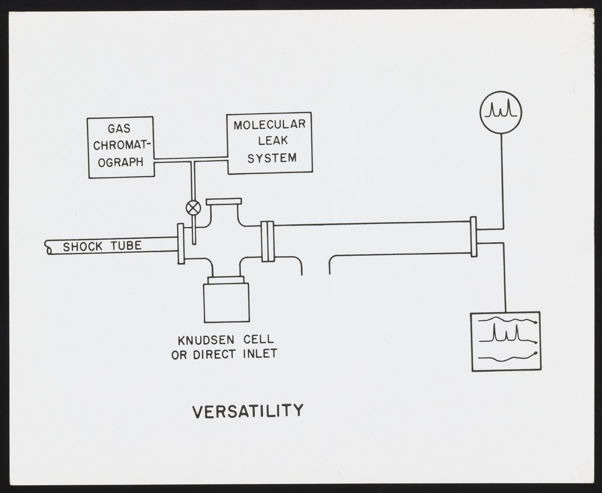 Schematic diagram of a section of a Bendix Time-of-Flight Mass Spectrometer, with view of the shock tube, oscilloscope, and attachment for a Knudsen cell or direct inlet system. The diagram is captioned "versatility," presumably to emphasize the adaptability of the Bendix system. The Time-of-Flight Mass Spectrometer (TOFMS) was the flagship analytical instrument of the Bendix Corporation.
