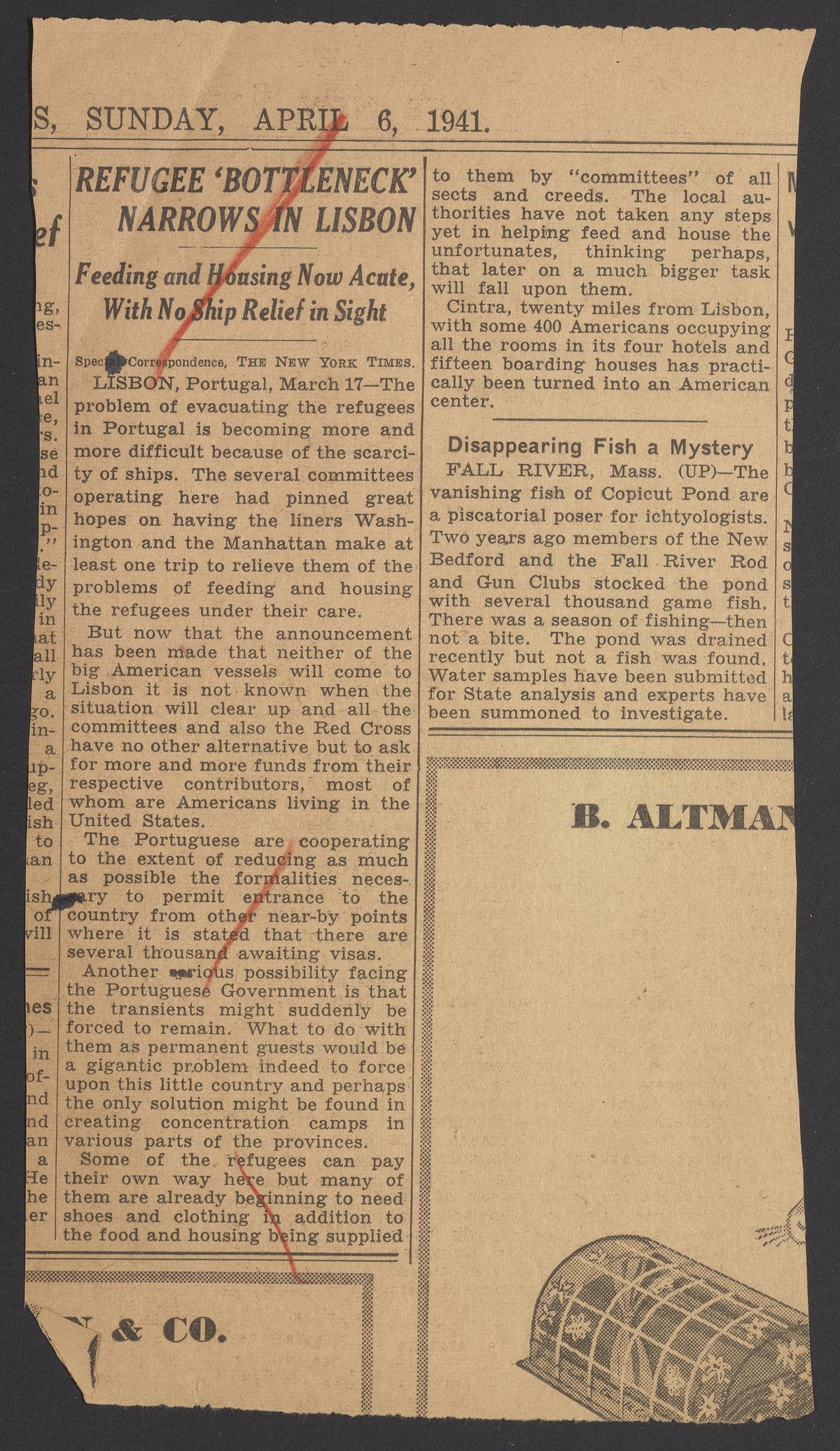 “Refugee 'Bottleneck’ Narrows in Lisbon.” New York times, April 6, 1941. Papers of Georg and Max Bredig, Box 10, Folder 24. Science History Institute. Philadelphia. https://digital.sciencehistory.org/works/ppnnley.