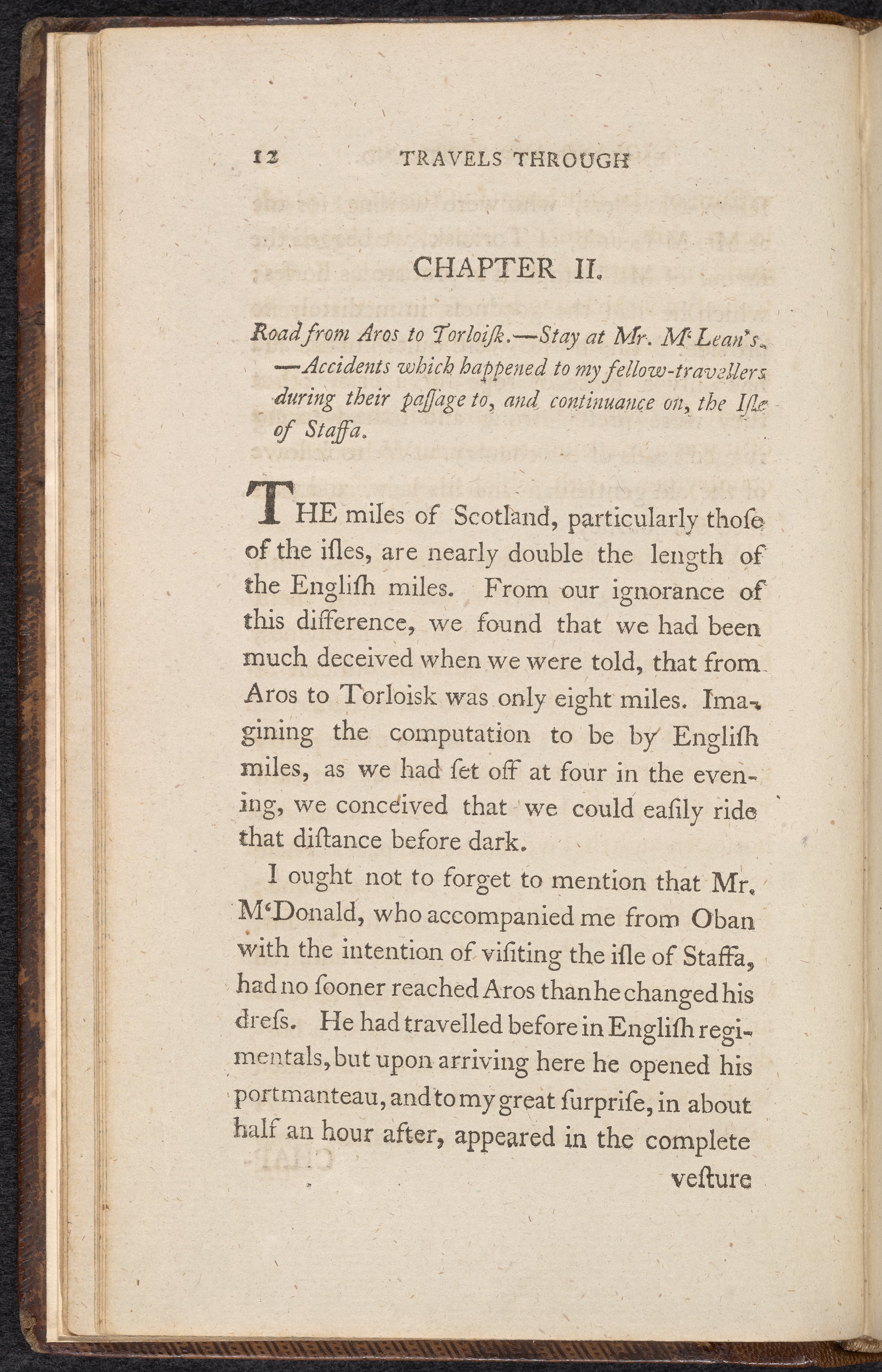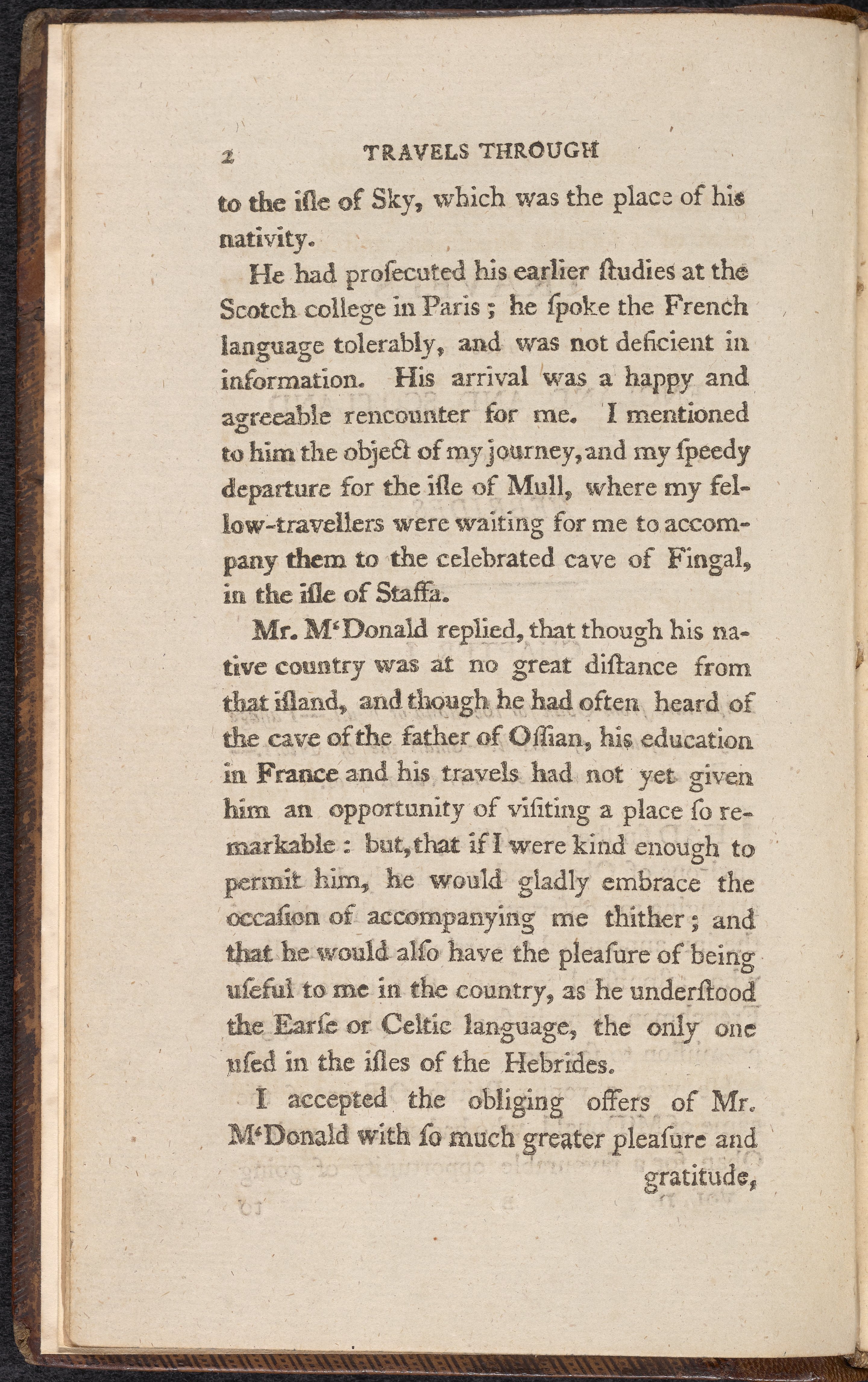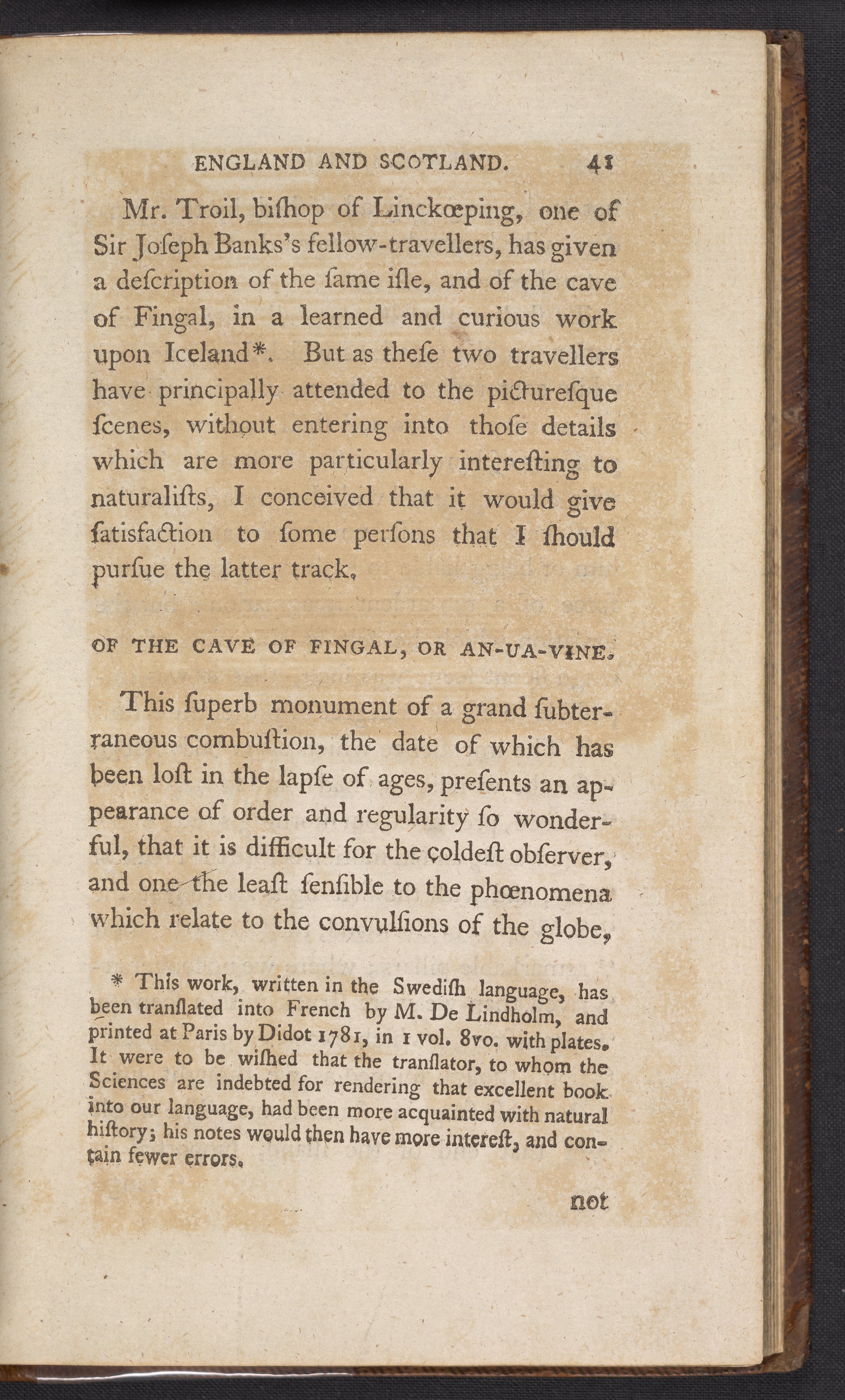 In 1784, de-St.-Fond traveled throughout England, Scotland, and the Hebrides. de-St.-Fond was fluent in English, which presented itself as a valuable skill during his travels as he could converse easily with locals. Early naturalists considered these conversations vital to their research, as the local people were considered to live in symbiosis with their environment.