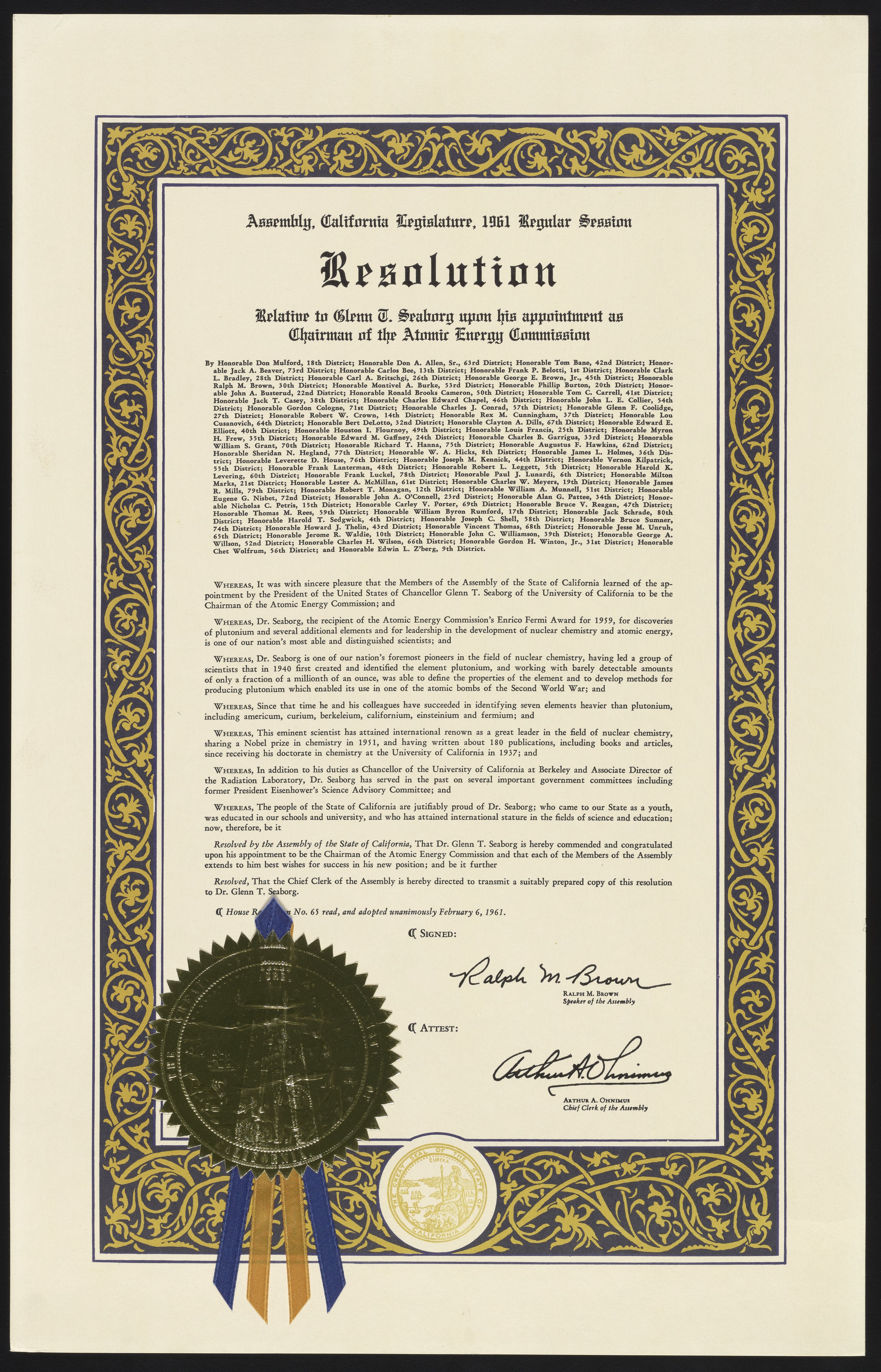 California. Legislature. Assembly. “Resolution of the California Legislature Assembly Honoring Glenn Seaborg,” February 6, 1961. Records of the Lawrence Berkeley National Laboratory - Nuclear Division, Folder 1. Science History Institute. Philadelphia. https://digital.sciencehistory.org/works/pr76f347h.