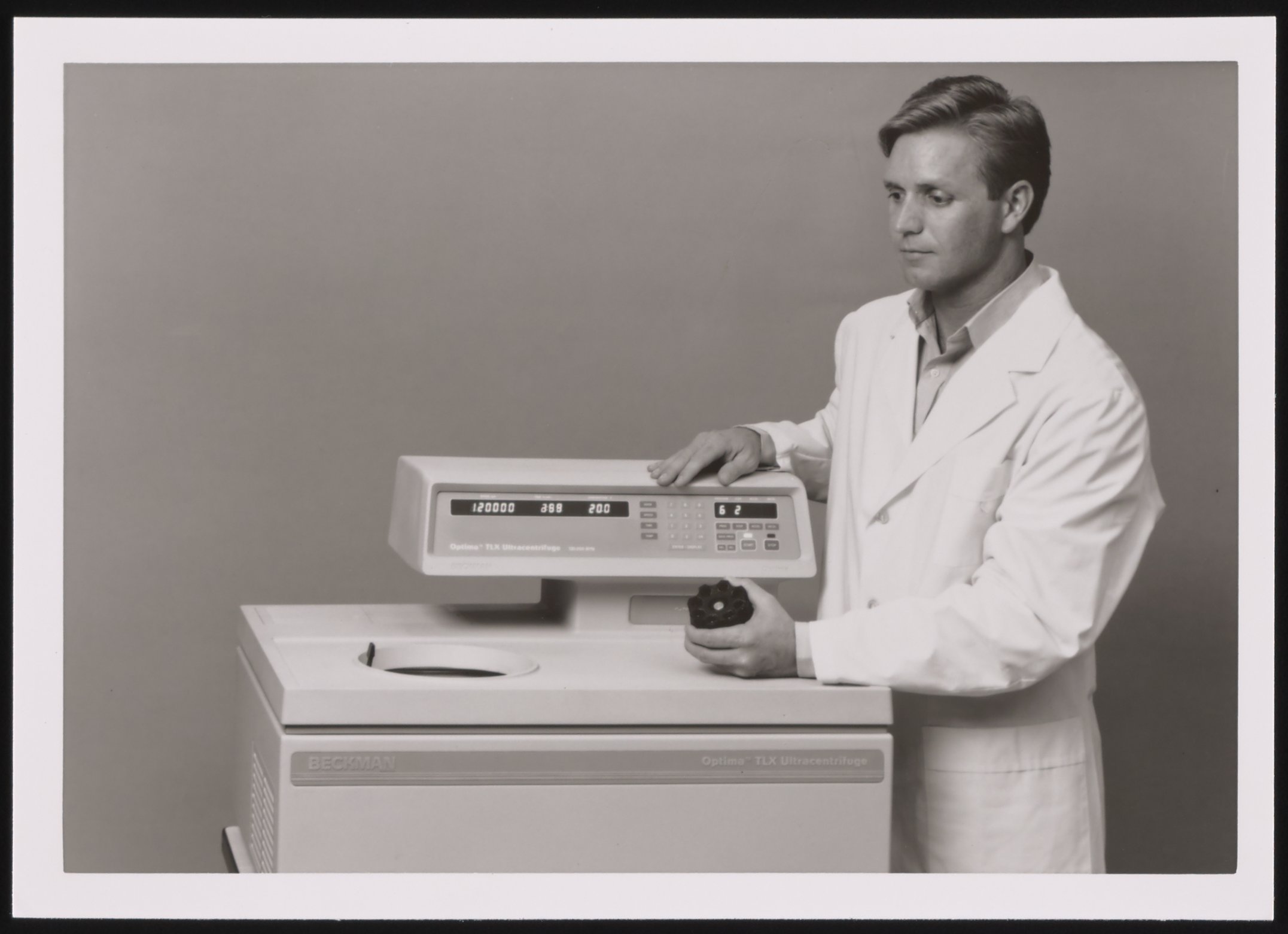 “Man Holding a Rotor with Beckman Optima TLX-120 Ultracentrifuge,” n.d. Beckman Historical Collection, Box 77. Science History Institute. Philadelphia. https://digital.sciencehistory.org/works/pr76f350t.