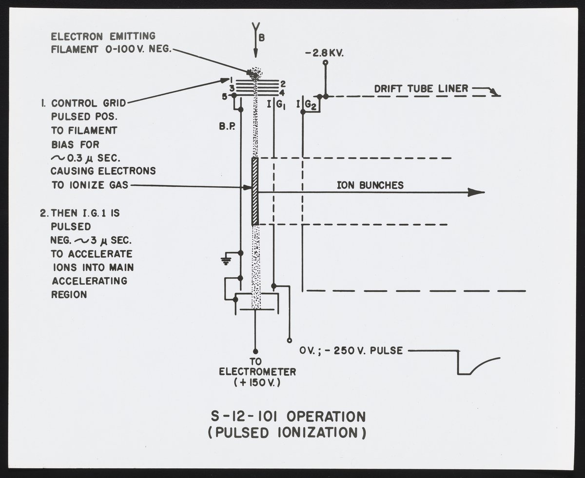 Bendix Corporation. “Diagram of Pulsed Ionization Operation,” 1970–1979. Photographs from the Bendix Time-of-Flight Mass Spectrometer Collection, Box 2. Science History Institute. Philadelphia. https://digital.sciencehistory.org/works/pr76f374d.