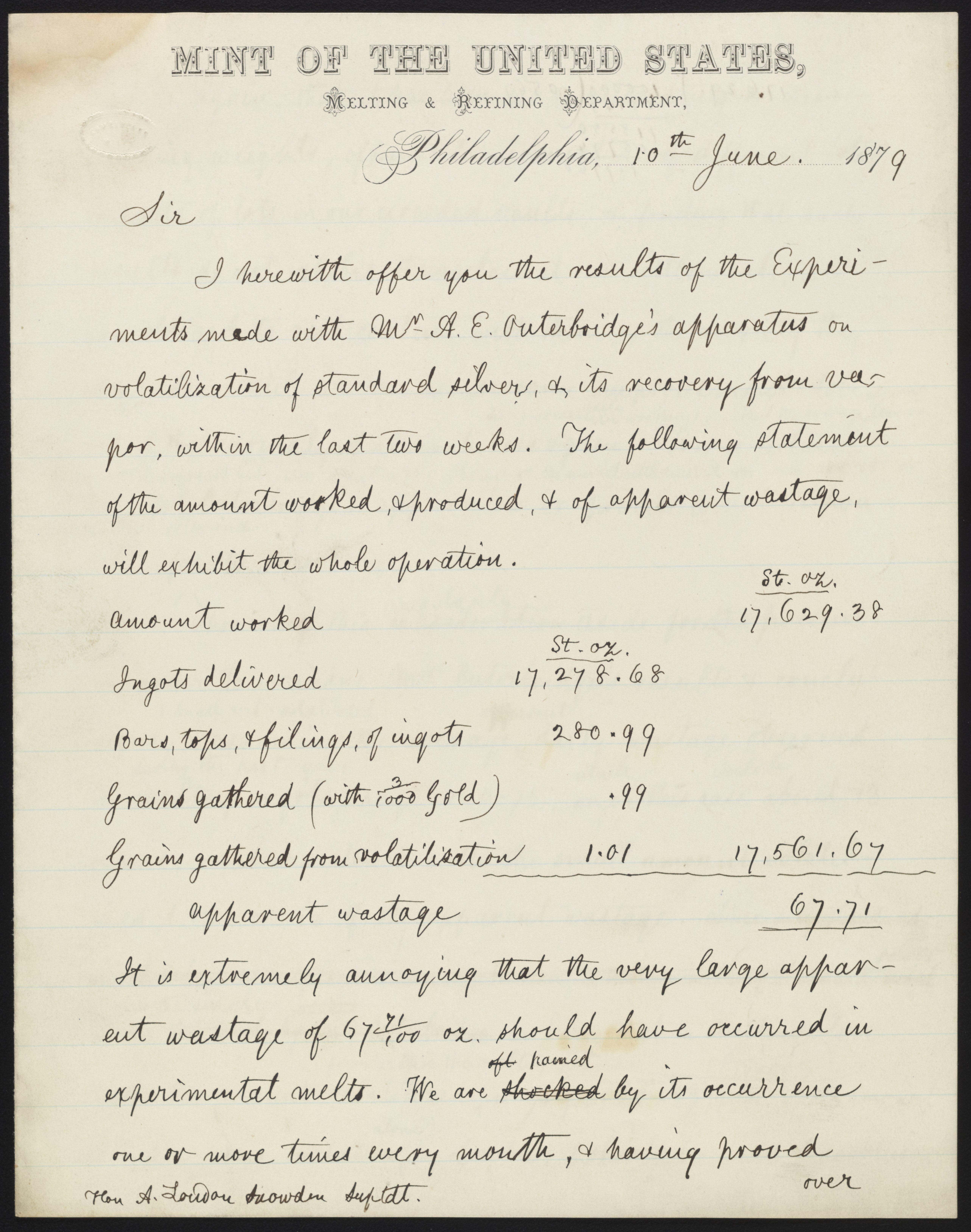 Letter from the Mint of the United States, Melting and Refining Department to an unidentified "sir"