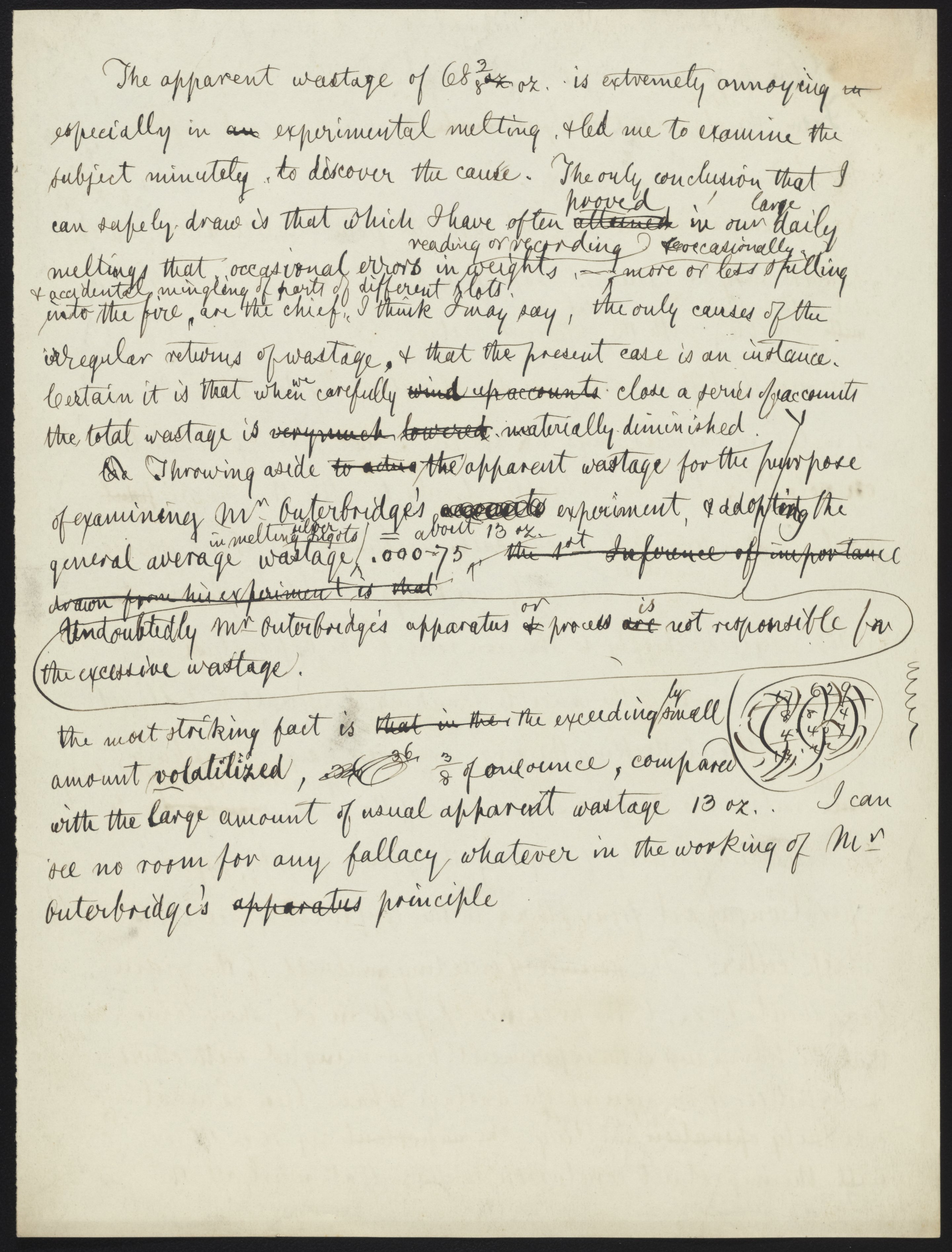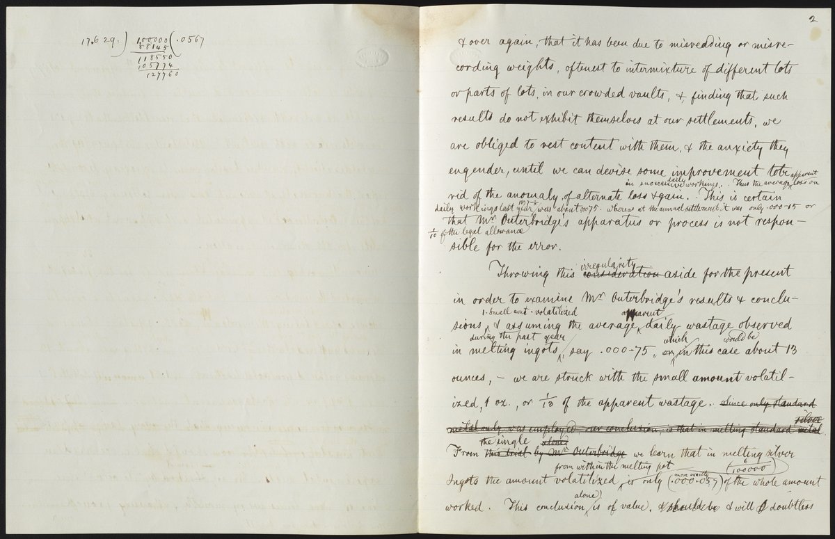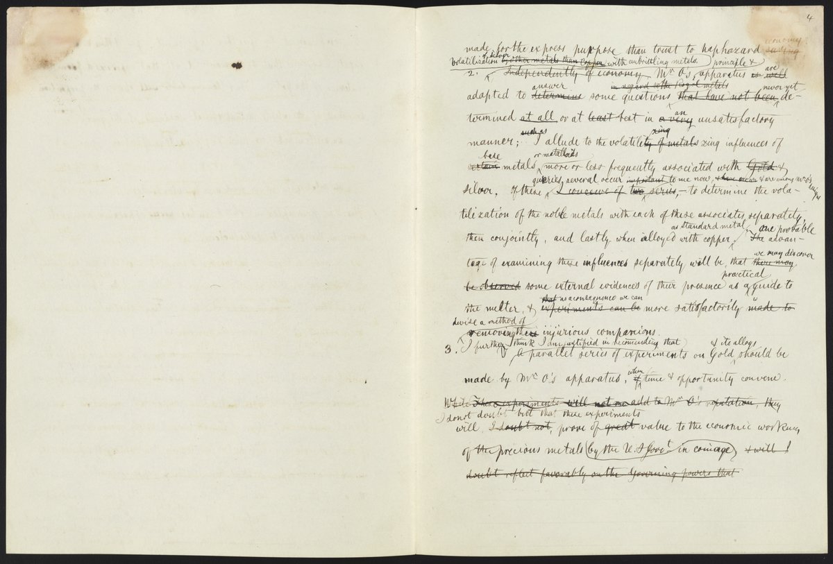 Small JPG1200 x 1522px — 264 KBLarge JPG2880 x 3653px — 1.0 MBFull-sized JPG5132 x 6509px — 2.6 MBOriginal fileTIFF — 5132 x 6509px — 95.6 MBRough draft of a letter dealing with the results of A. E. Outerbridge’s experiments on the volatilization of standard silver. The letter is unsigned but is written in James Curtis Booth's (1810-1888) hand.