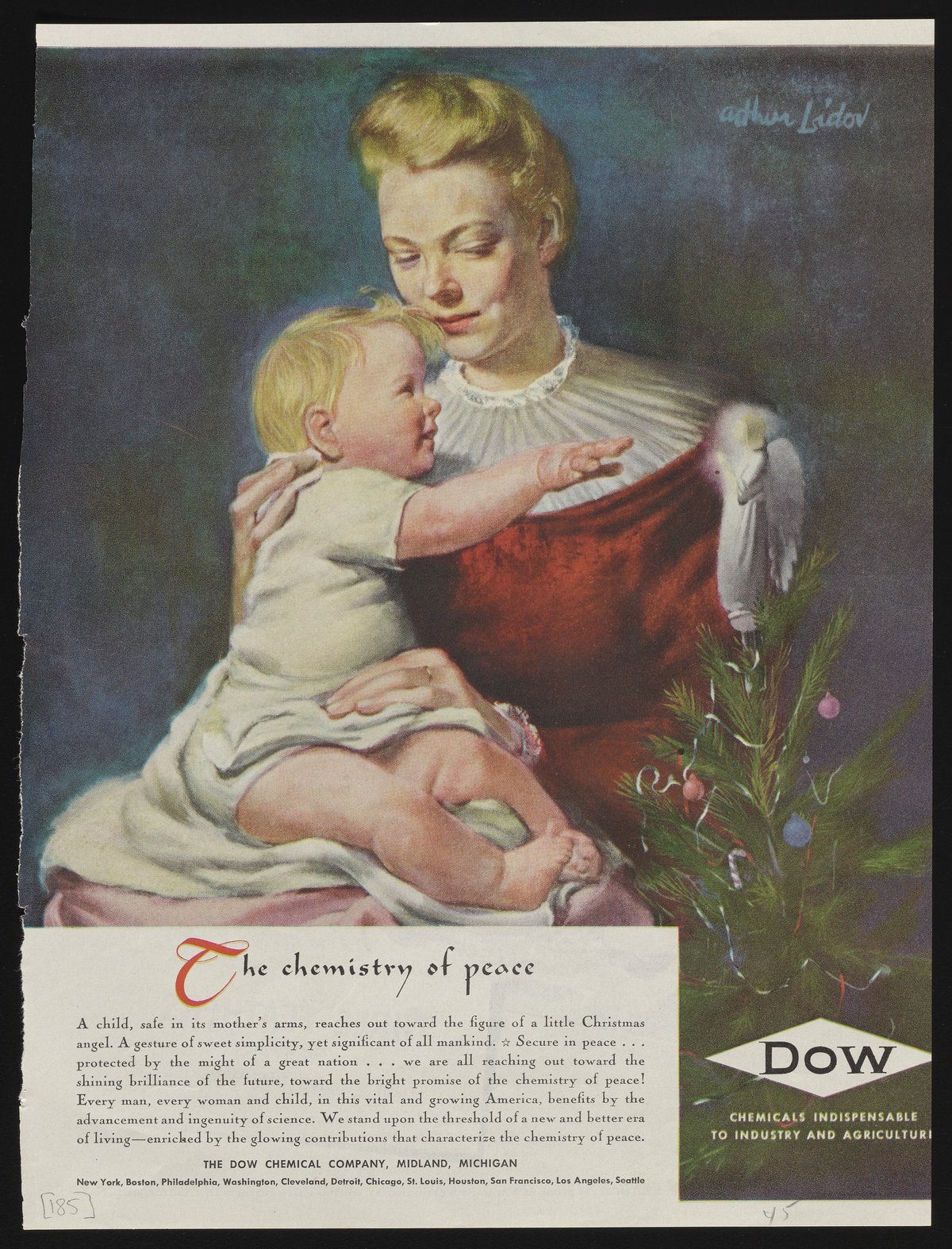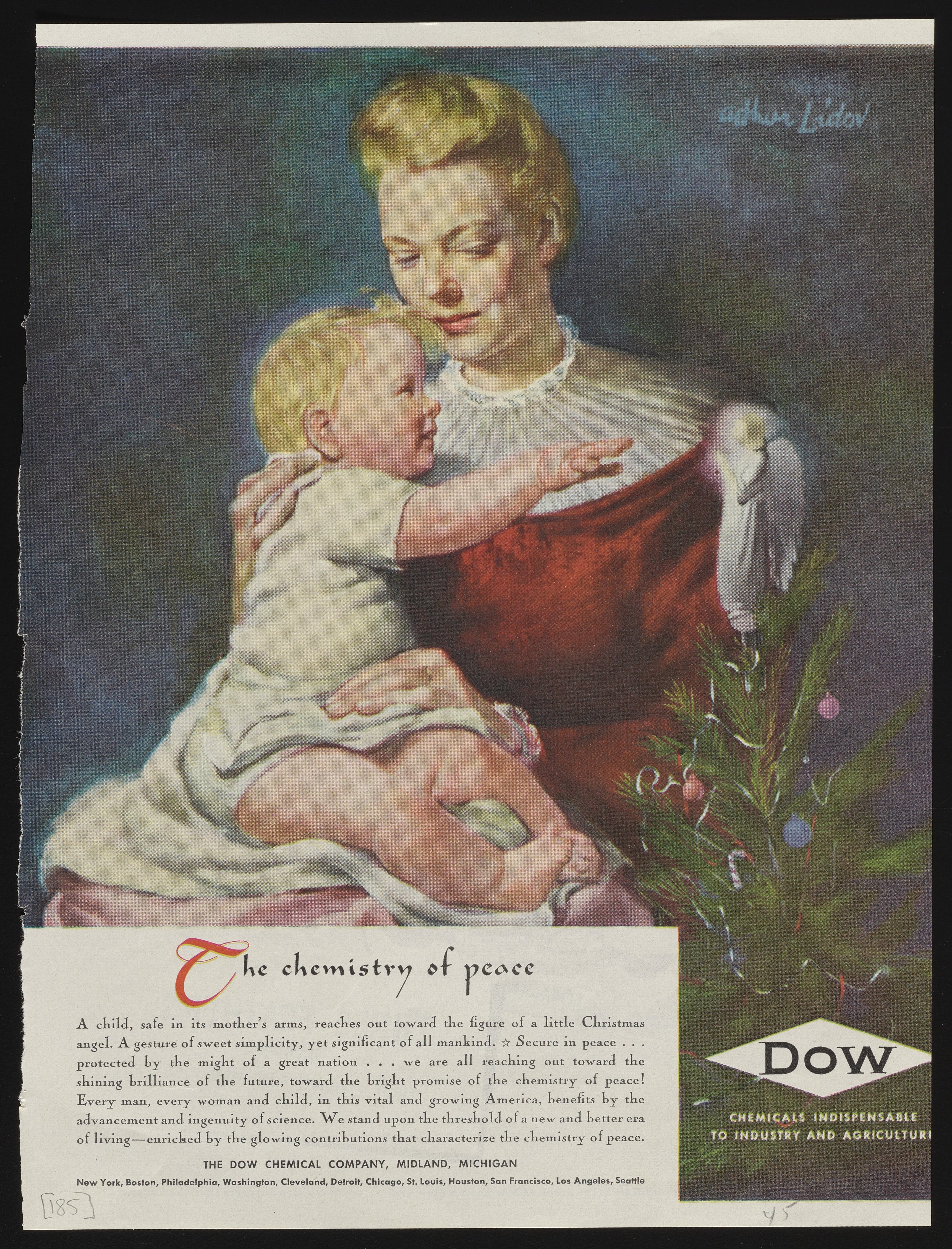 Color print advertisement for the Dow Chemical Company depicting a Christmastime scene of a mother and child intended to evoke the bright promise of scientific advancement and ingenuity, i.e. "the chemistry of peace." Notably, the image is a reproduction of an original oil painting by artist, illustrator, and inventor Arthur Herschel Lidov (1917-1990), who created cover art and illustrations for many national publications, including Time, Fortune, and The Saturday Evening Post.