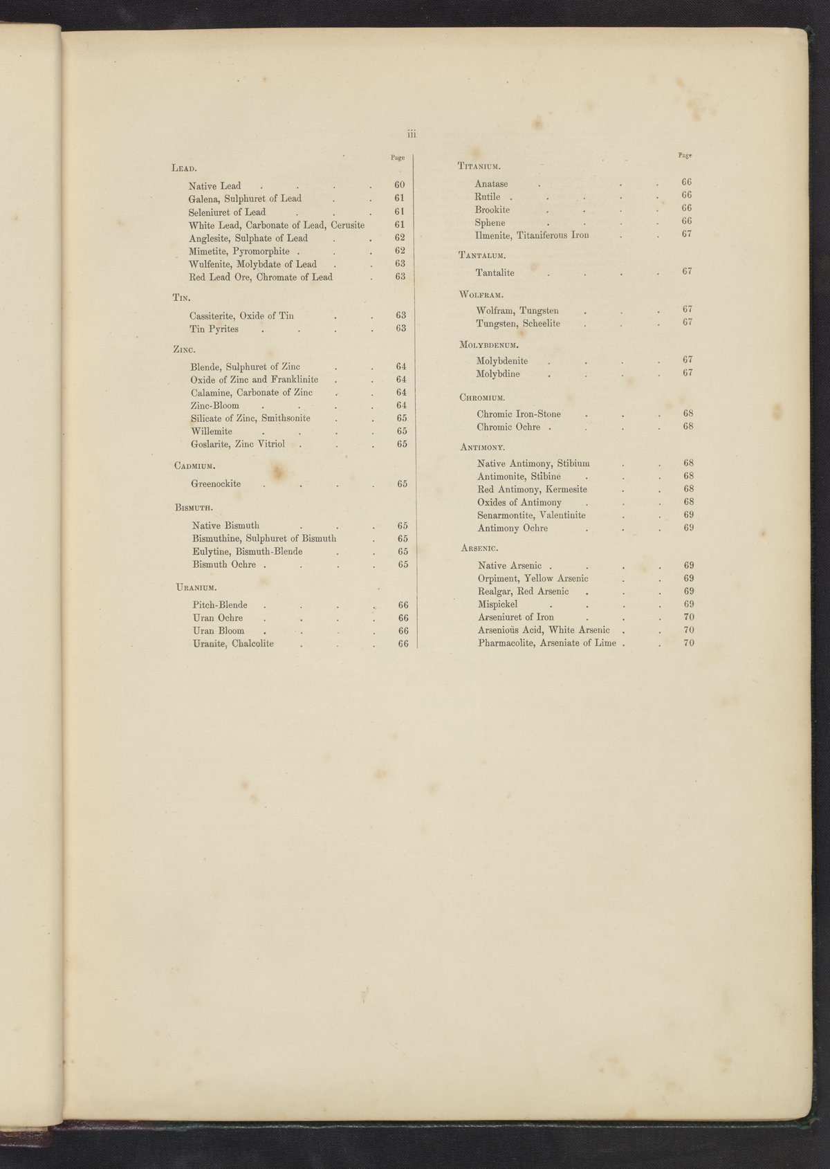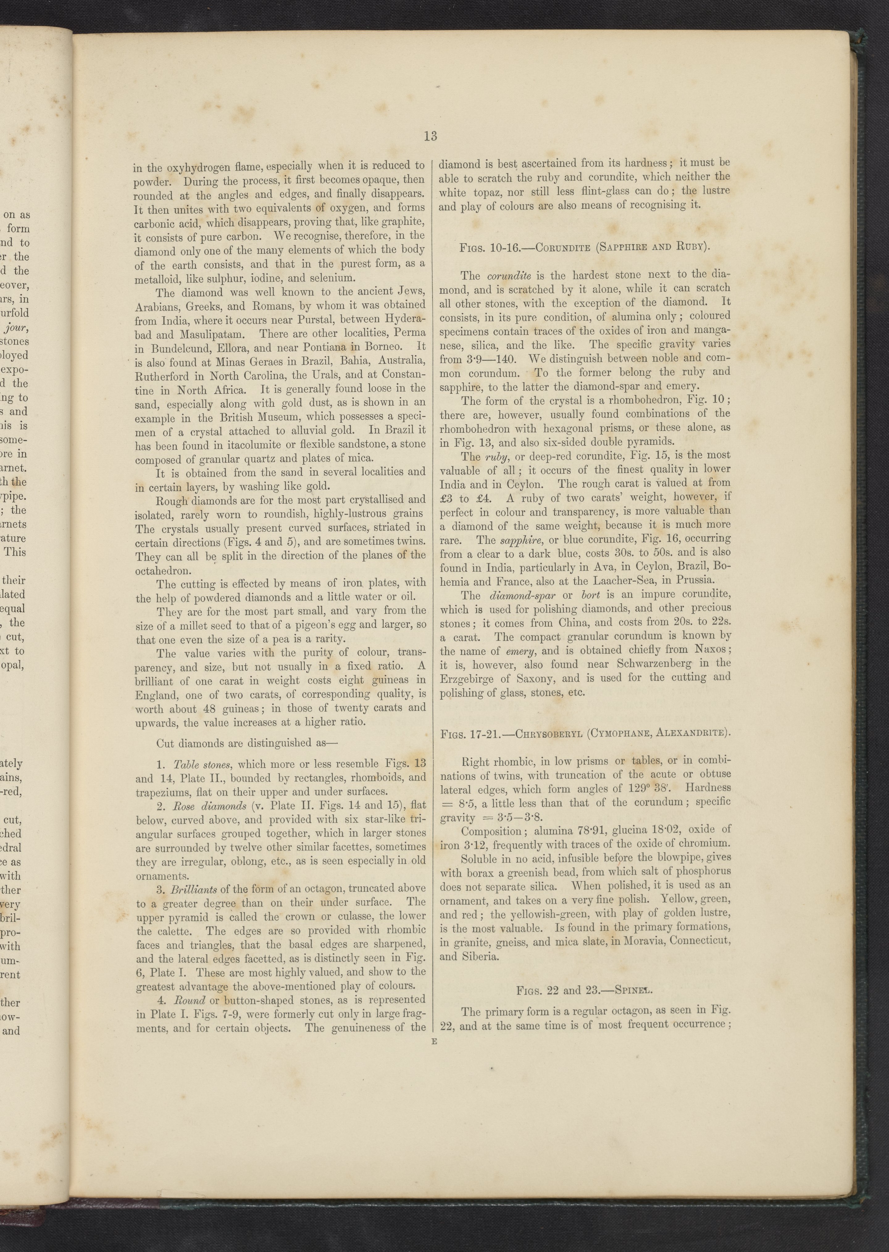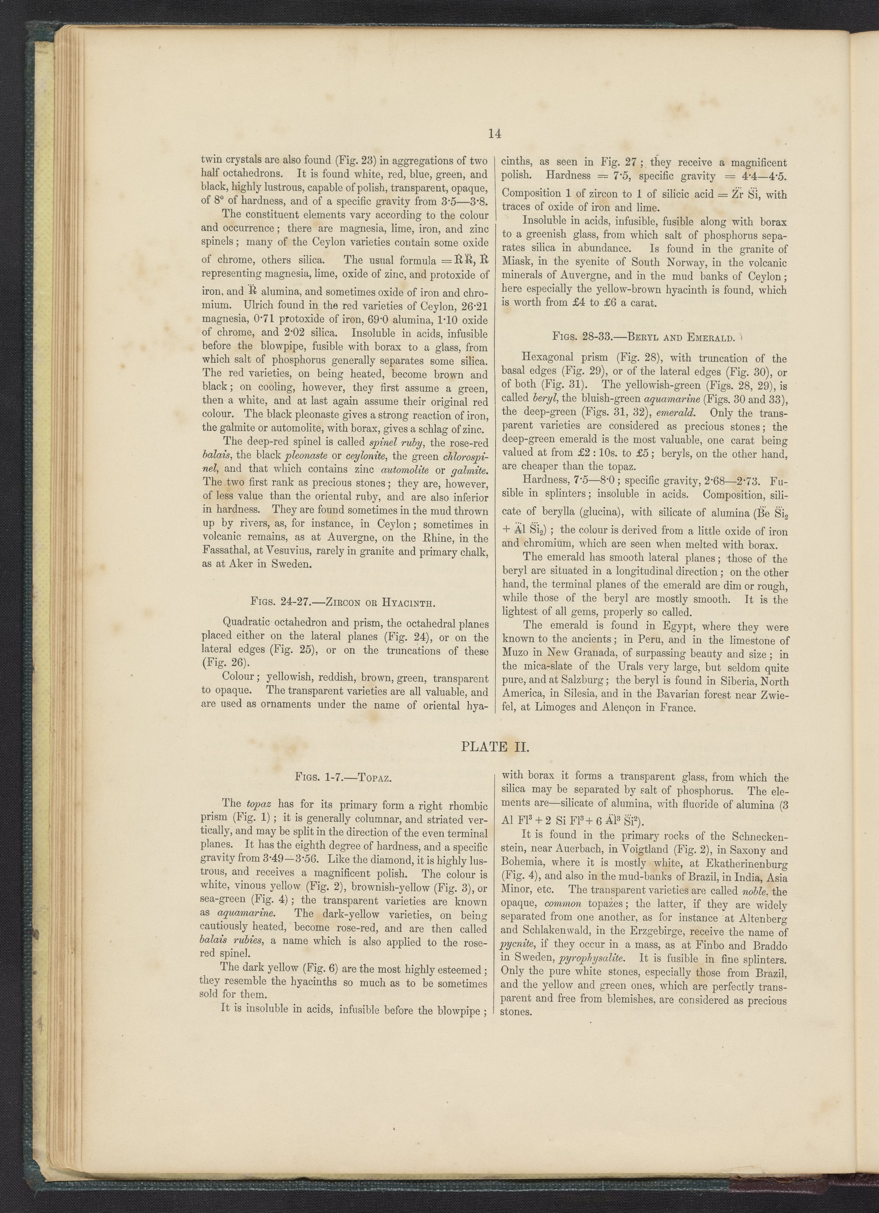 Small JPG1200 x 1673px — 459 KBLarge JPG2880 x 4015px — 2.5 MBFull-sized JPG6448 x 8990px — 9.9 MBOriginal fileTIFF — 6448 x 8990px — 166 MBJohann Gottlob von Kurr (1798-1870) published Das Mineralreich in Bildern as a professor of mineralogy and botany at the Stuttgart Polytechnic Institute in 1858. Digitized in entirety, this first edition English translation of the German Das Mineralreich in Bildern consists of two sections. The first is an introduction including topics such as the formation of crystals and chemical reactions of crystals. Of particular note is a five-page table of the chemical elements (pp. 7-11), consisting of two parts: I. Metalloids, nonmetallic elements; and II. Metals. The second section is devoted to the description of various mineral groups including precious stones, hornblende and augitic minerals, felspathic minerals, micaceous minerals, zeolitic minerals, calcareous minerals, and various salts and compounds. The final pages of the book contain twenty-four lithograph plates depicting crystalline structures and mineral forms. The plates are hand-colored, using metallic finishes to create a lustrous effect.