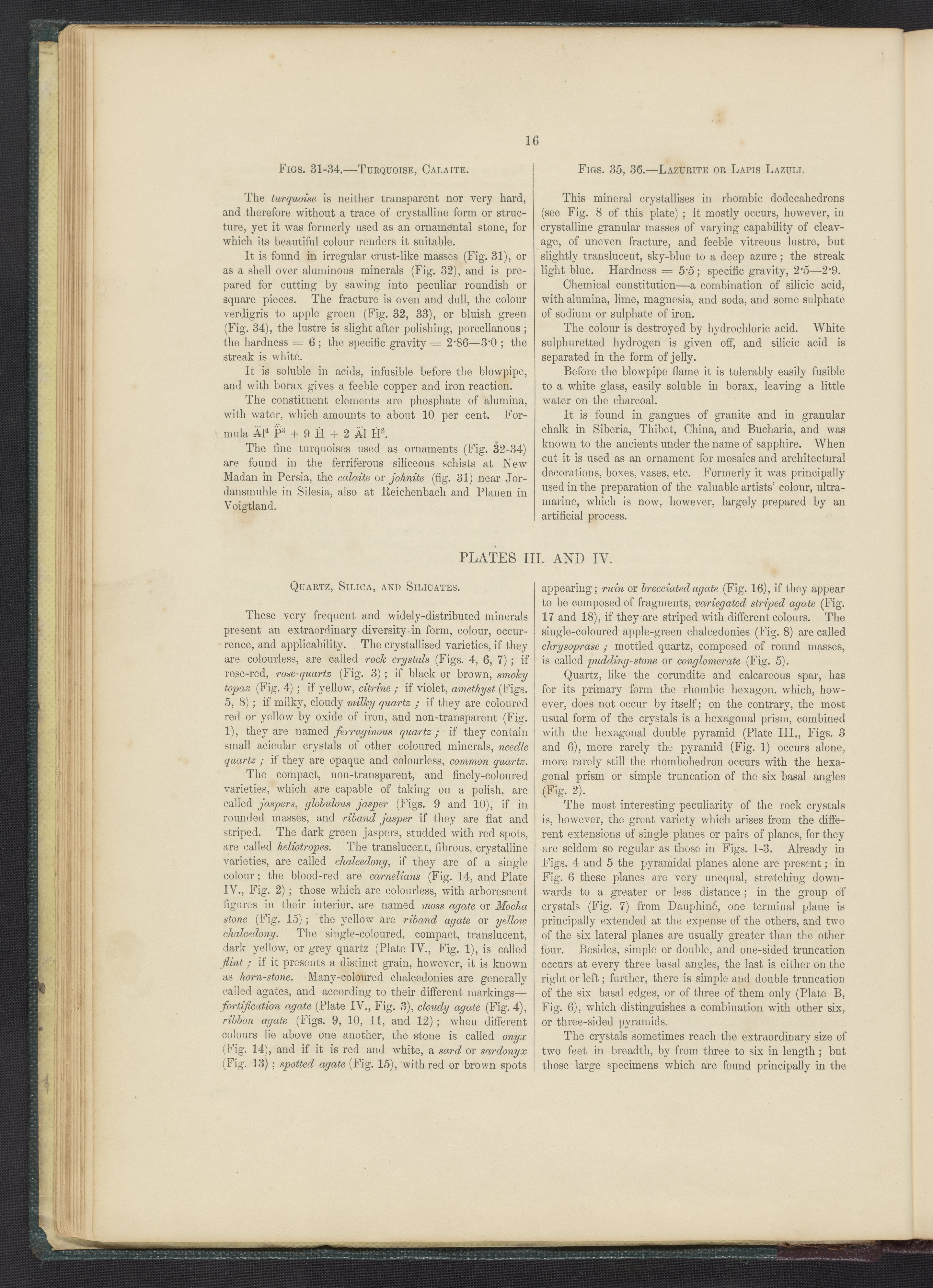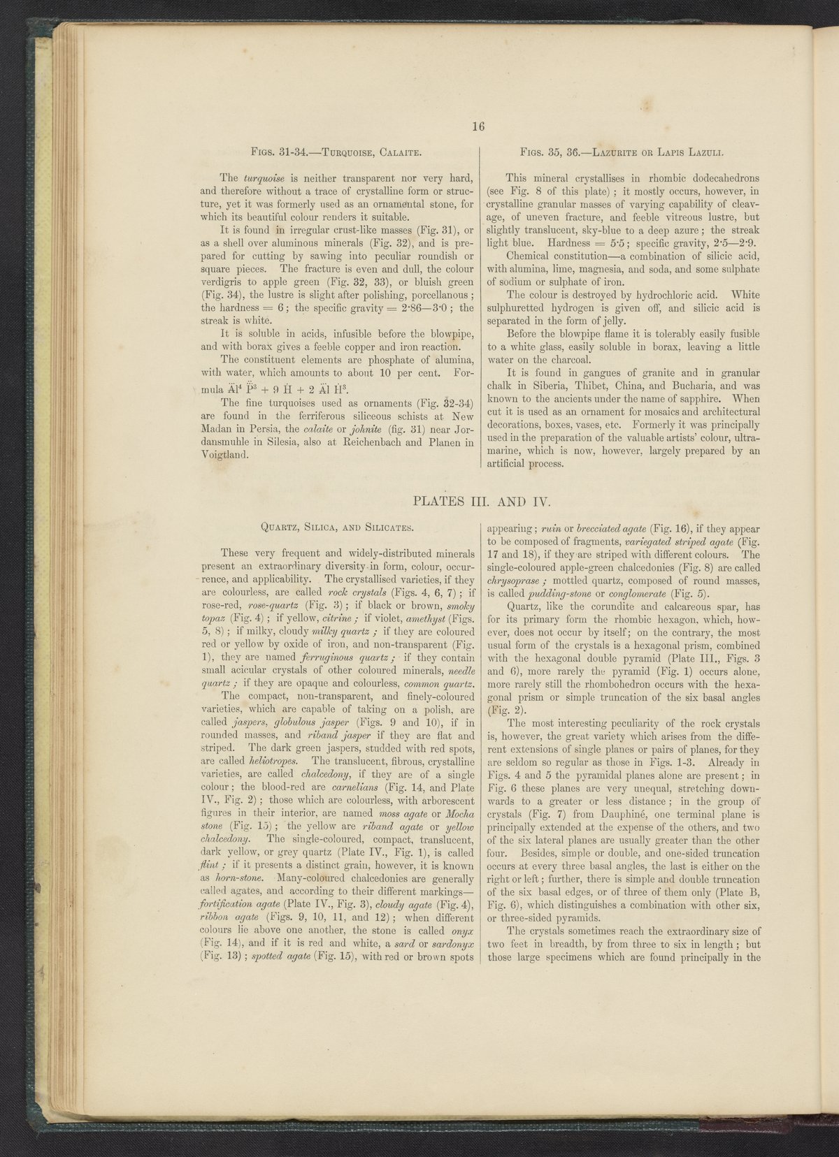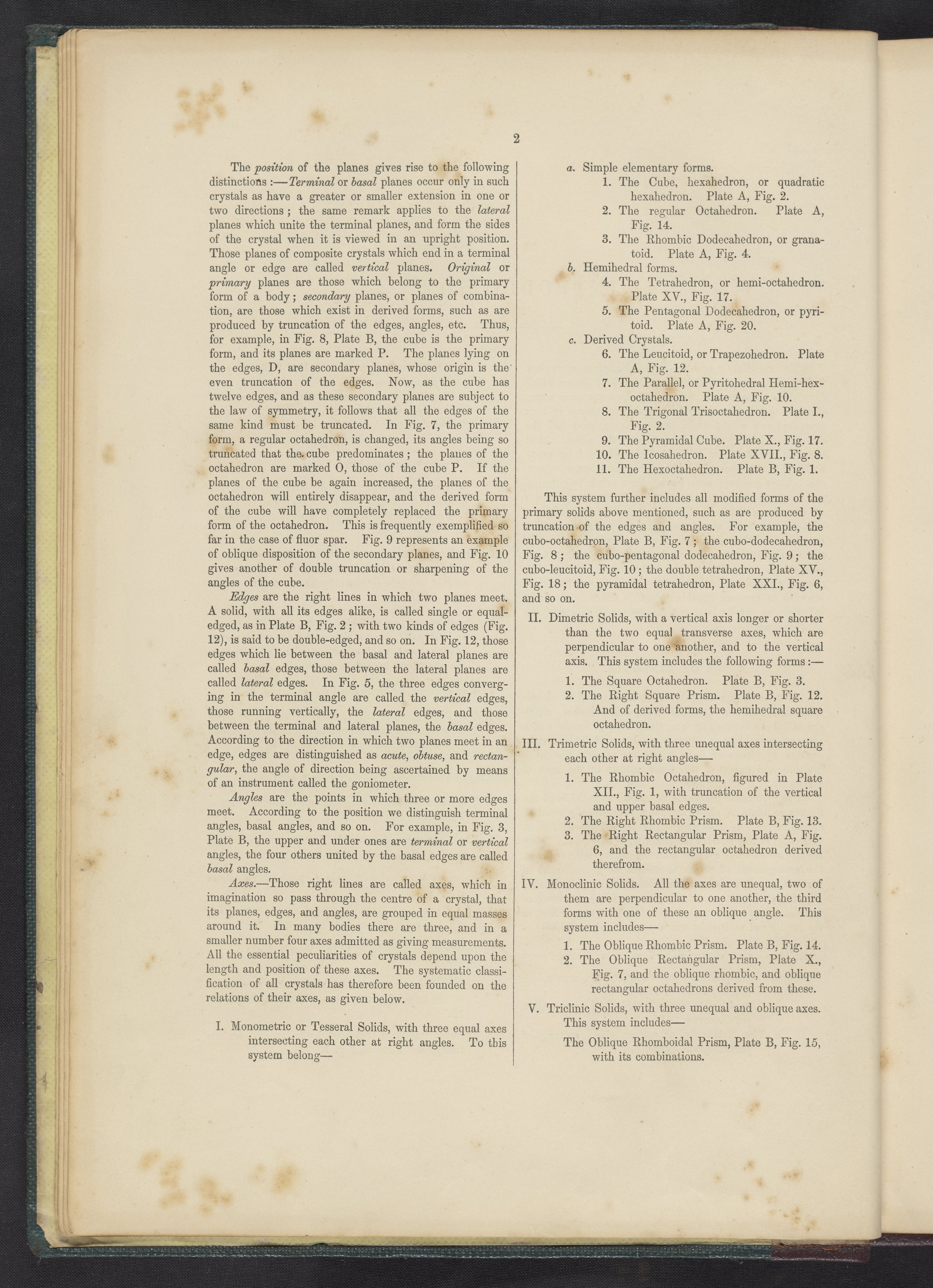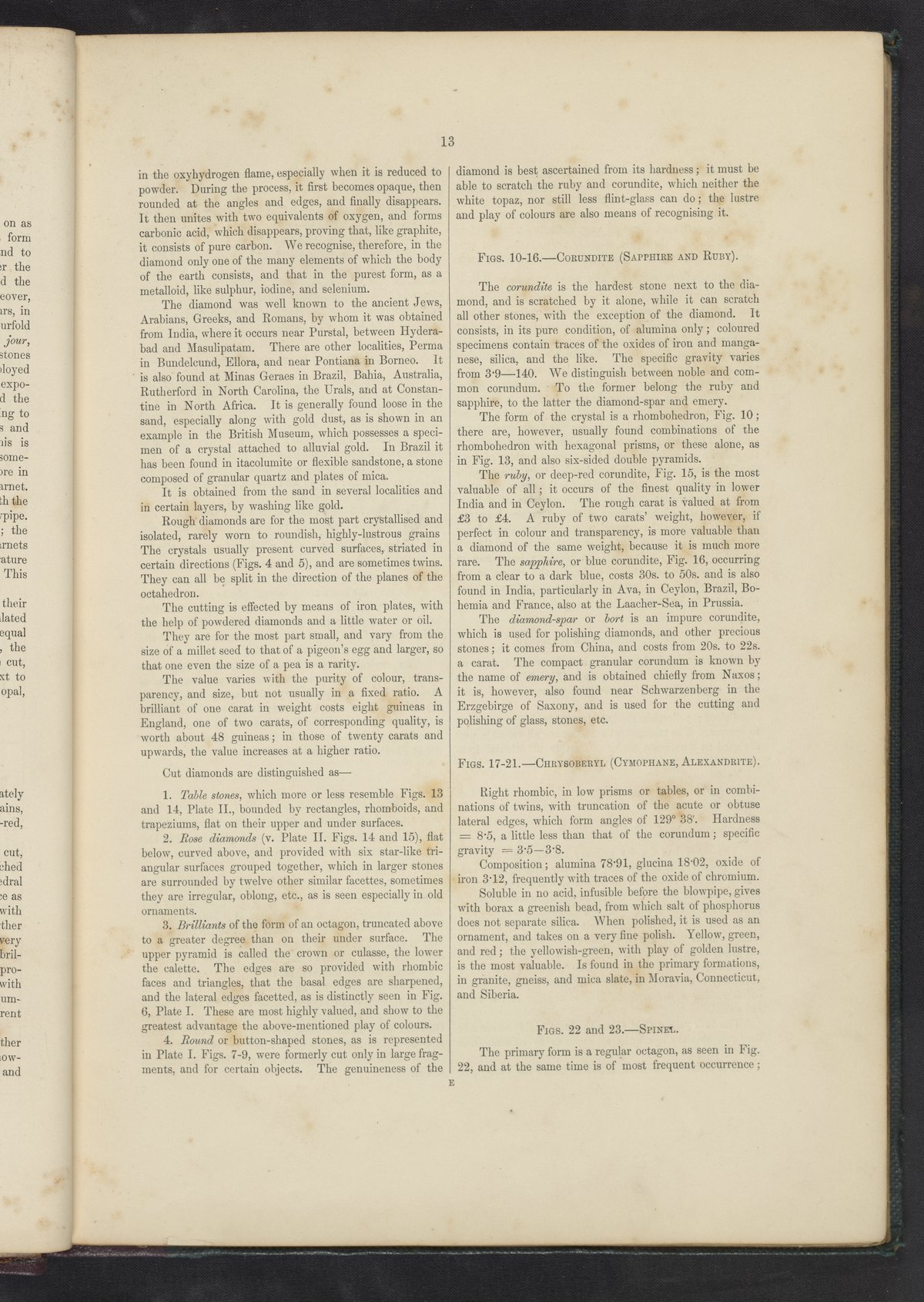 Small JPG1200 x 1673px — 459 KBLarge JPG2880 x 4015px — 2.5 MBFull-sized JPG6448 x 8990px — 9.9 MBOriginal fileTIFF — 6448 x 8990px — 166 MBJohann Gottlob von Kurr (1798-1870) published Das Mineralreich in Bildern as a professor of mineralogy and botany at the Stuttgart Polytechnic Institute in 1858. Digitized in entirety, this first edition English translation of the German Das Mineralreich in Bildern consists of two sections. The first is an introduction including topics such as the formation of crystals and chemical reactions of crystals. Of particular note is a five-page table of the chemical elements (pp. 7-11), consisting of two parts: I. Metalloids, nonmetallic elements; and II. Metals. The second section is devoted to the description of various mineral groups including precious stones, hornblende and augitic minerals, felspathic minerals, micaceous minerals, zeolitic minerals, calcareous minerals, and various salts and compounds. The final pages of the book contain twenty-four lithograph plates depicting crystalline structures and mineral forms. The plates are hand-colored, using metallic finishes to create a lustrous effect.