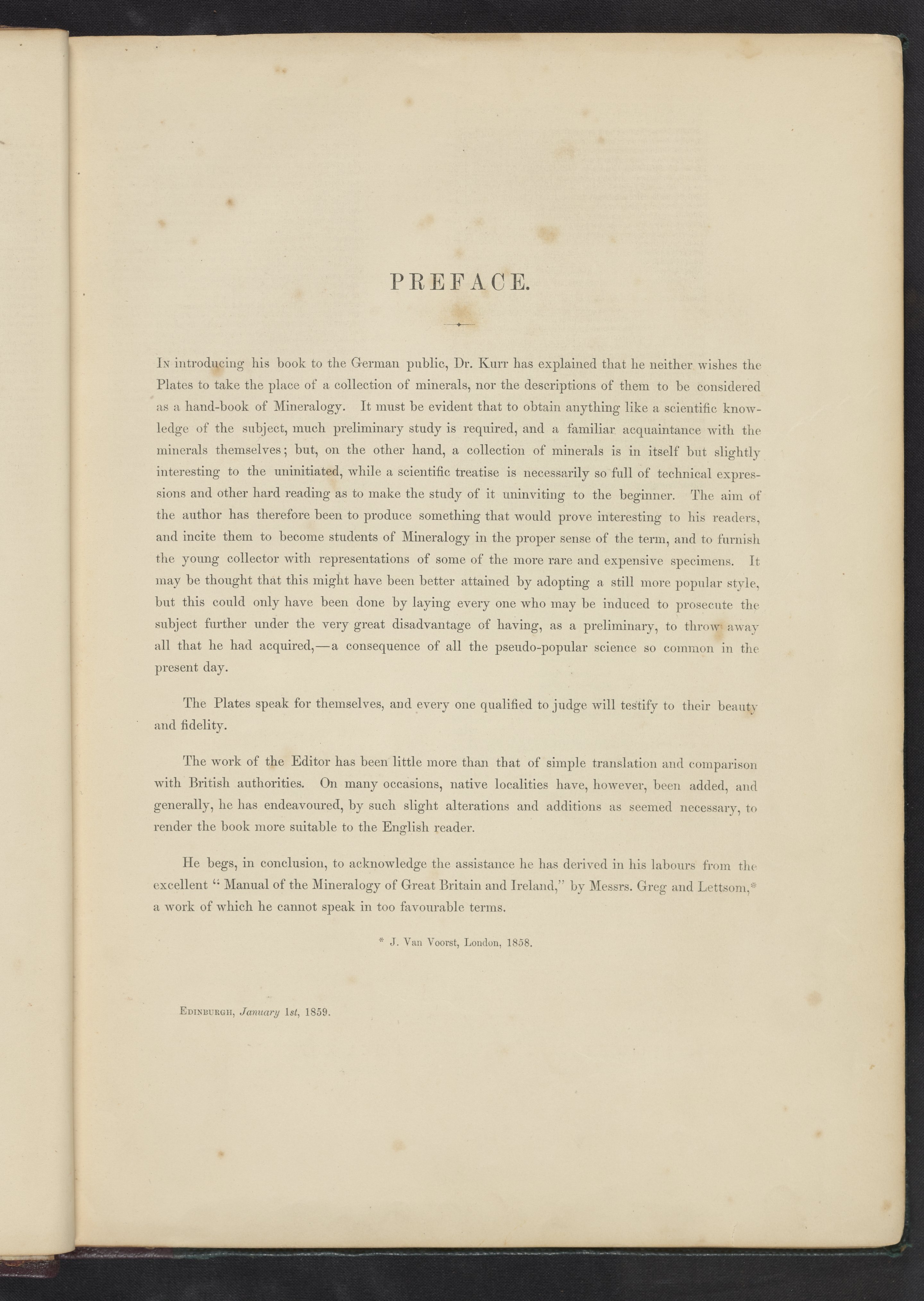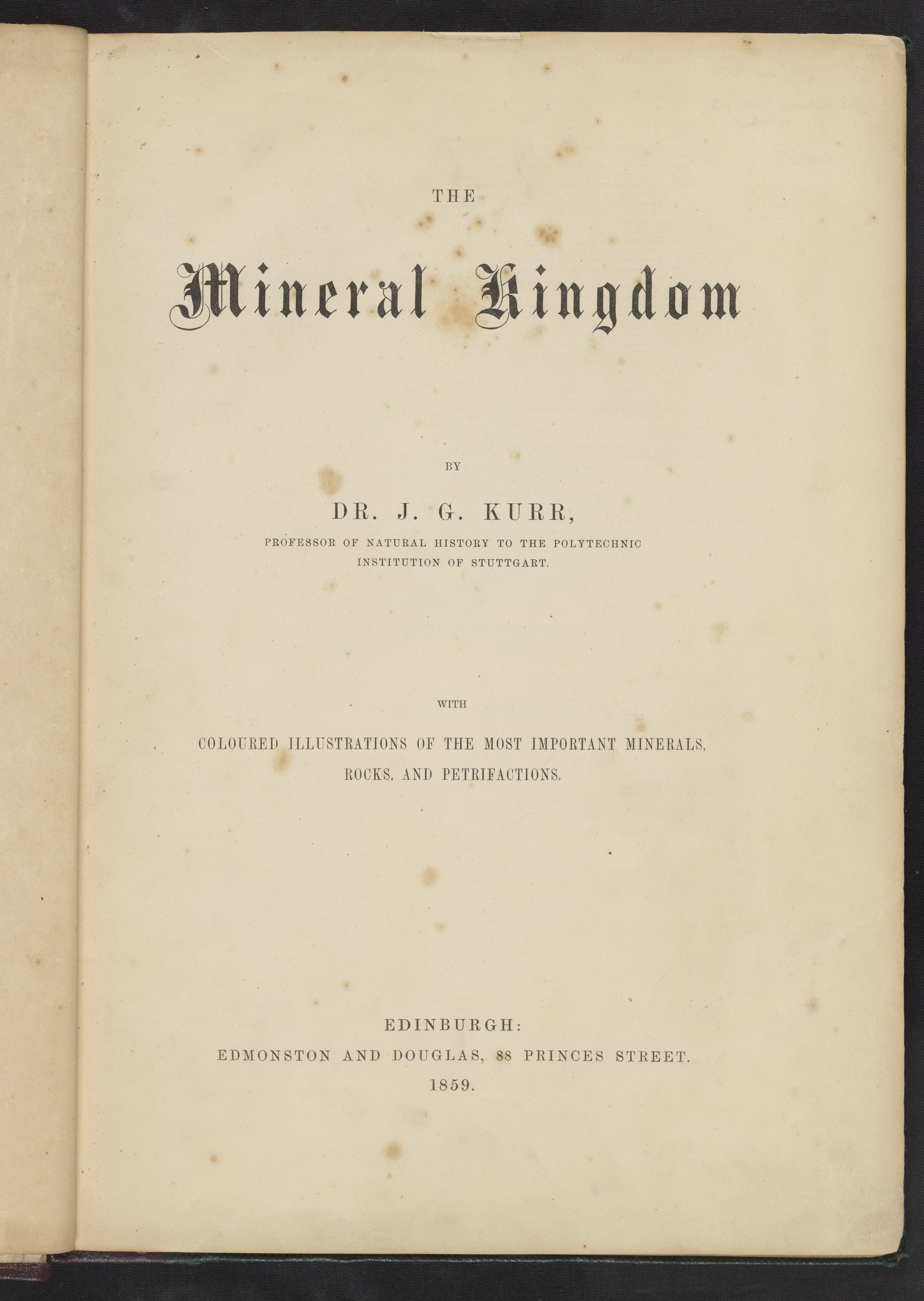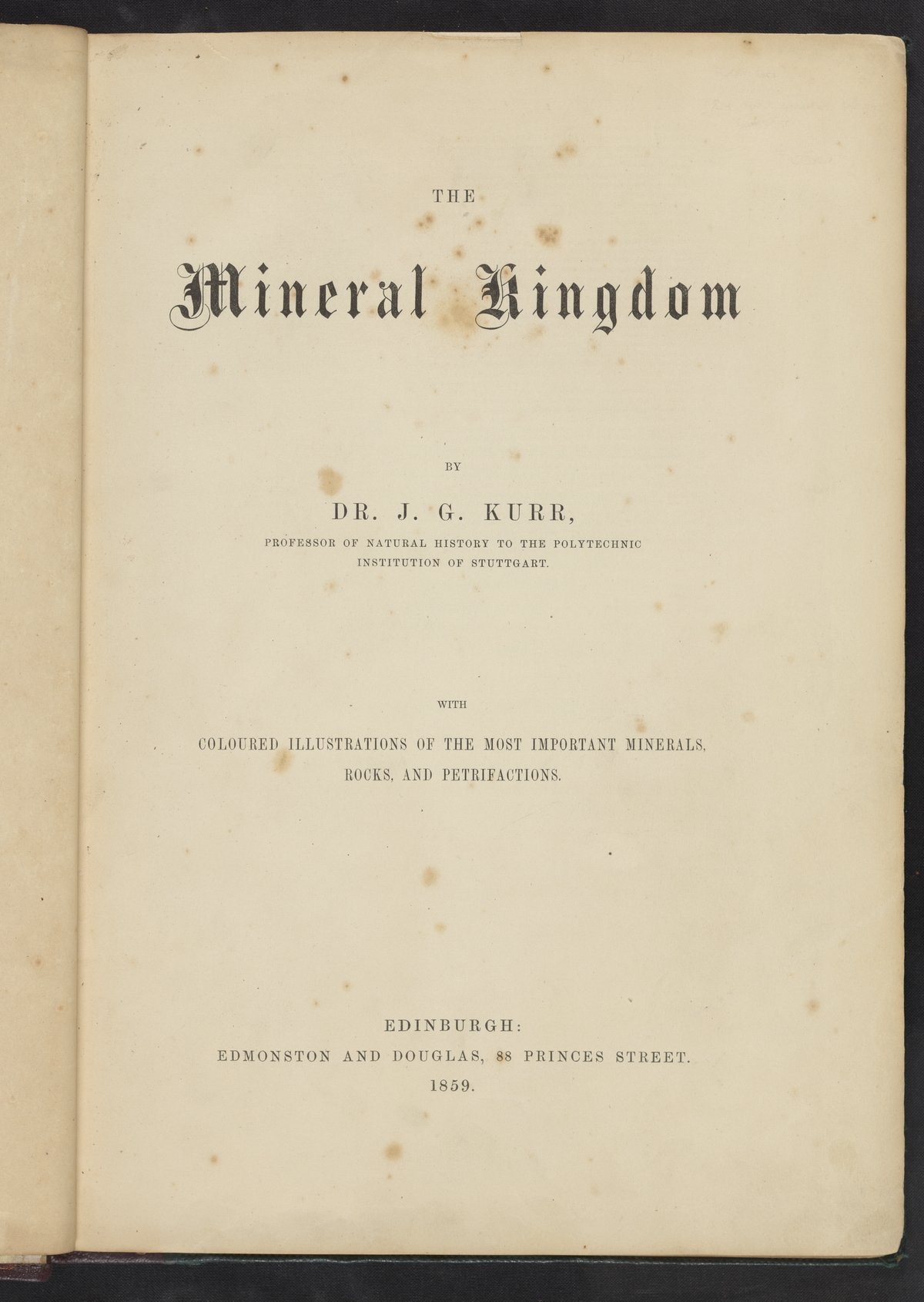 Kurr, J. G. (Johann Gottlob). The Mineral Kingdom. Edinburgh, Scotland: Edmonston and Douglas, 1859. https://digital.sciencehistory.org/works/pr76f4633.