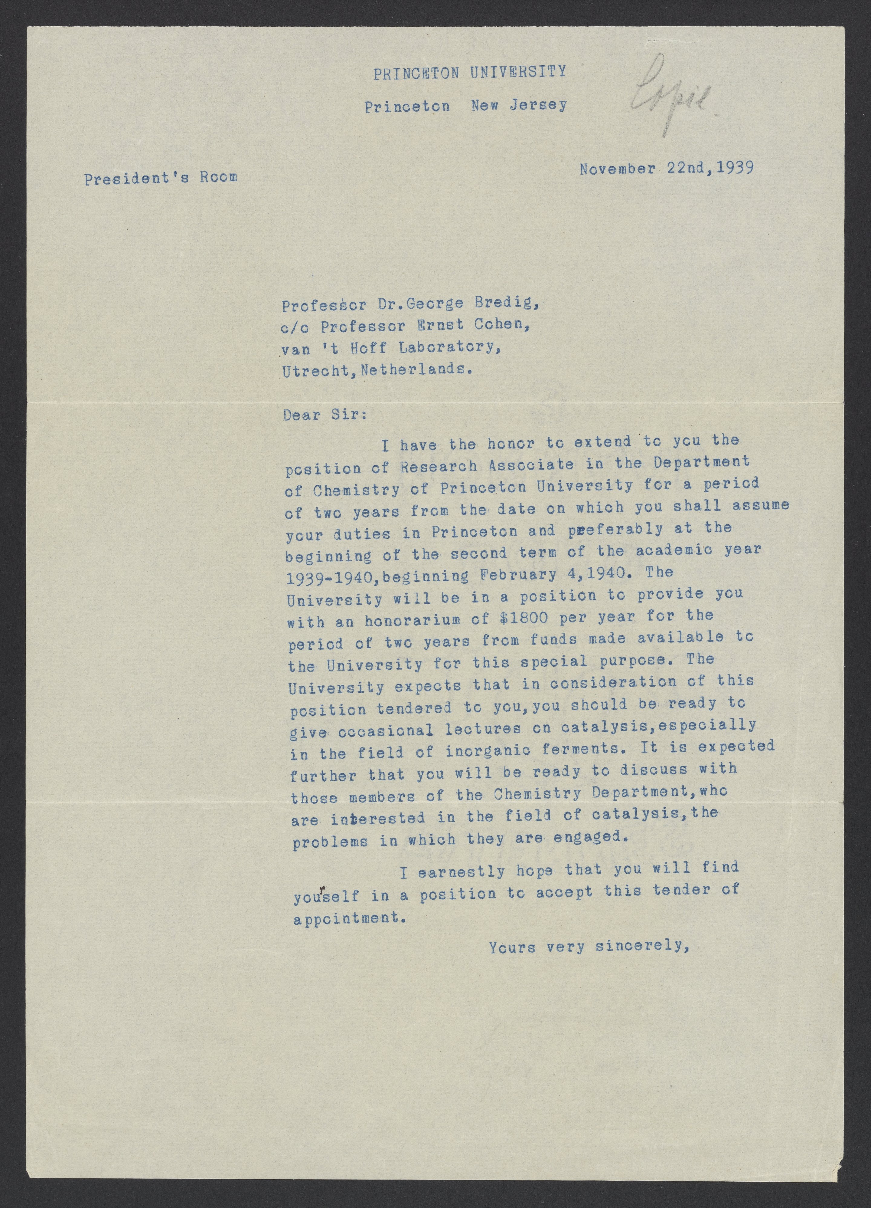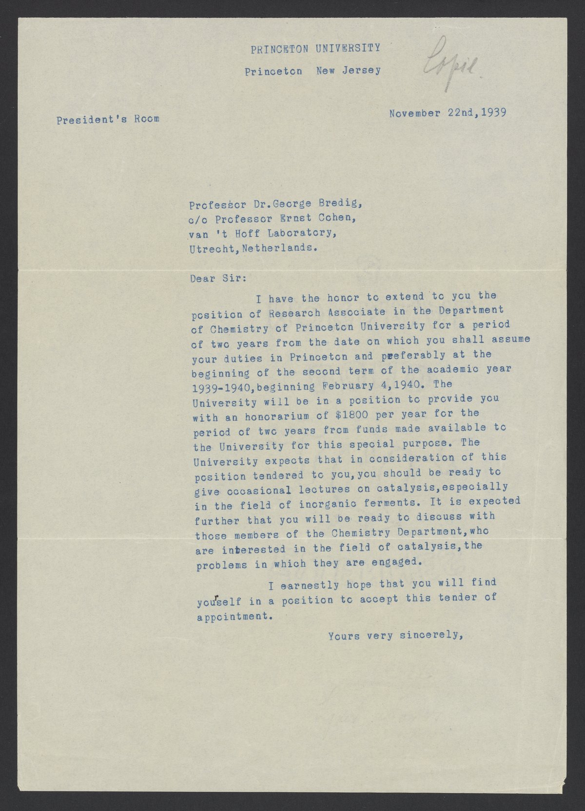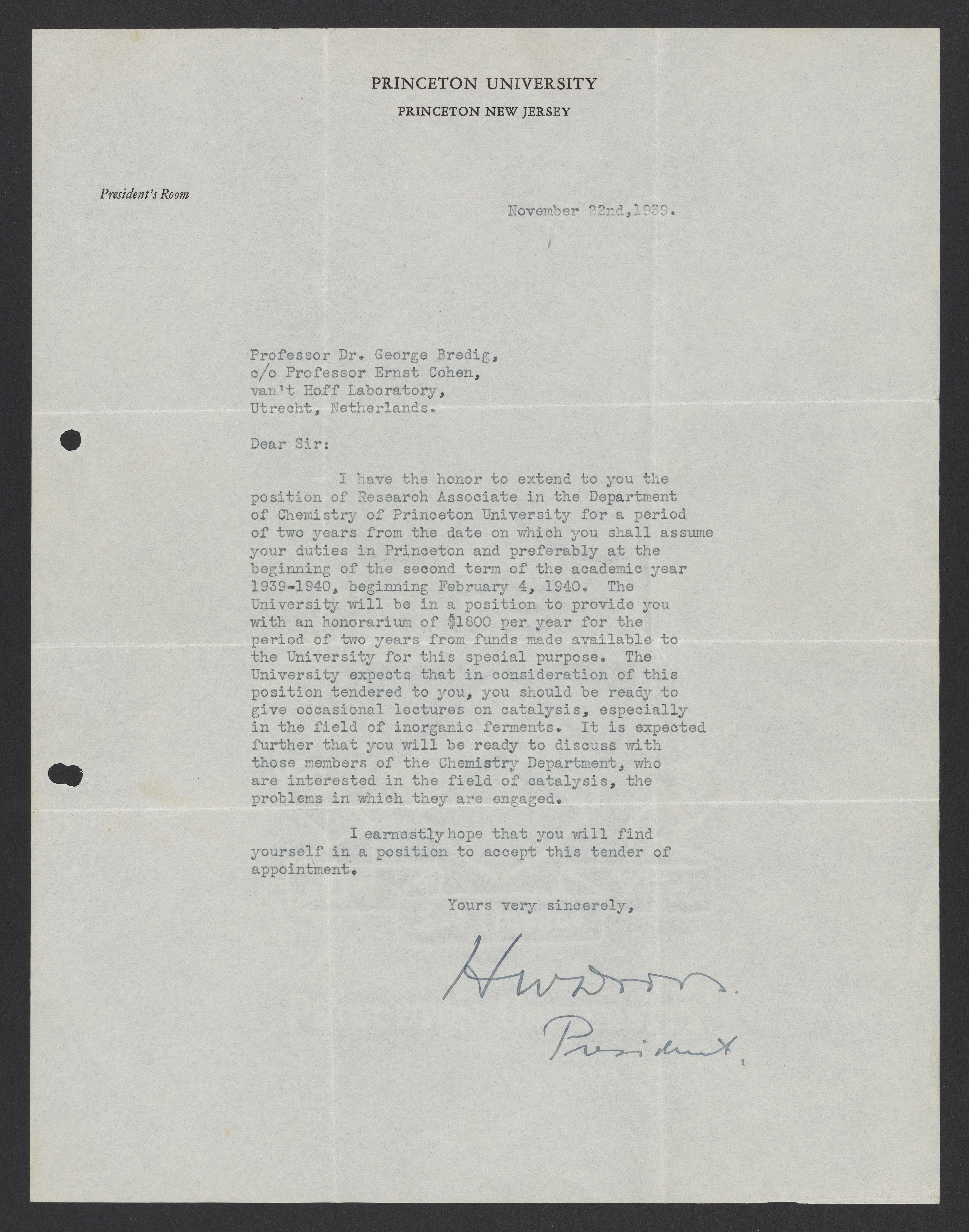 Letter from Harold Willis Dodds to Georg Bredig, November 22, 1939