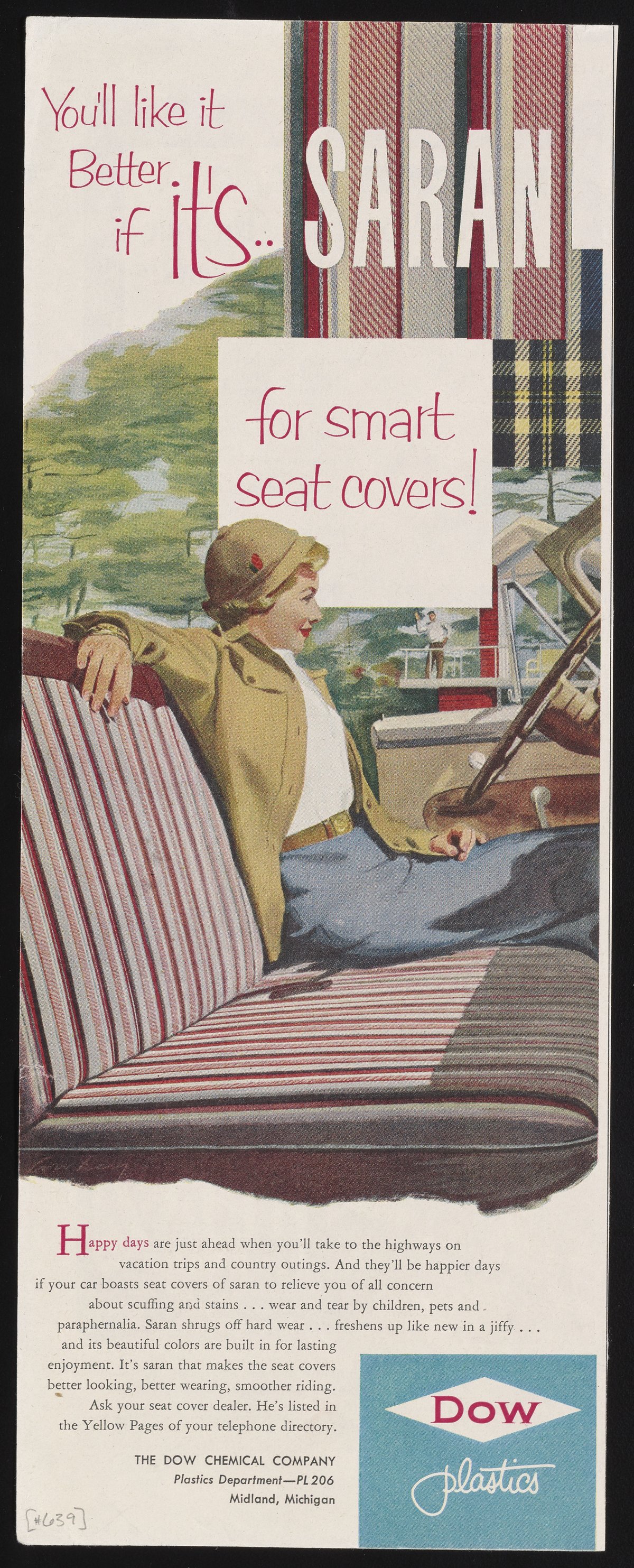 Dow Chemical Company. “You'Ll Like It Better If It'S...SARAN for Smart Seat Covers!,” 1950–1959. Advertisements from the Dow Chemical Historical Collection, Box 9. Science History Institute. Philadelphia. https://digital.sciencehistory.org/works/psazdkz.