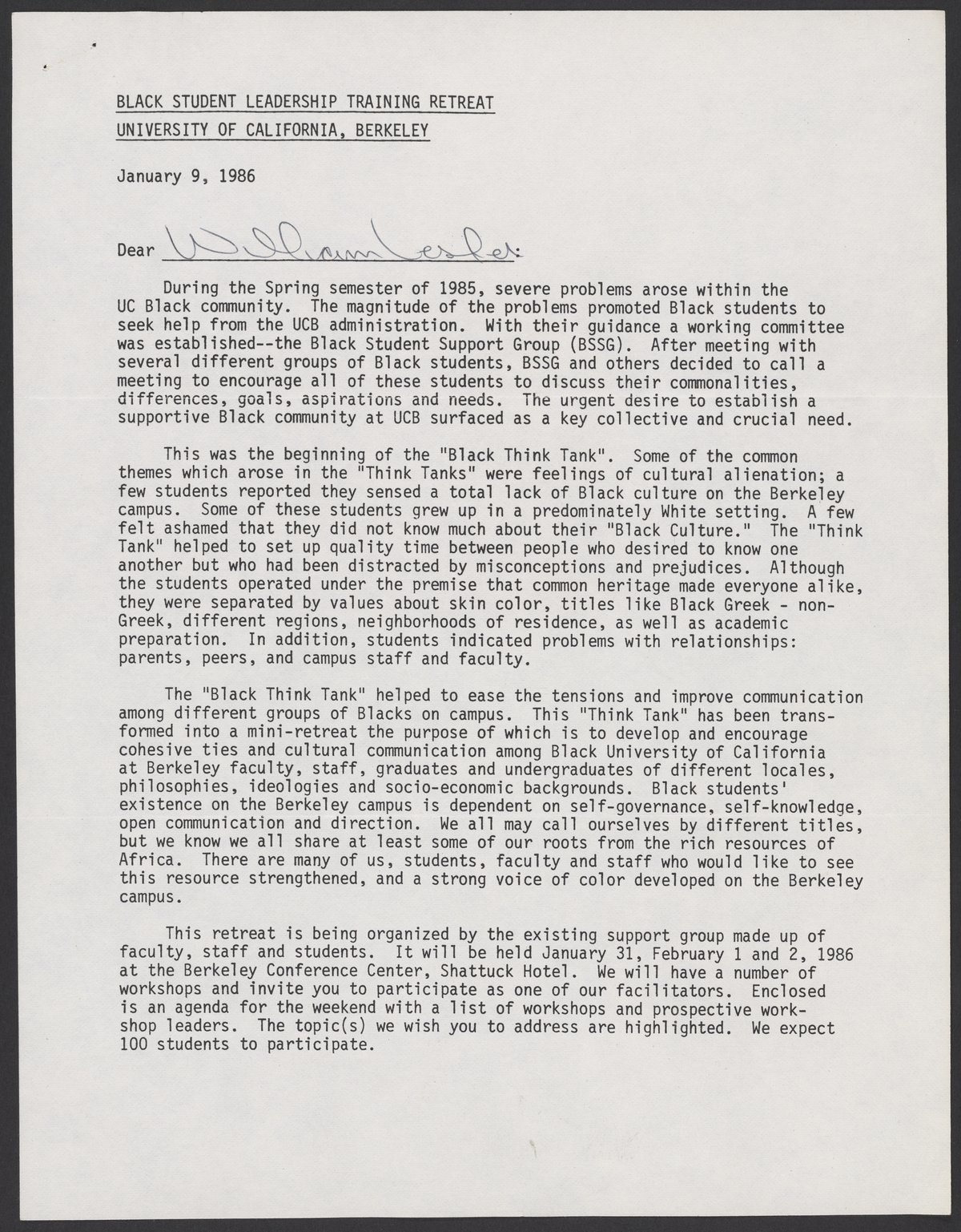 Letter from the Black Student Leadership Committee at the University of California, Berkeley, inviting William A. Lester, Jr. (1937-) to participate in an upcoming retreat.