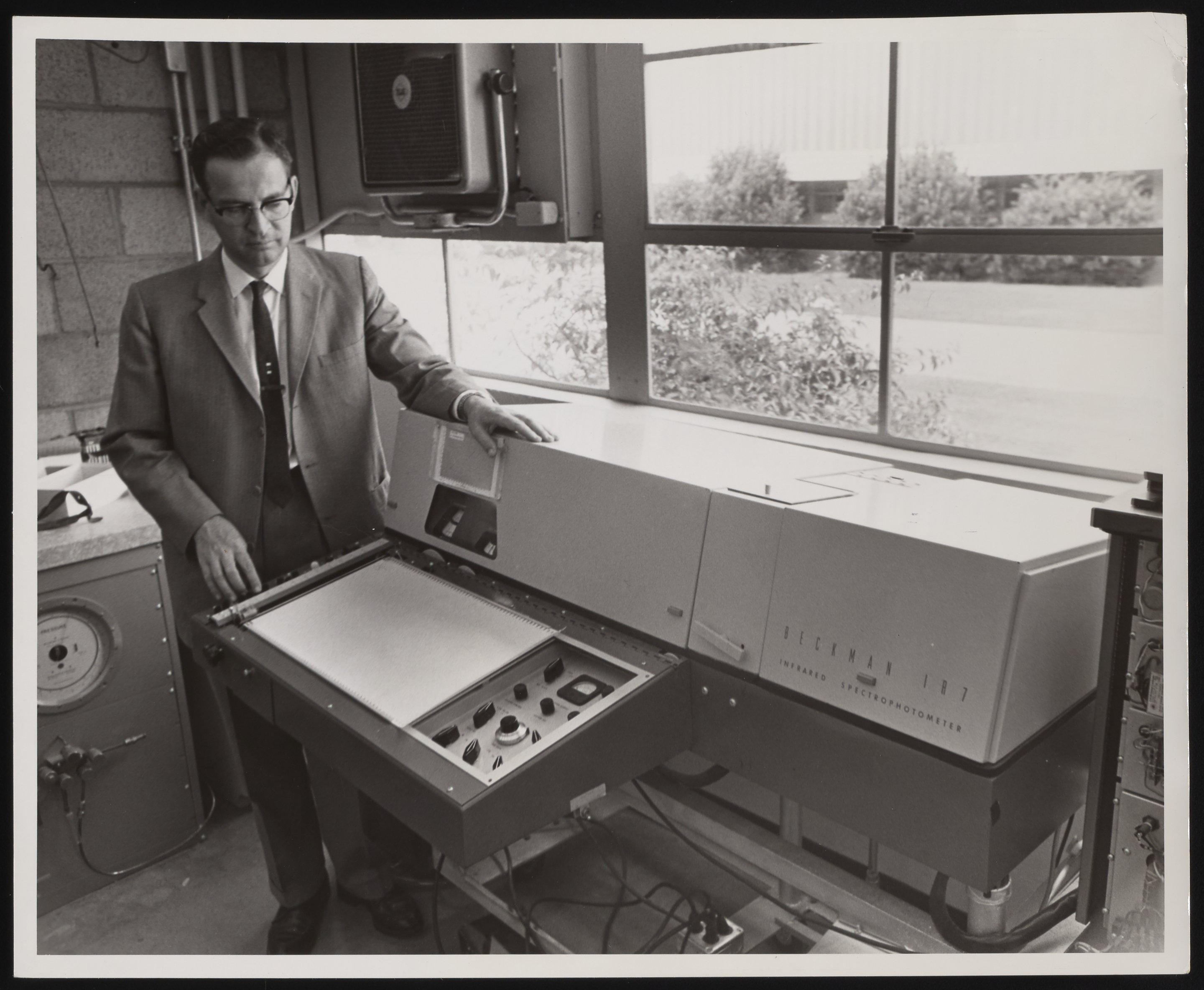 “Unidentified Man Standing beside a Beckman IR-7 Spectrophotometer in Front of a Window,” 1958. Beckman Historical Collection, Box 83. Science History Institute. Philadelphia. https://digital.sciencehistory.org/works/pv63g044x.