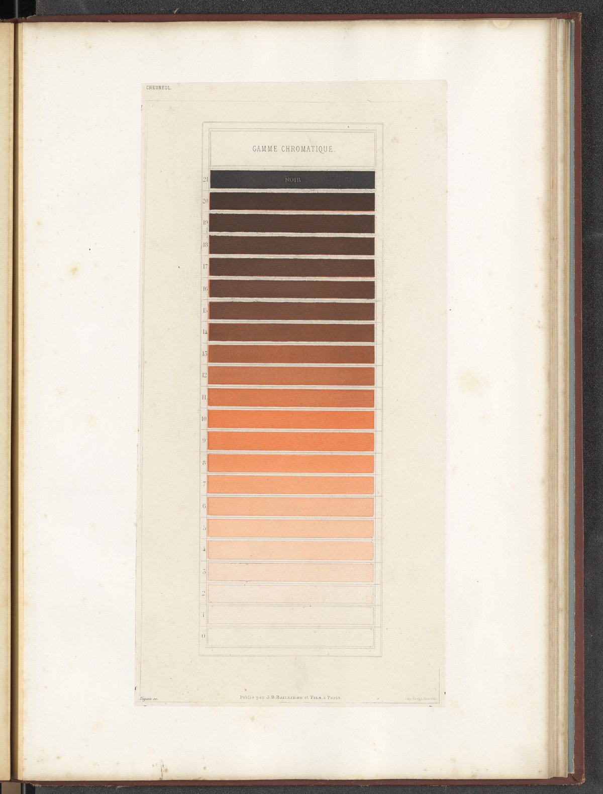 Chevreul, M. E. (Michel Eugène). “Plate XVII: Gamme Chromatique: Rouge-Orangé.” In Des Couleurs Et De Leurs Applications Aux Arts Industriels à l'Aide Des Cercles Chromatiques. Paris, France: J.-B. Baillière et fils, 1864. https://digital.sciencehistory.org/works/pv63g0456.