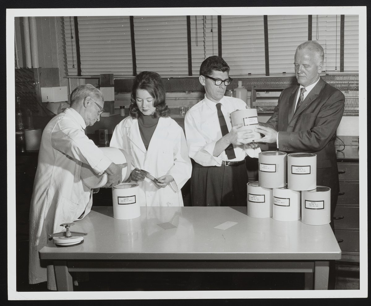 Laboratory staff in the High Polymer Division of the Naval Air Engineering Center's Aeromaterials Laboratory examining the first batches of new NARPOL polymers used to coat aircraft metals. The individuals in the photograph are identified as follows (from left): Mr. Ted Baird (Laboratory assistant); Miss Anna M. Kershner (Co-op student); Mr. Art Stander (Chemist); and Mr. William W. Howerton (Chemist).