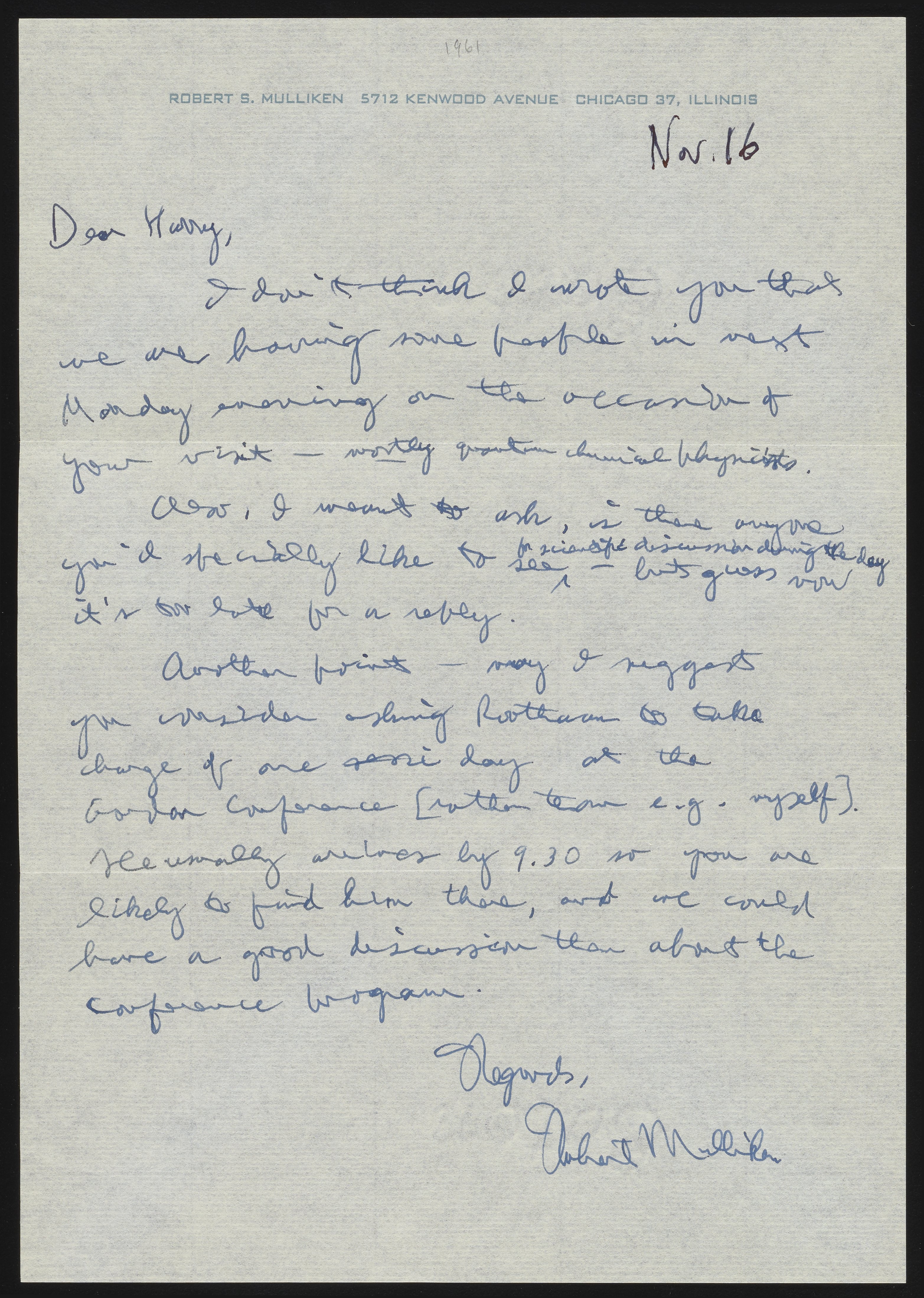 Letter from Robert S. Mulliken to Harrison Shull, 1961