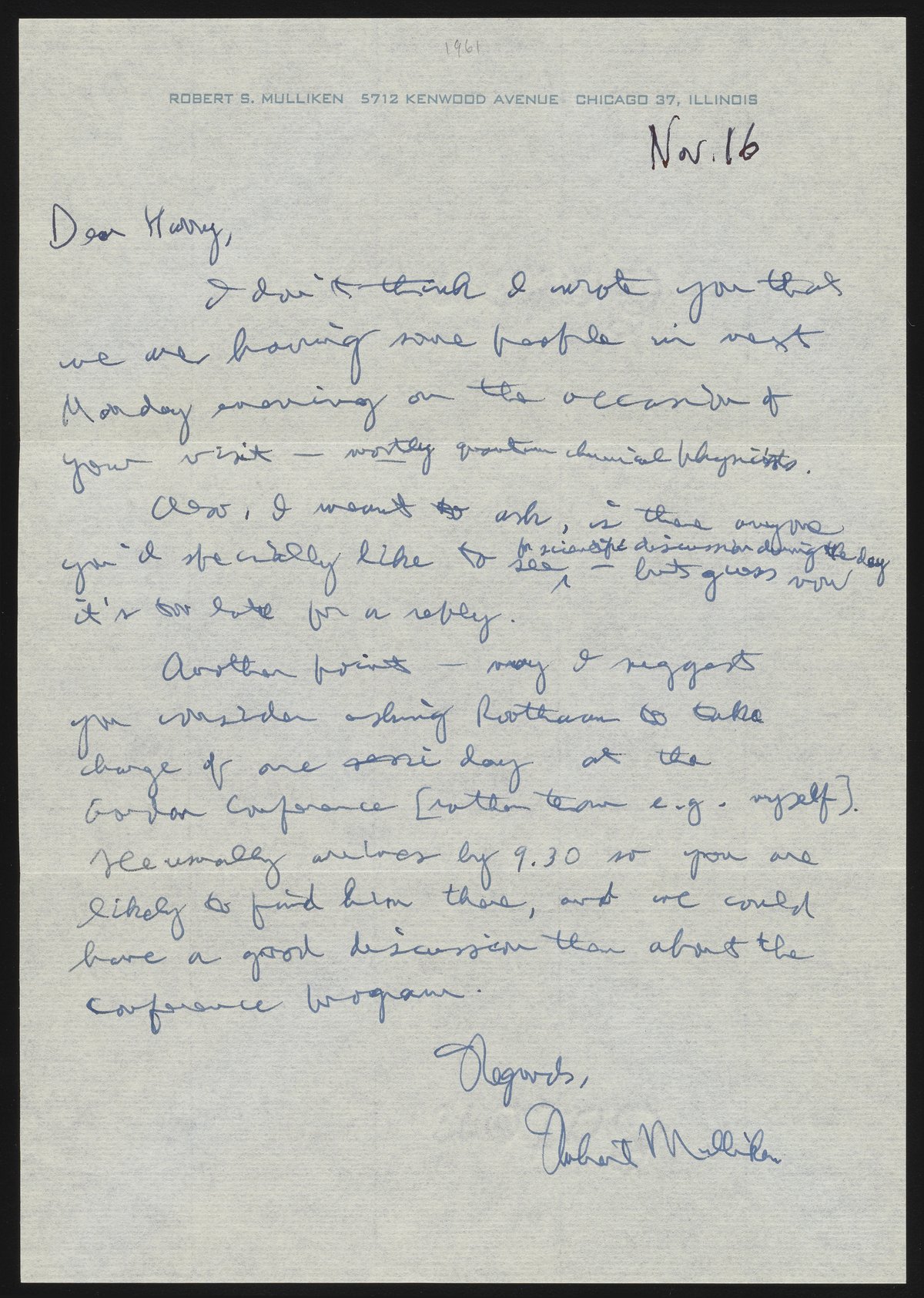 Small JPG1200 x 1685px — 421 KBLarge JPG2880 x 4045px — 2.3 MBFull-sized JPG3130 x 4396px — 2.7 MBOriginal fileTIFF — 3130 x 4396px — 39.4 MBRobert Mulliken (1896-1986) writes to Harrison Shull (1923-2003) regarding an upcoming visit by Shull. Mulliken informs Shull that he will have some physicists visiting for the occasion, and requests Shull ask Clemens C. J. Roothaan (1918-2019) to oversee the Gordon Research Conference for one day.