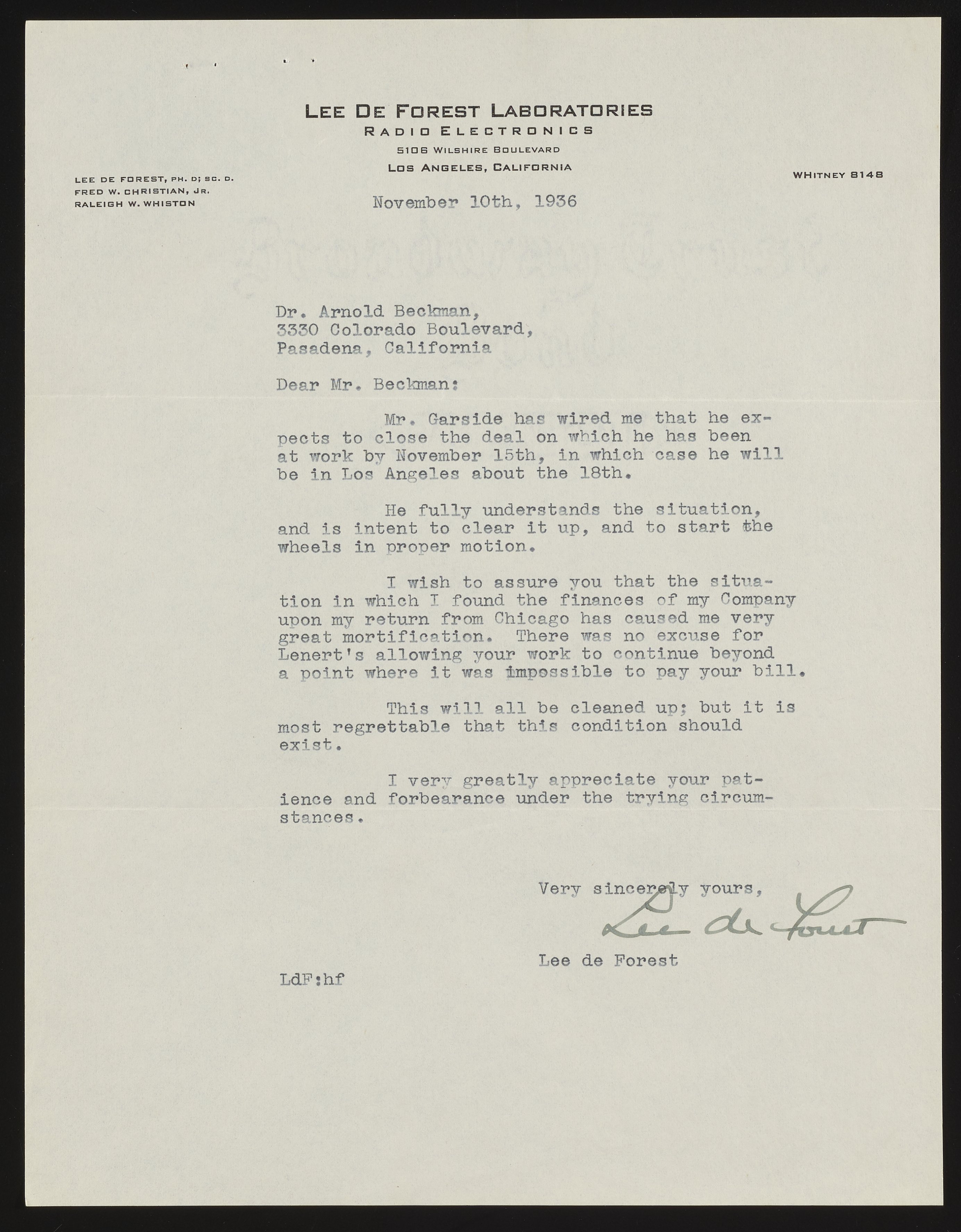 Letter from Lee de Forest to Arnold O. Beckman