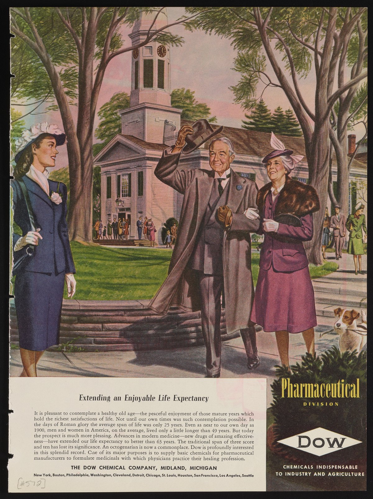 Color print advertisement for Dow Chemical Pharmaceutical Division. The advertisement features an illustrated scene of an elderly couple leaving church. The accompanying text attributes increases in life expectancy to advances in modern medicine and pharmaceuticals aided by companies like Dow.