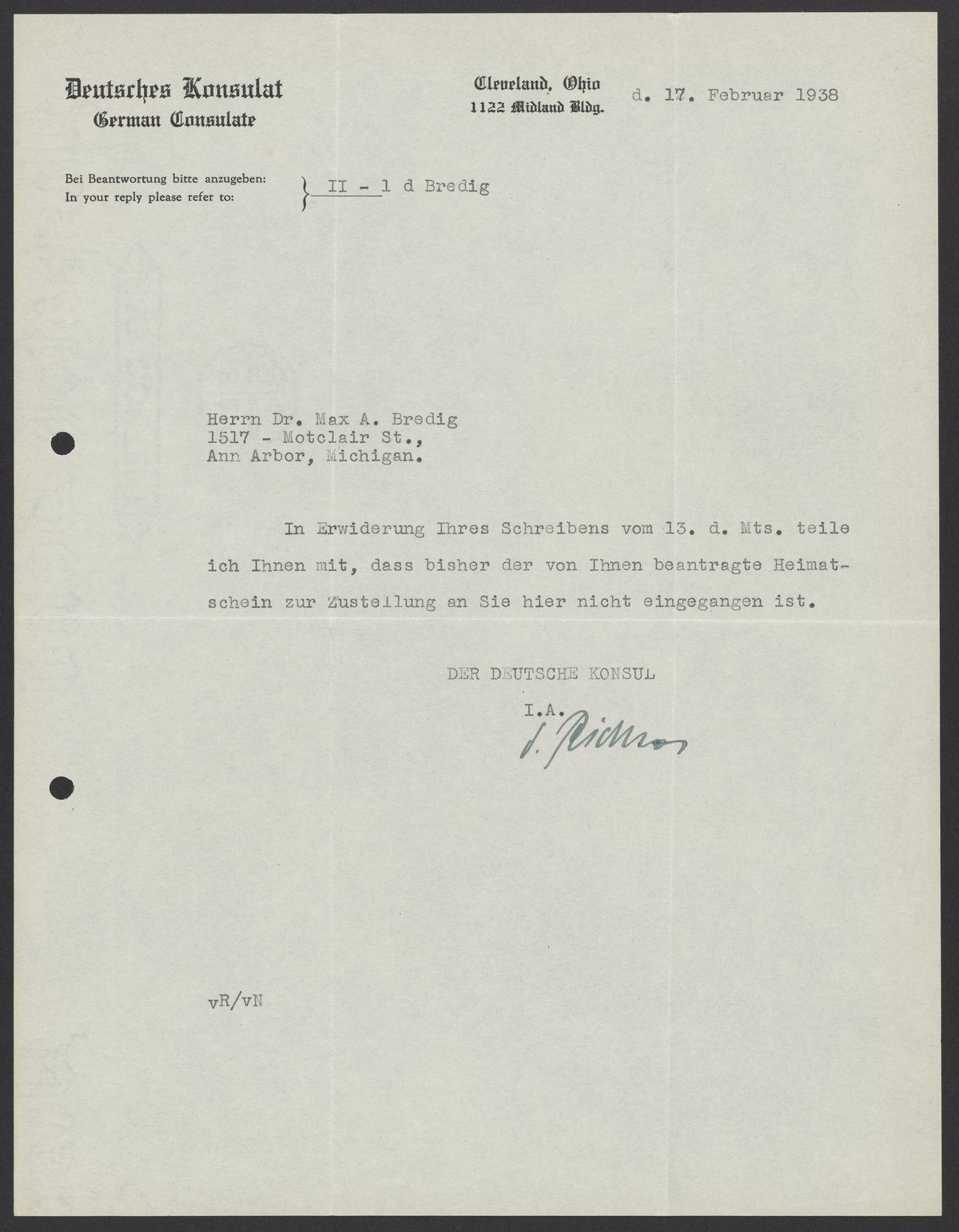 Diplomatic. “Letter from the German Consul to Max Bredig, February 17, 1938,” February 17, 1938. Papers of Georg and Max Bredig, Box 7, Folder 37. Science History Institute. Philadelphia. https://digital.sciencehistory.org/works/q0dja60.