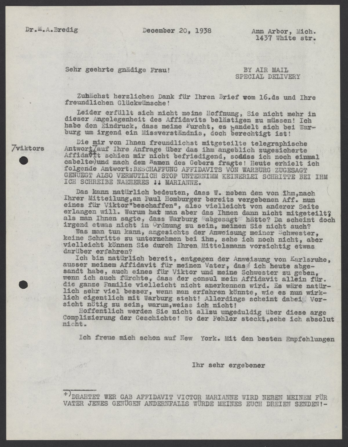 Letter from Max Bredig to Fridel G. Halstead, December 20, 1938