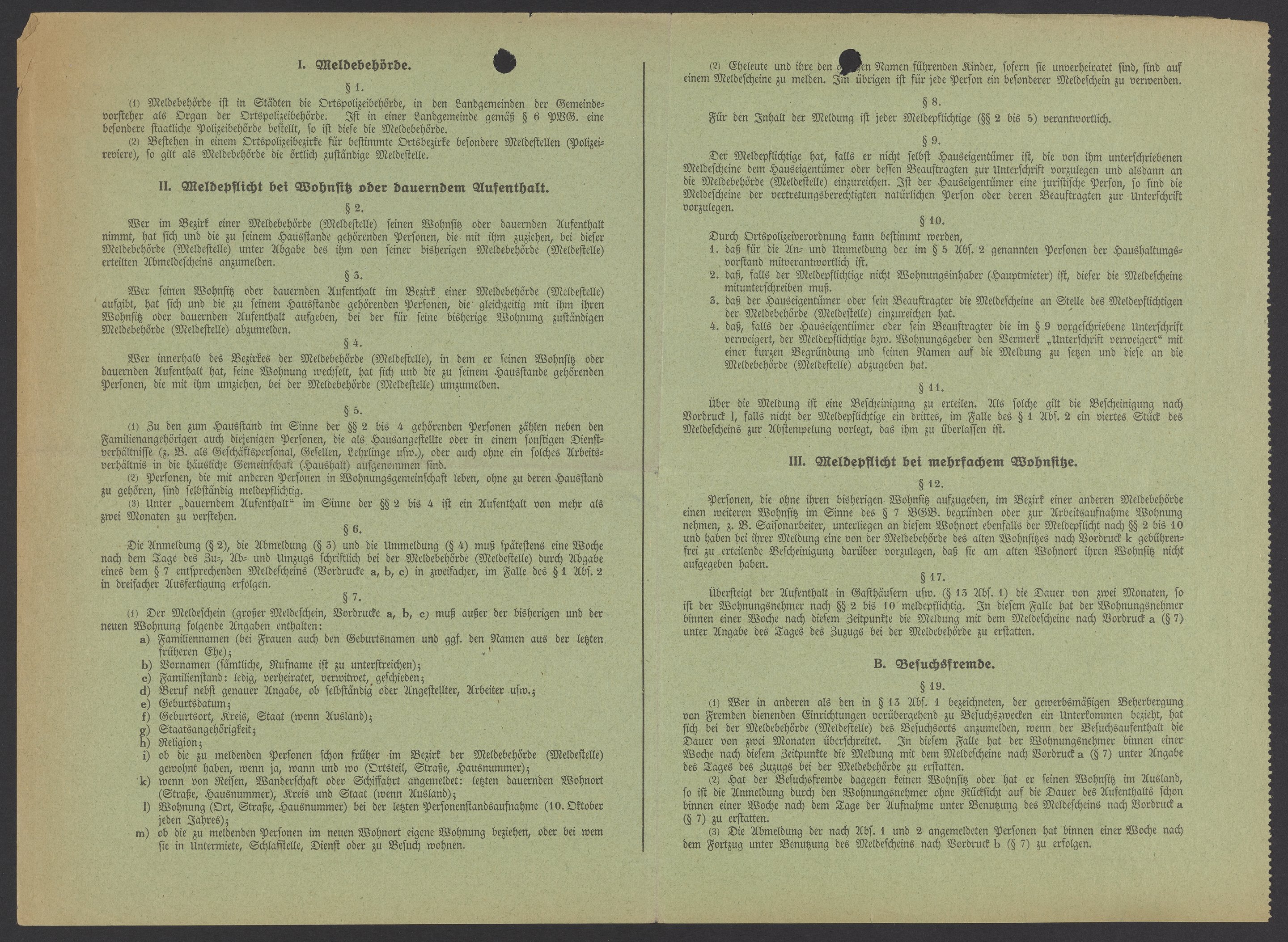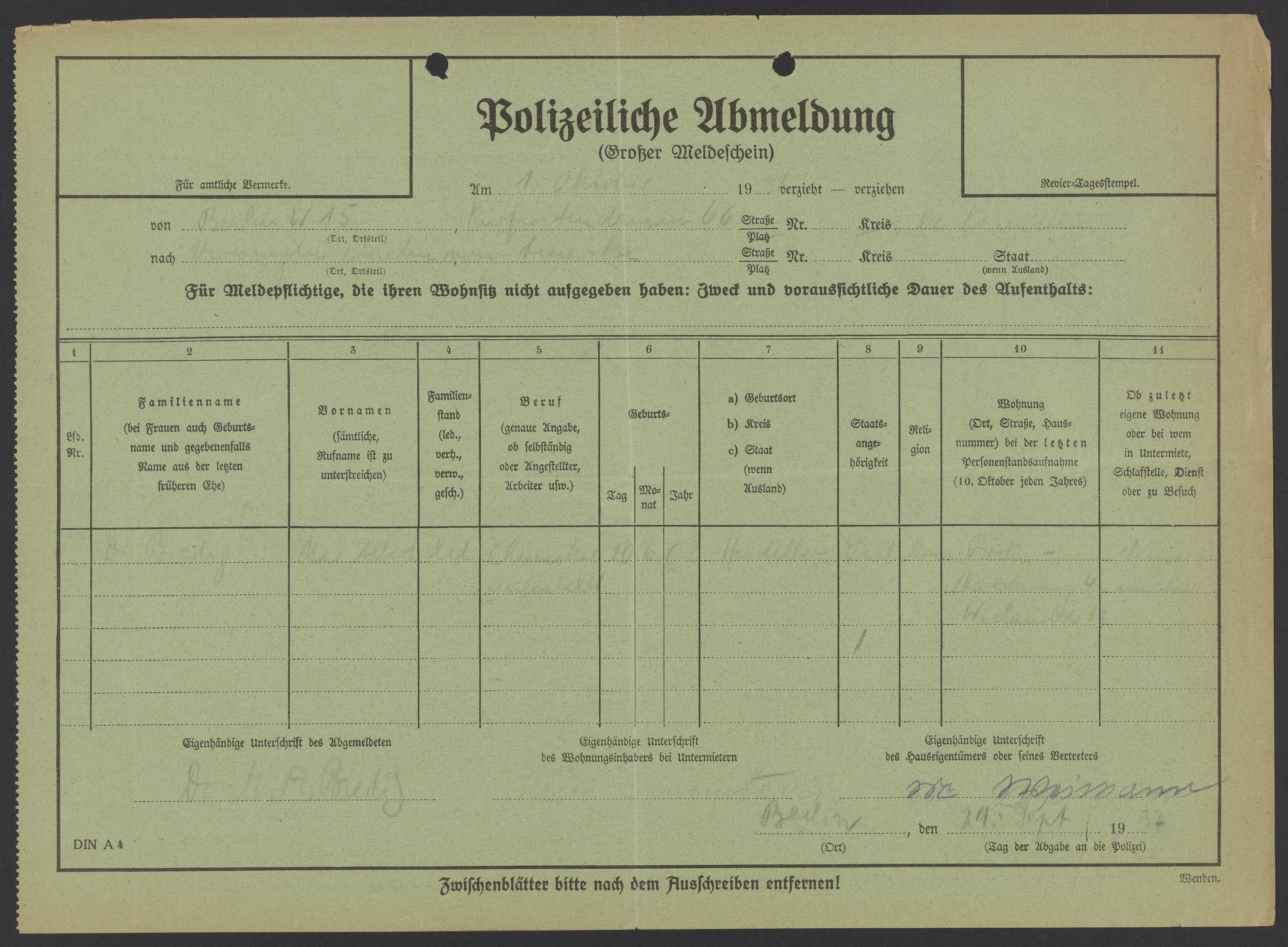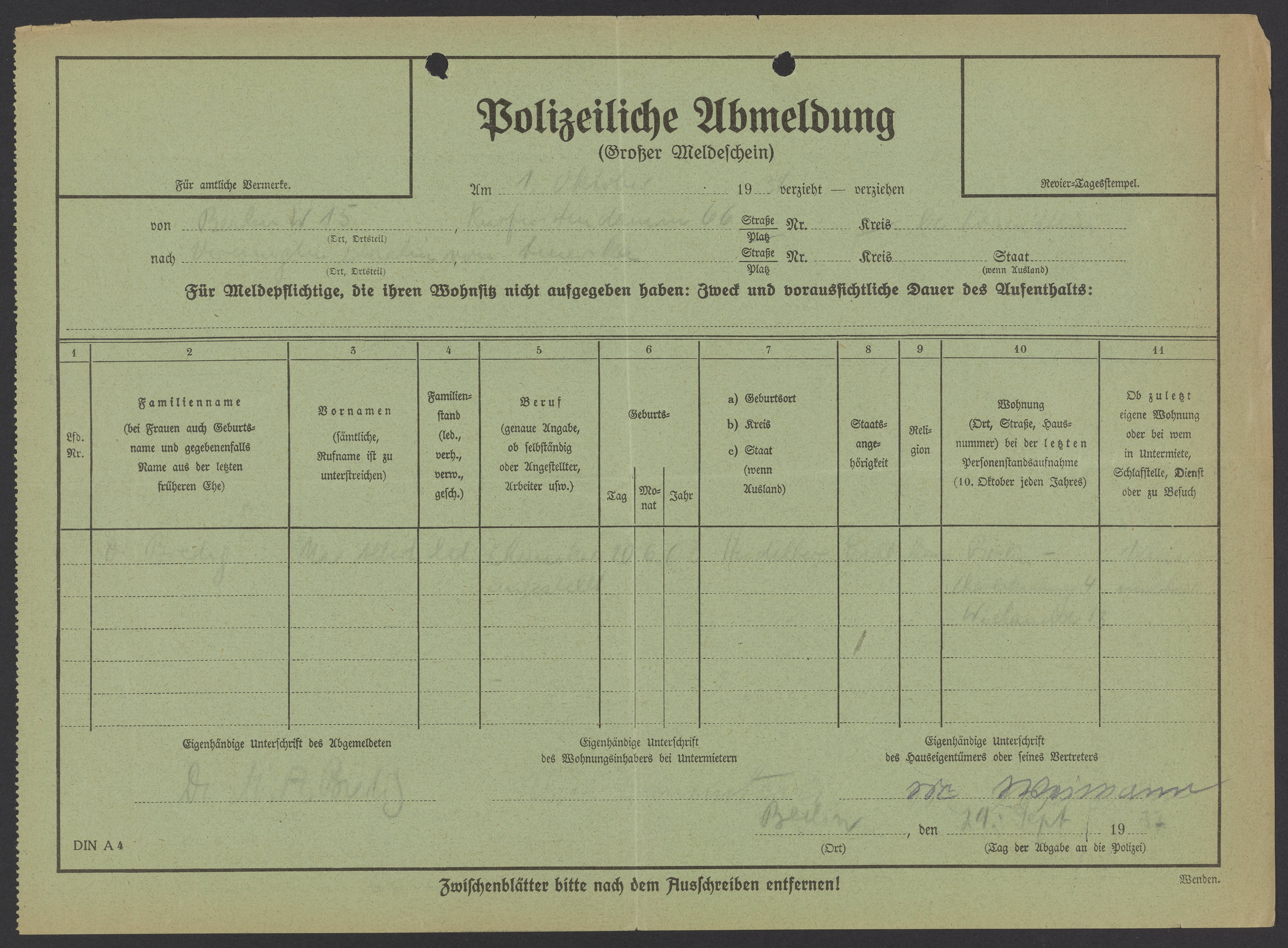 Small JPG1200 x 883px — 190 KBLarge JPG2880 x 2119px — 1.2 MBFull-sized JPG7137 x 5250px — 6.9 MBOriginal fileTIFF — 7137 x 5250px — 107 MBGerman police deregistration (notice of departure) form for Max Albert Bredig (1902-1977) from the Berlin police department. Deregistration is required to be filed when Germans move from any German city or Municipality.